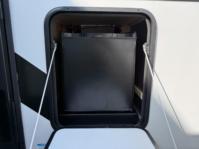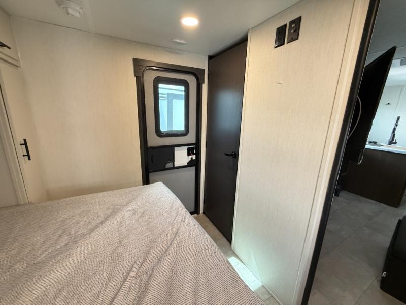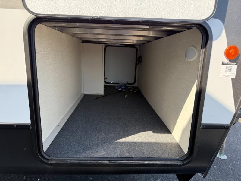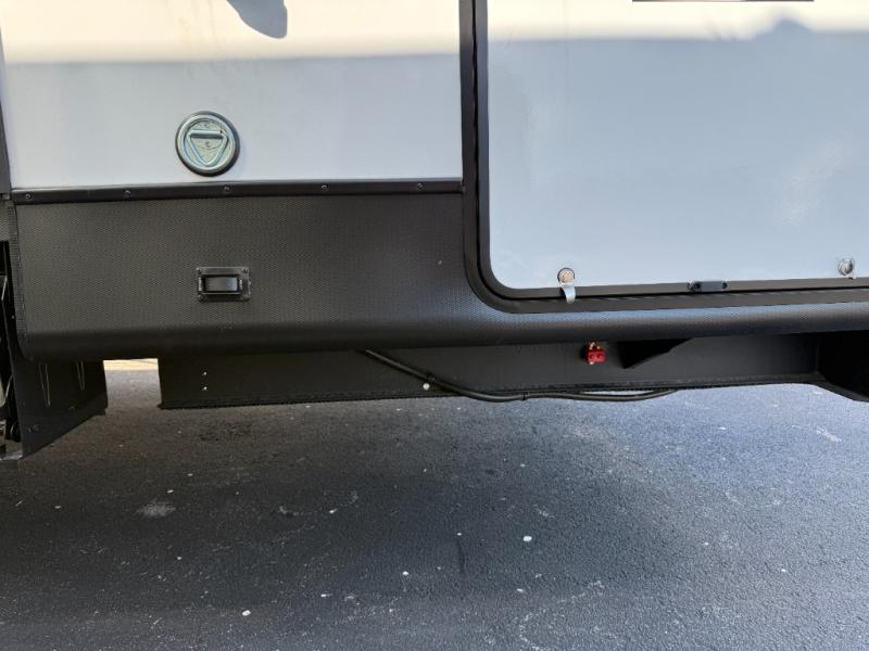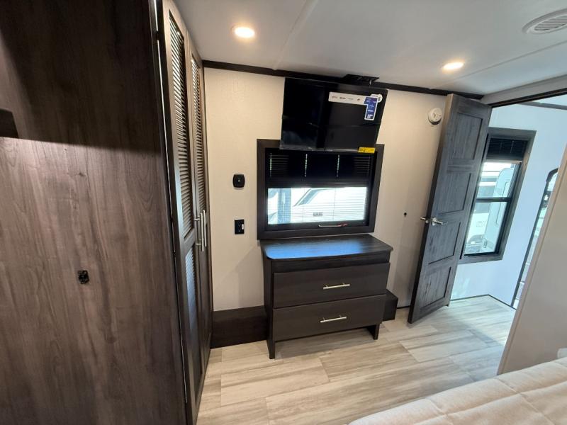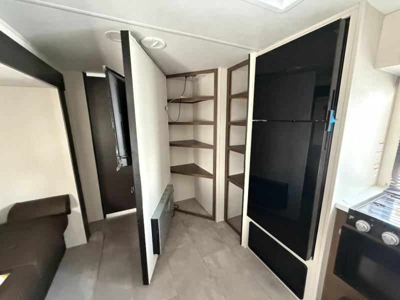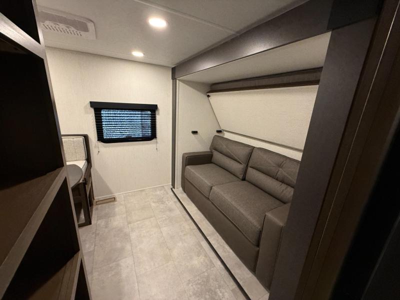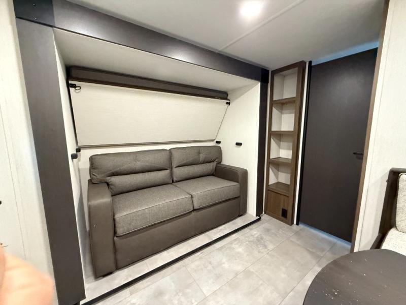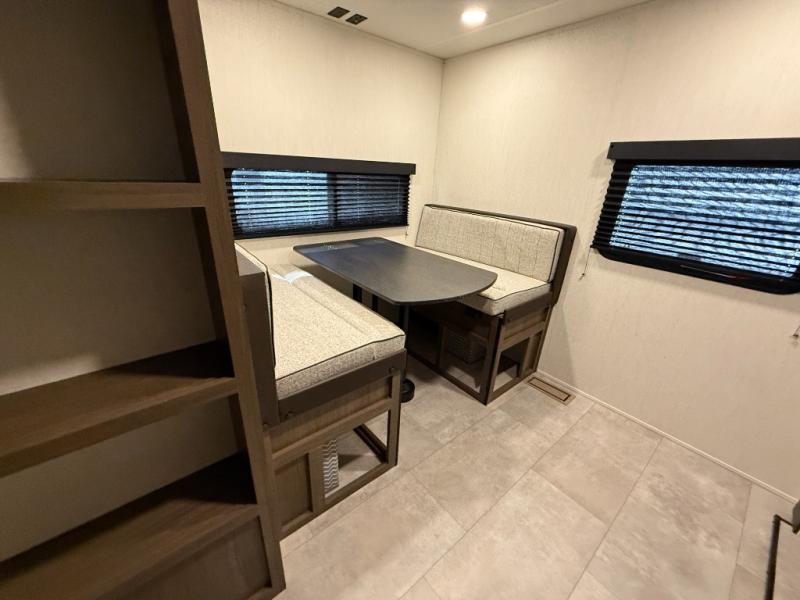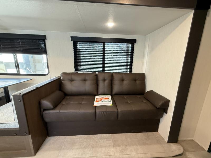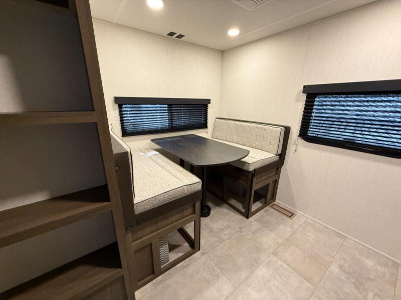 This travel trailer is the best option for a big family! The trailer boasts a spacious bunk bed above a sofa bed, providing ample sleeping space for kids and adults alike. The luxurious front king bed is a serene retreat, featuring expansive wardrobes and overhead cabinets for storing your essentials. The charming booth dinette is a cozy spot for meals or extra sleeping space, as well as the versatile jackknife sofa, which also provides additional sleeping space or a comfortable spot to relax. The sleek entertainment center is perfect for family movie nights. The well-appointed kitchen is equipped with a large fridge, convenient shelves, and a spacious pantry, making meal prep and storage an easy chore. The modern full bathroom features a well-stocked linen closet and provides a convenient space for freshening up. Plus, with two convenient entry/exit doors, this trailer offers added flexibility and ease of use, and the ample overhead cabinets provide additional storage space for your belongings.