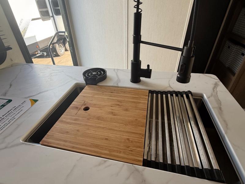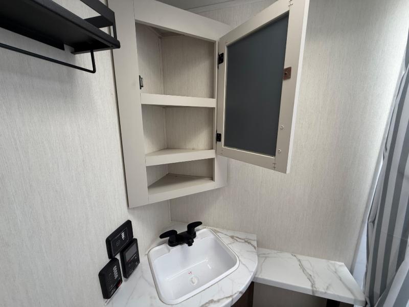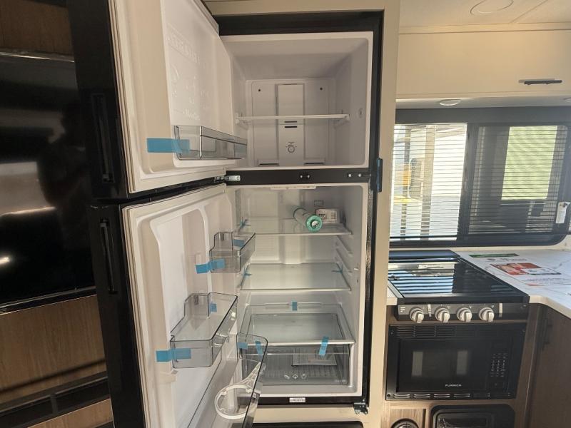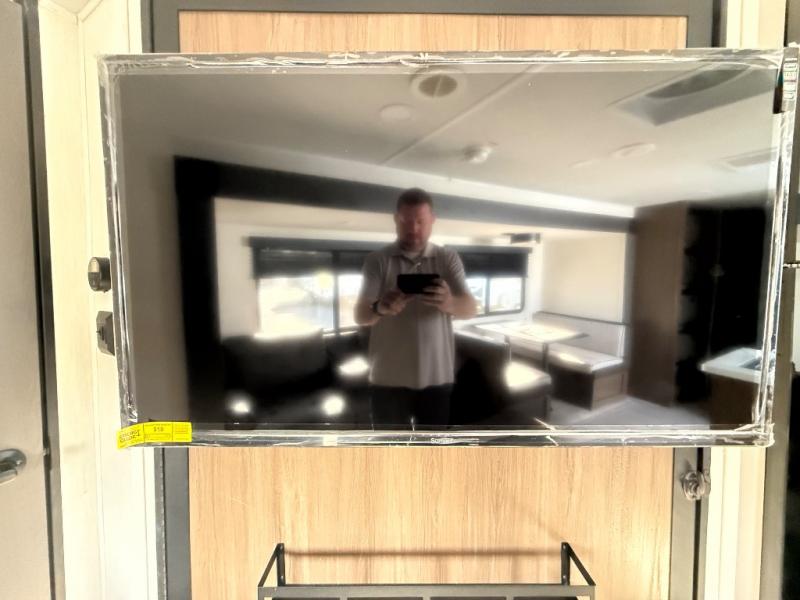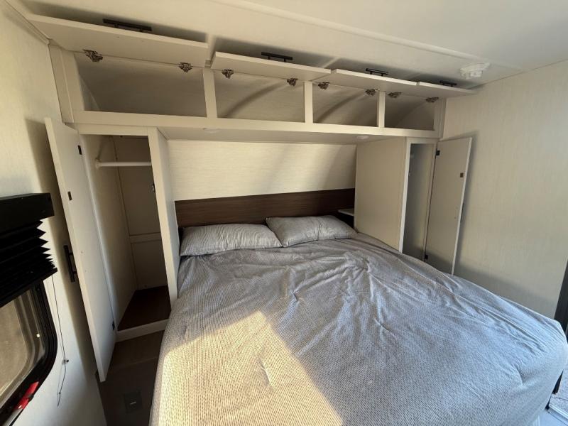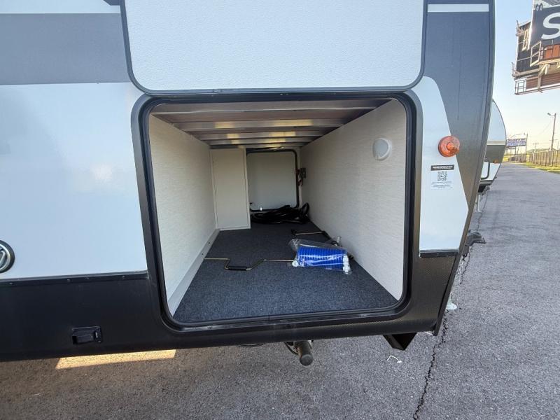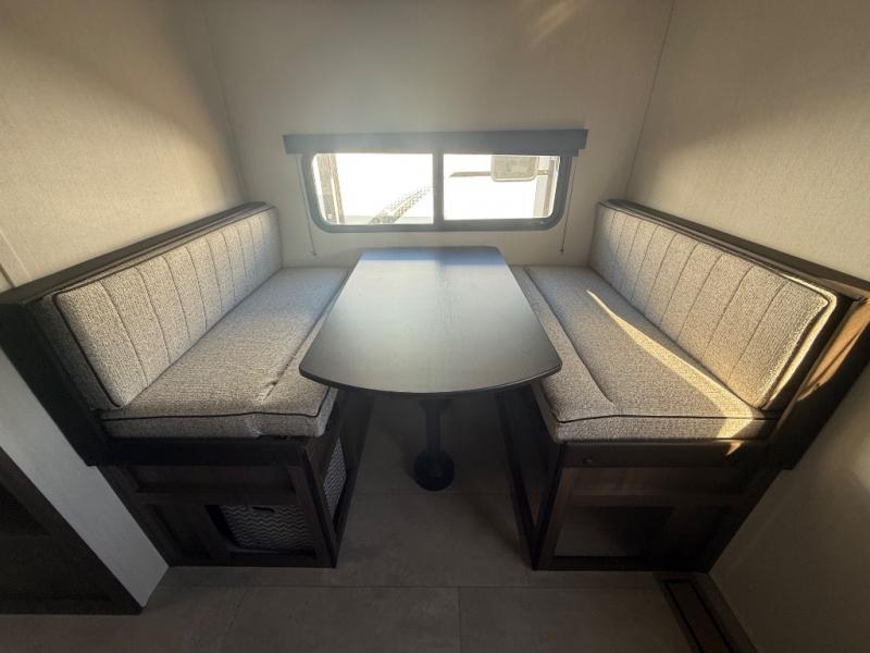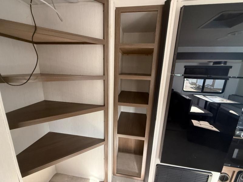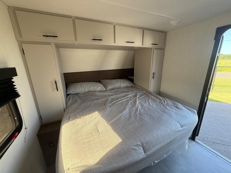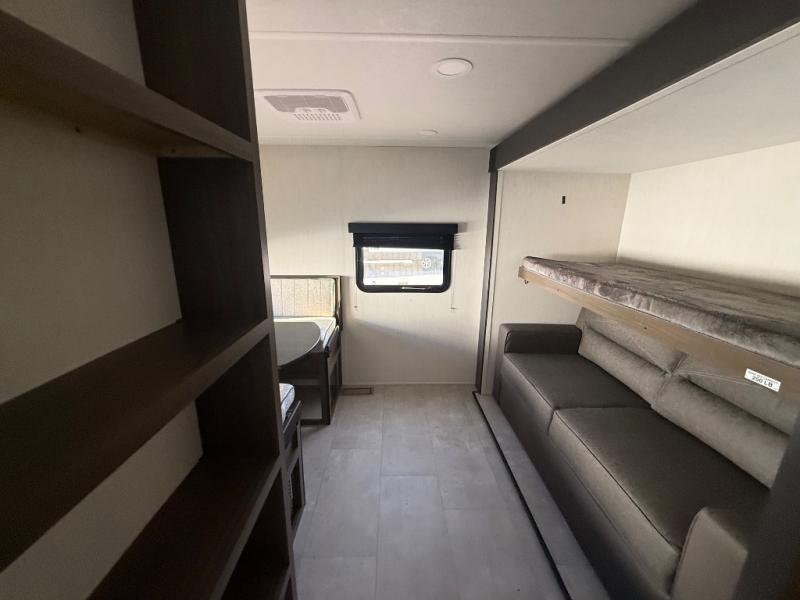 This travel trailer is the best option for a big family! The trailer boasts a spacious bunk bed above a sofa bed, providing ample sleeping space for kids and adults alike. The luxurious front king bed is a serene retreat, featuring expansive wardrobes and overhead cabinets for storing your essentials. The charming booth dinette is a cozy spot for meals or extra sleeping space, as well as the versatile jackknife sofa, which also provides additional sleeping space or a comfortable spot to relax. The sleek entertainment center is perfect for family movie nights. The well-appointed kitchen is equipped with a large fridge, convenient shelves, and a spacious pantry, making meal prep and storage an easy chore. The modern full bathroom features a well-stocked linen closet and provides a convenient space for freshening up. Plus, with two convenient entry/exit doors, this trailer offers added flexibility and ease of use, and the ample overhead cabinets provide additional storage space for your belongings.