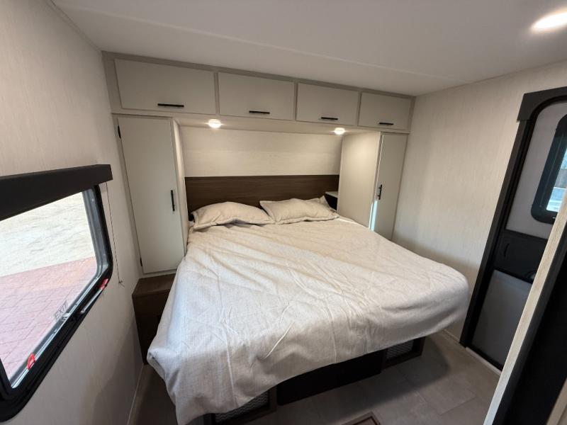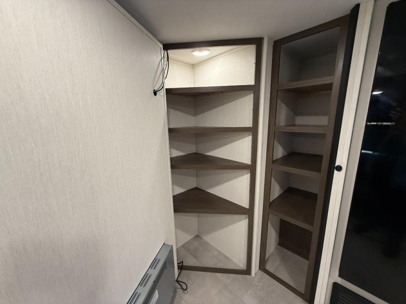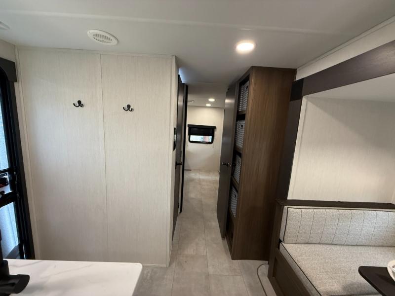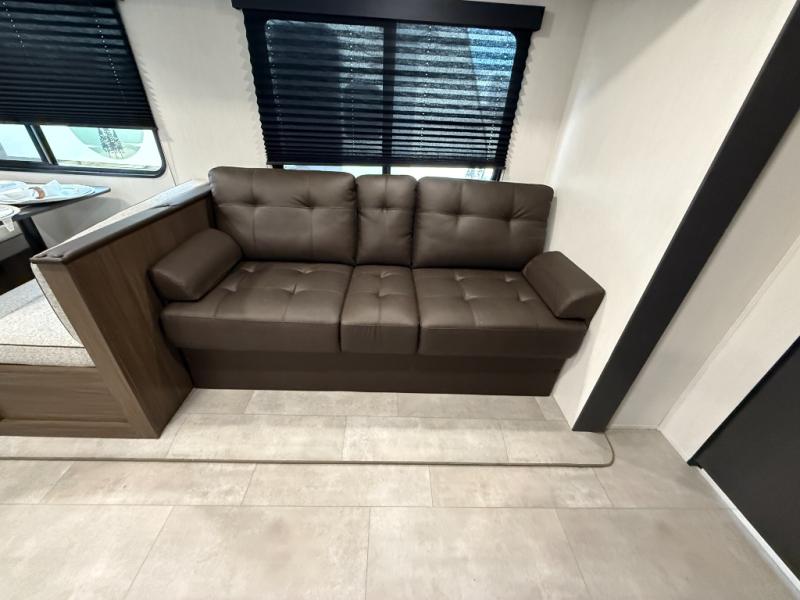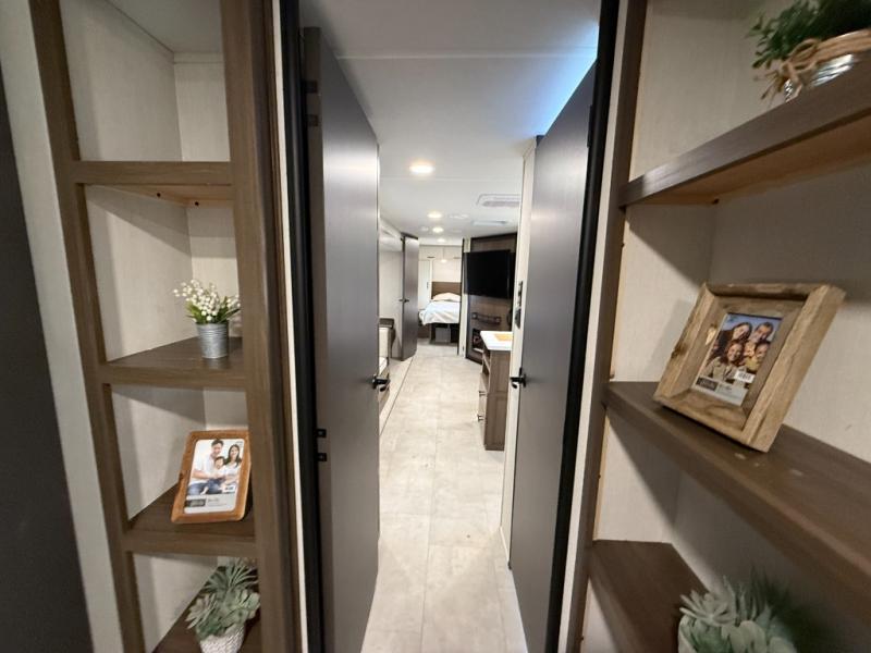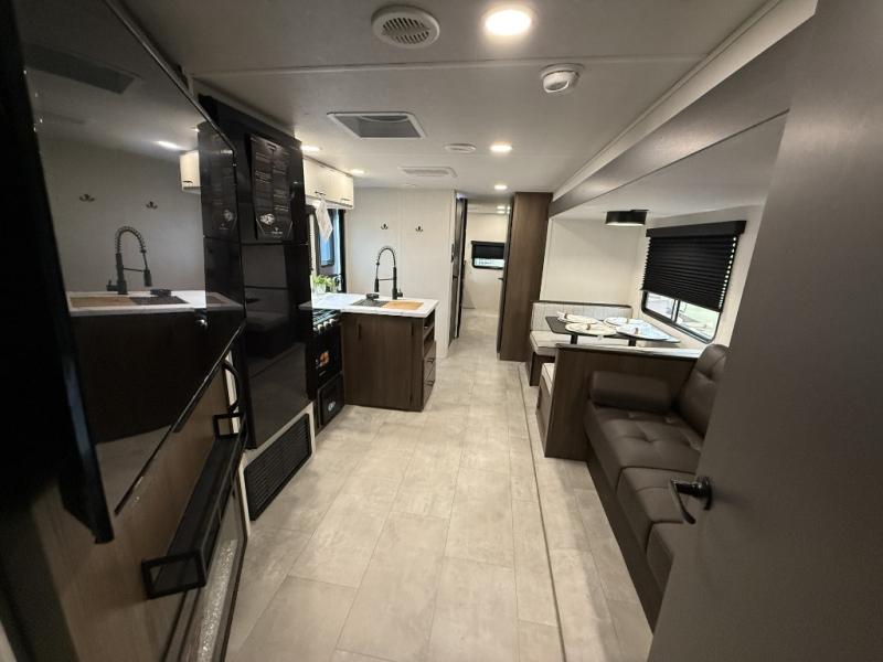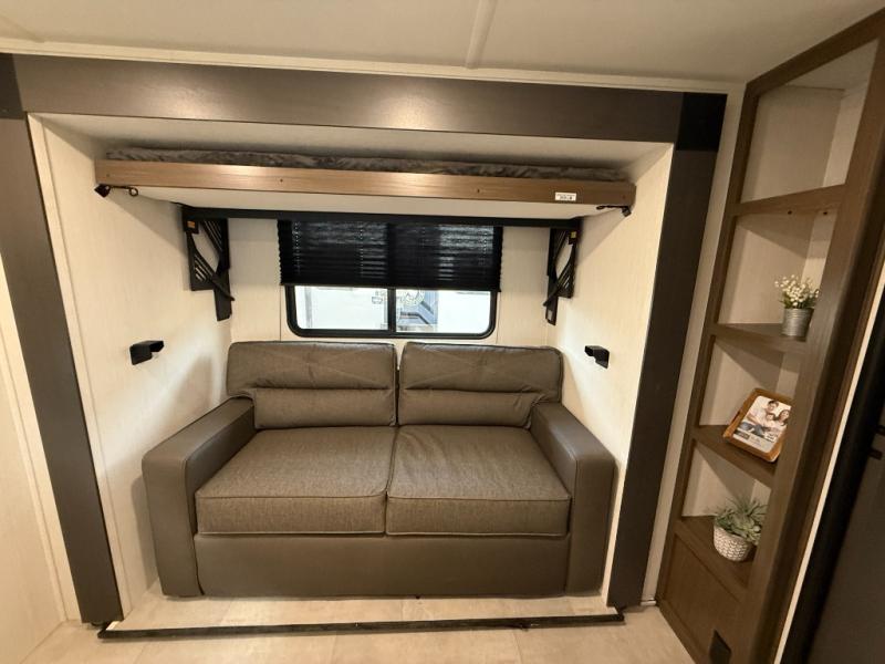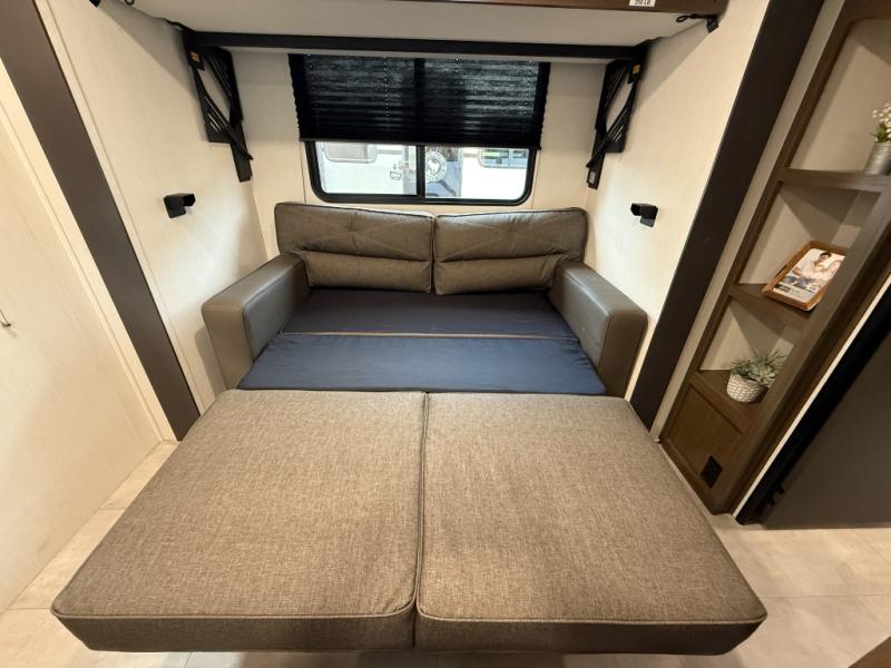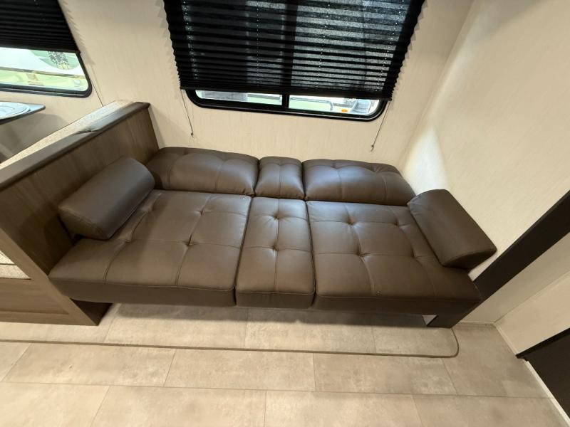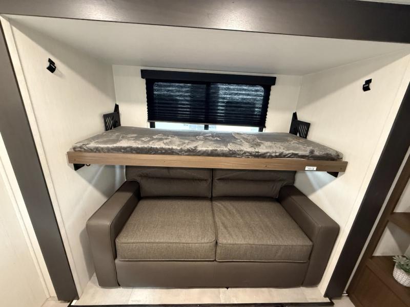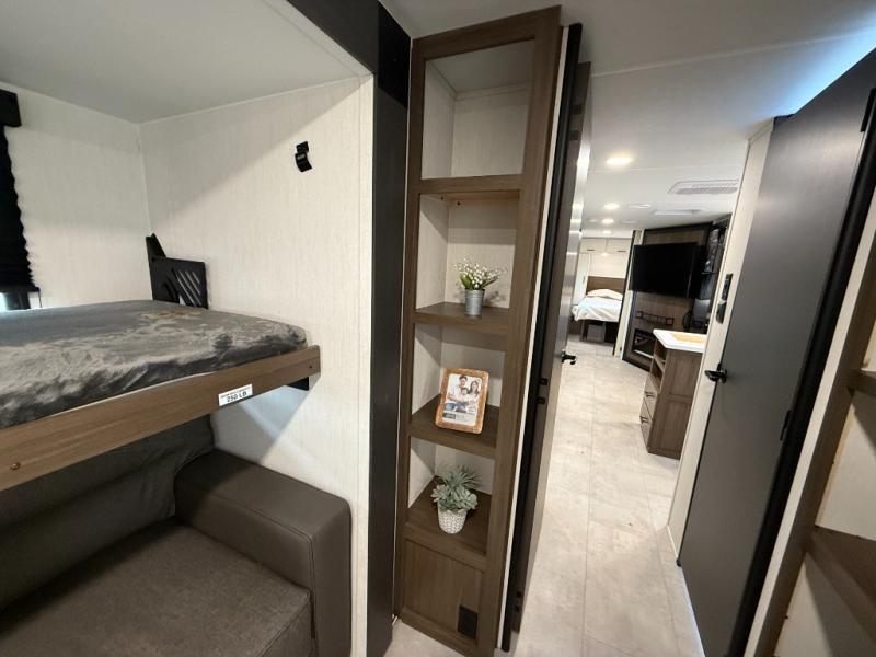 This travel trailer is the best option for a big family! The trailer boasts a spacious bunk bed above a sofa bed, providing ample sleeping space for kids and adults alike. The luxurious front king bed is a serene retreat, featuring expansive wardrobes and overhead cabinets for storing your essentials. The charming booth dinette is a cozy spot for meals or extra sleeping space, as well as the versatile jackknife sofa, which also provides additional sleeping space or a comfortable spot to relax. The sleek entertainment center is perfect for family movie nights. The well-appointed kitchen is equipped with a large fridge, convenient shelves, and a spacious pantry, making meal prep and storage an easy chore. The modern full bathroom features a well-stocked medicine cabinet. Plus, with two convenient entry/exit doors, this trailer offers added flexibility and ease of use, and the ample overhead cabinets provide additional storage space for your belongings.