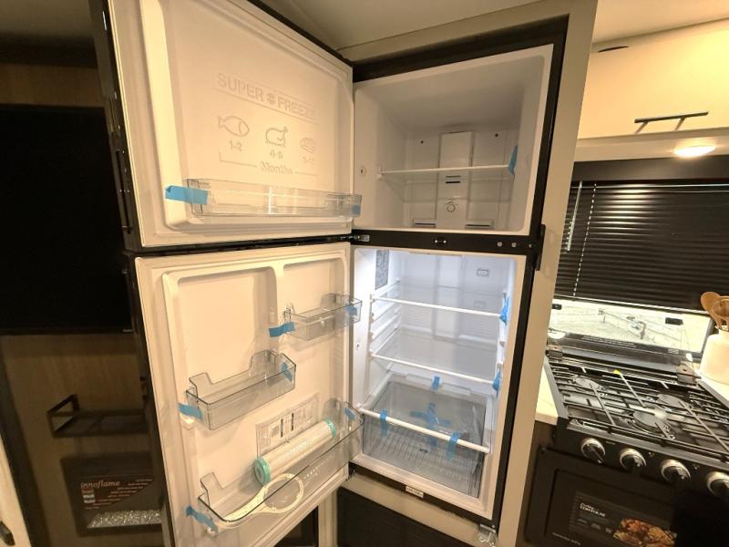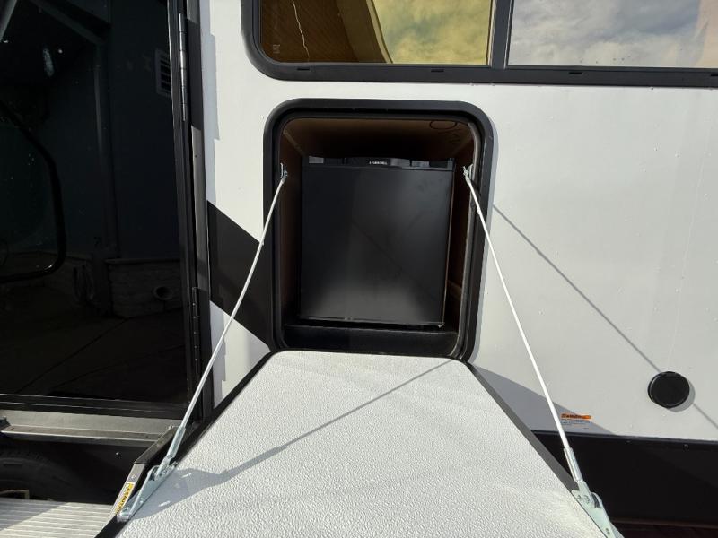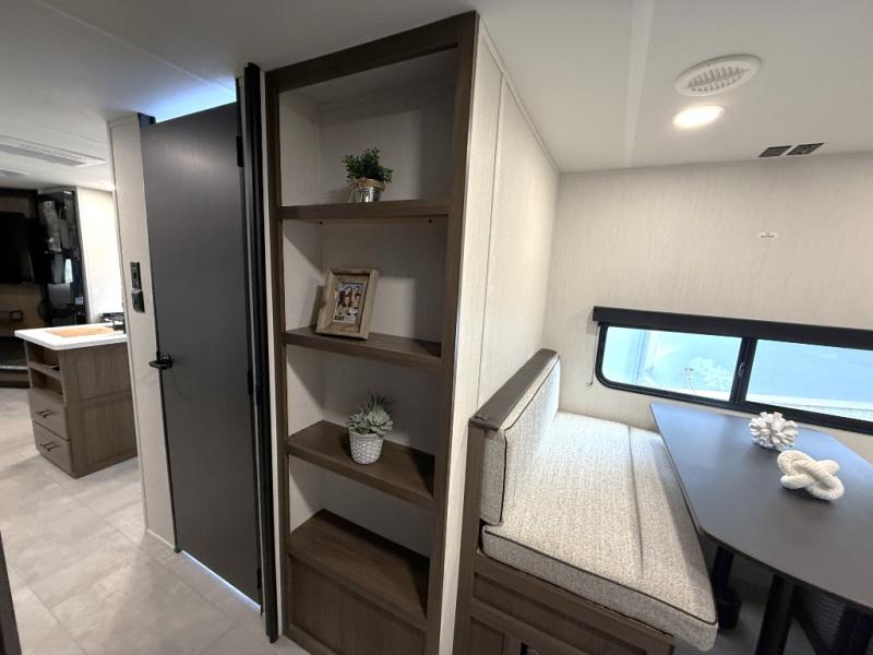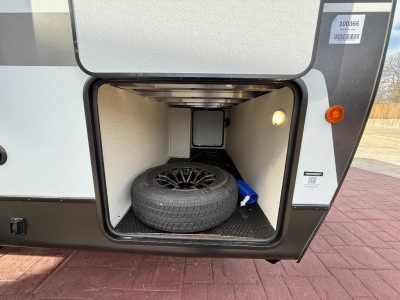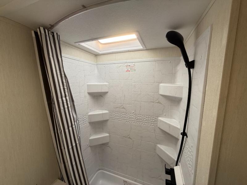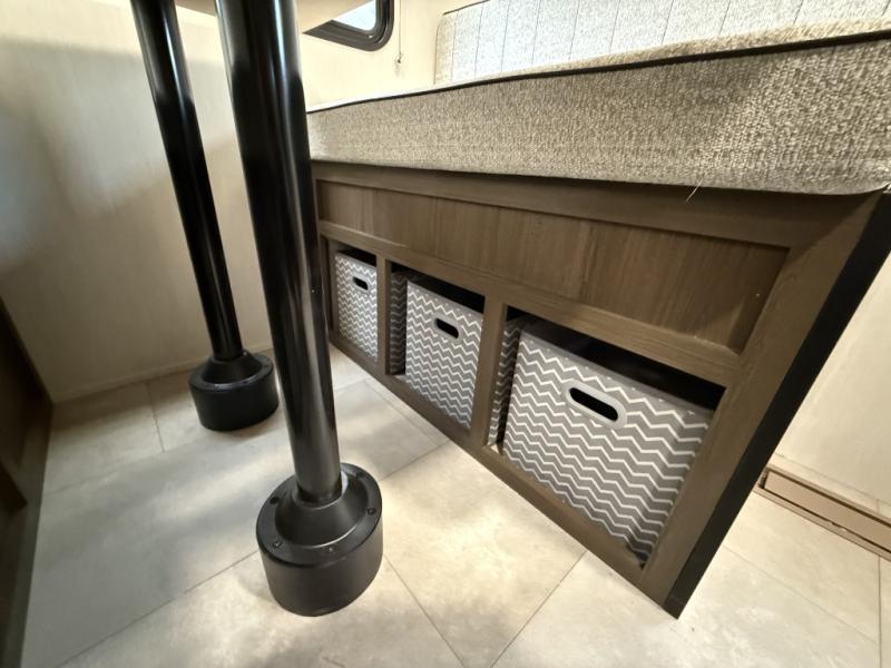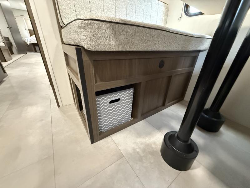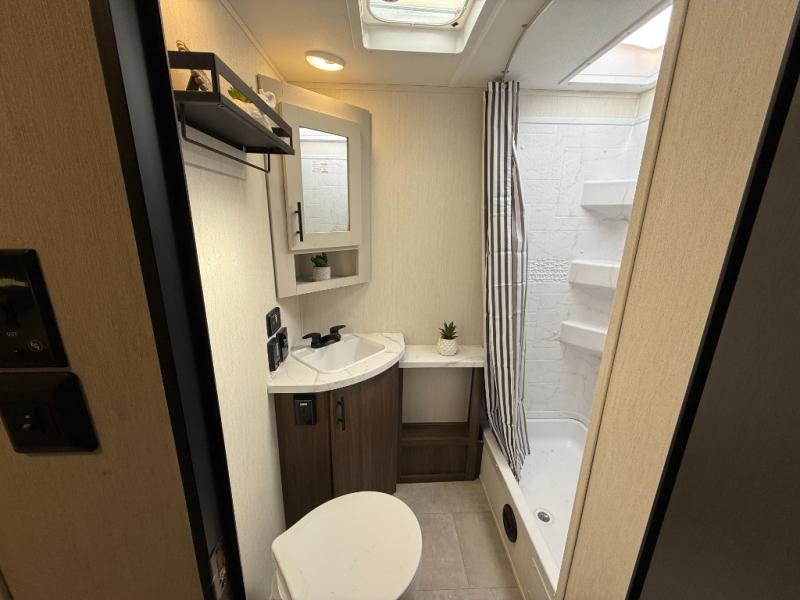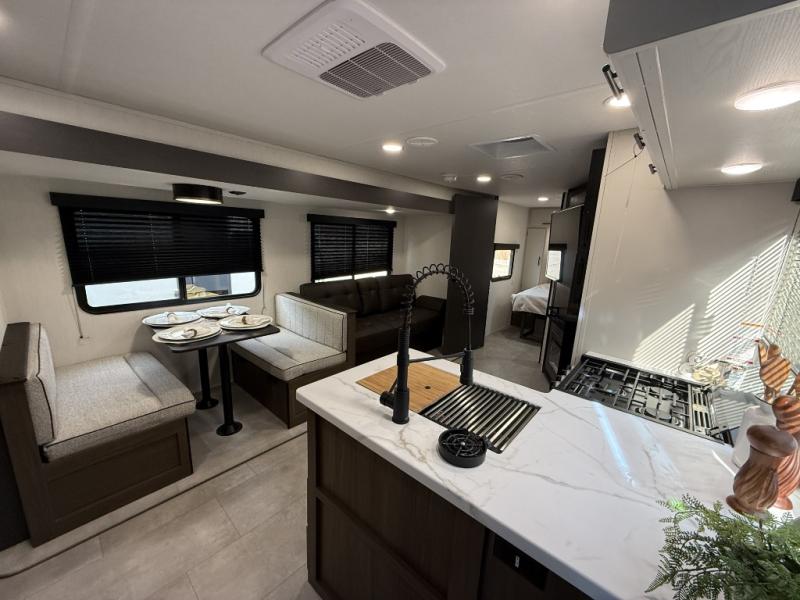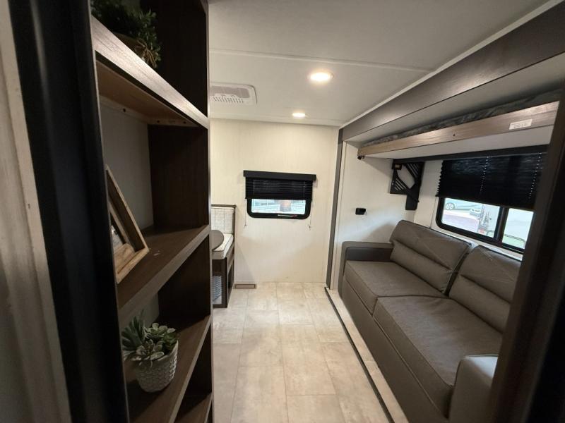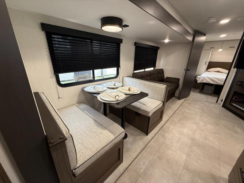 This travel trailer is the best option for a big family! The trailer boasts a spacious bunk bed above a sofa bed, providing ample sleeping space for kids and adults alike. The luxurious front king bed is a serene retreat, featuring expansive wardrobes and overhead cabinets for storing your essentials. The charming booth dinette is a cozy spot for meals or extra sleeping space, as well as the versatile jackknife sofa, which also provides additional sleeping space or a comfortable spot to relax. The sleek entertainment center is perfect for family movie nights. The well-appointed kitchen is equipped with a large fridge, convenient shelves, and a spacious pantry, making meal prep and storage an easy chore. The modern full bathroom features a well-stocked medicine cabinet. Plus, with two convenient entry/exit doors, this trailer offers added flexibility and ease of use, and the ample overhead cabinets provide additional storage space for your belongings.
