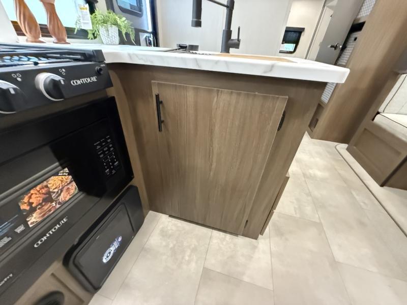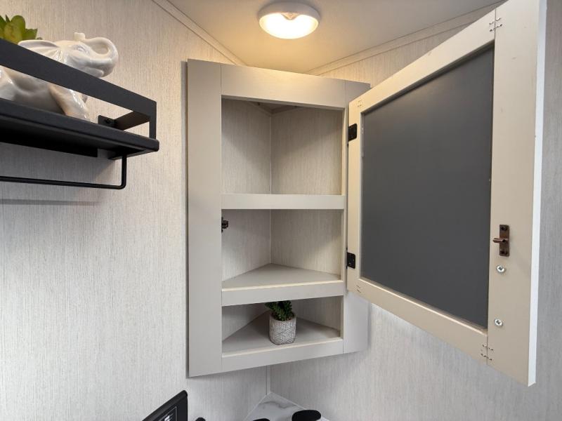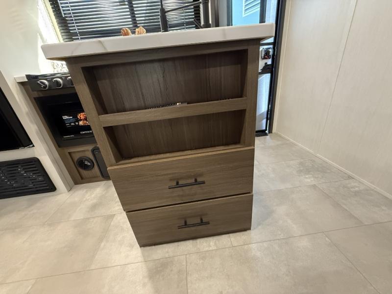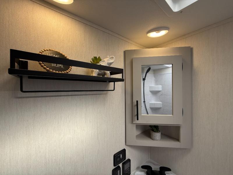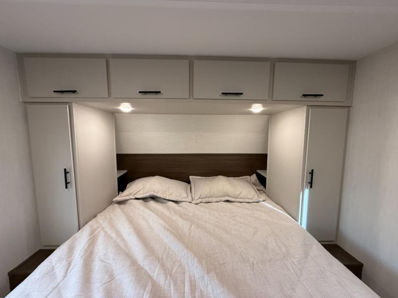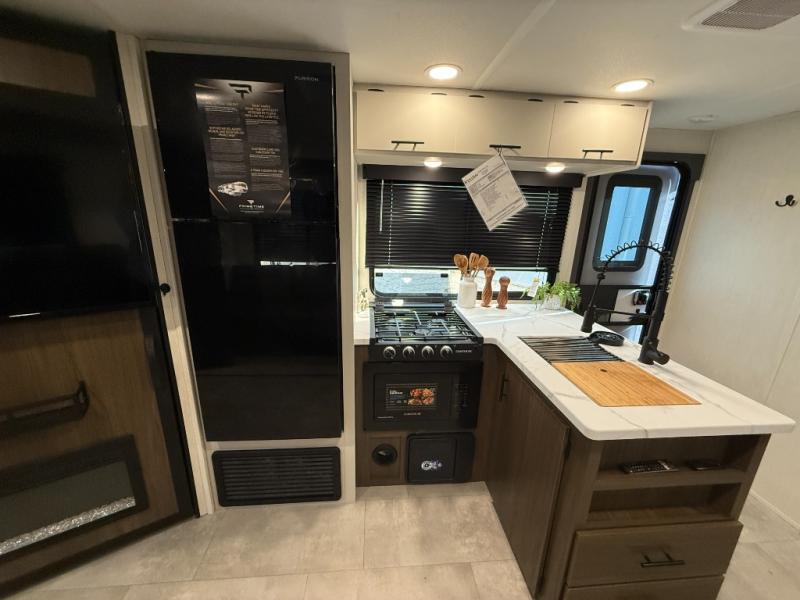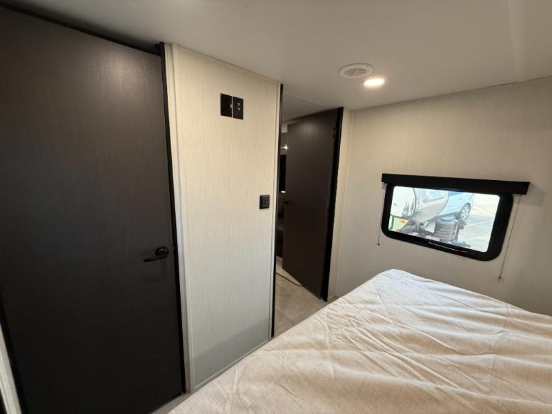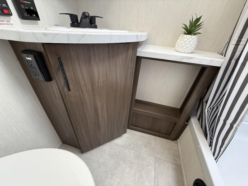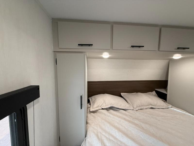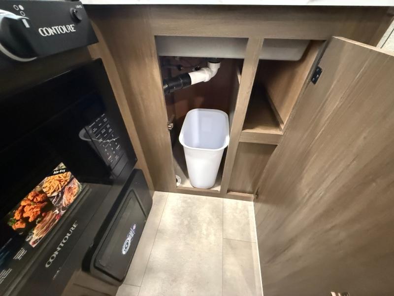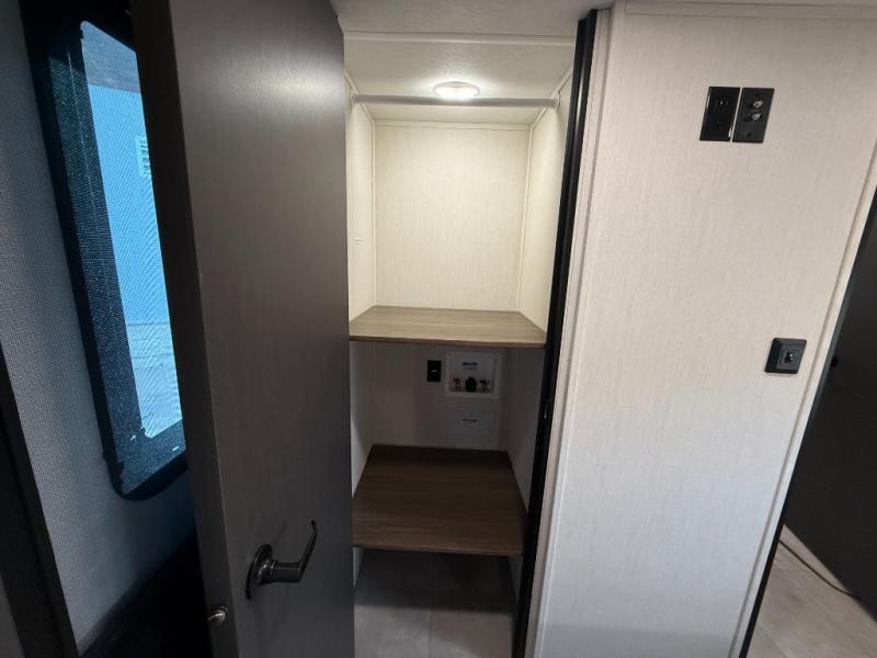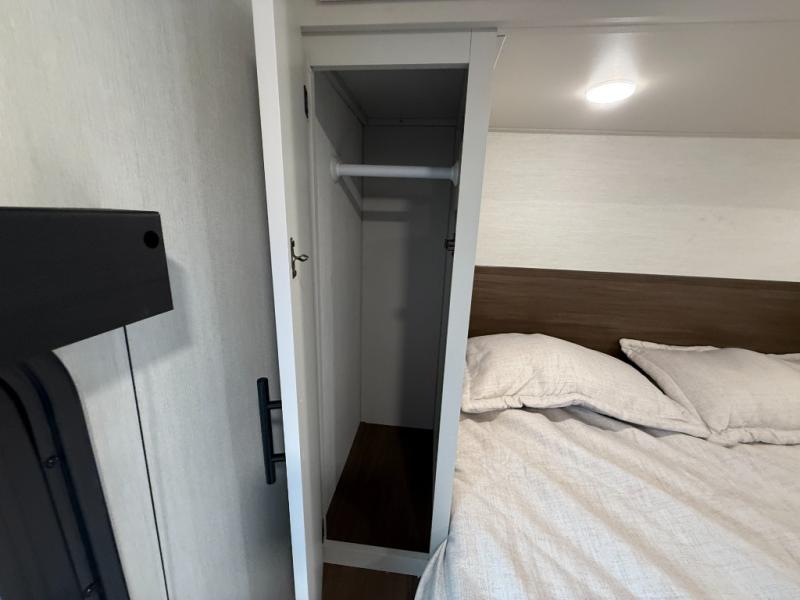 This travel trailer is the best option for a big family! The trailer boasts a spacious bunk bed above a sofa bed, providing ample sleeping space for kids and adults alike. The luxurious front king bed is a serene retreat, featuring expansive wardrobes and overhead cabinets for storing your essentials. The charming booth dinette is a cozy spot for meals or extra sleeping space, as well as the versatile jackknife sofa, which also provides additional sleeping space or a comfortable spot to relax. The sleek entertainment center is perfect for family movie nights. The well-appointed kitchen is equipped with a large fridge, convenient shelves, and a spacious pantry, making meal prep and storage an easy chore. The modern full bathroom features a well-stocked medicine cabinet. Plus, with two convenient entry/exit doors, this trailer offers added flexibility and ease of use, and the ample overhead cabinets provide additional storage space for your belongings.