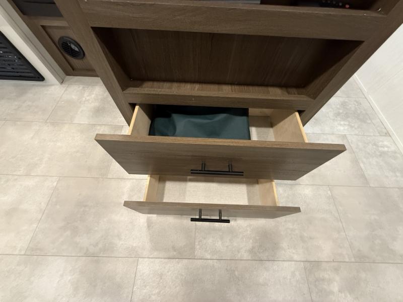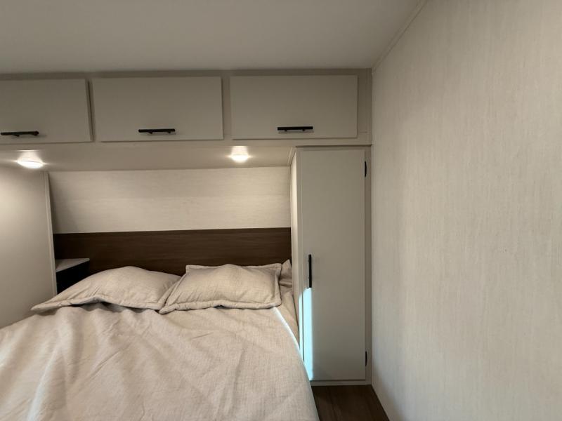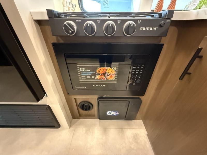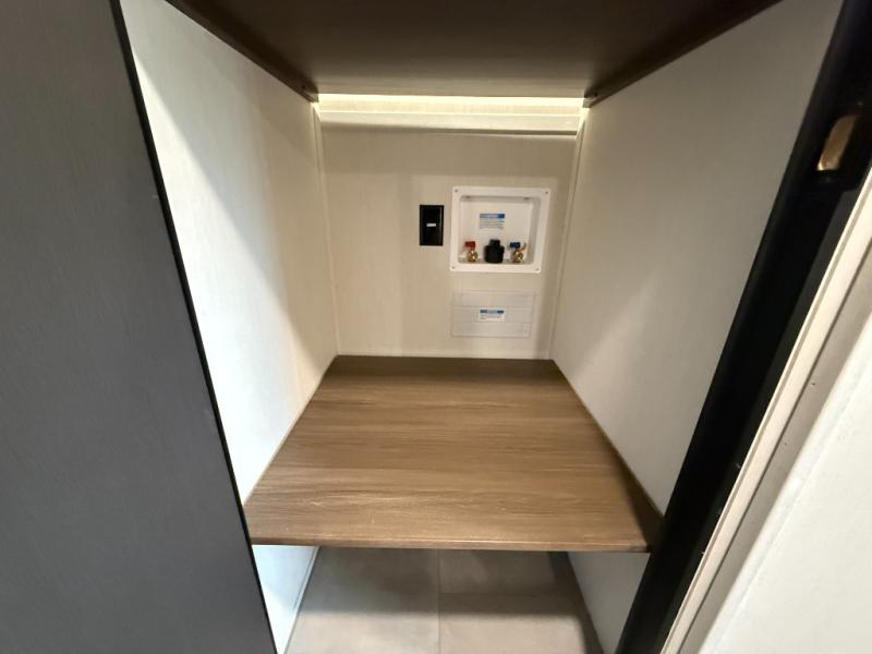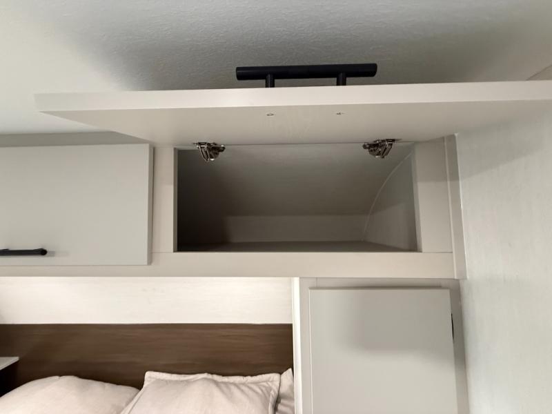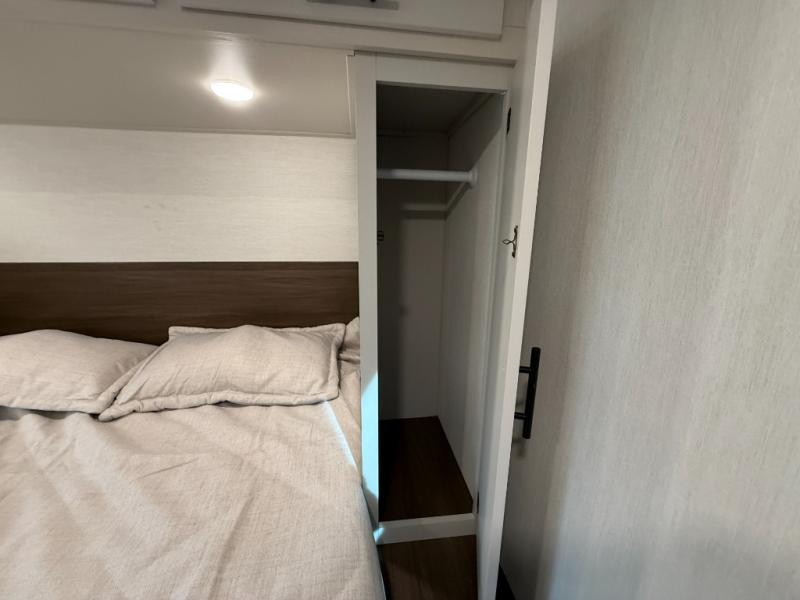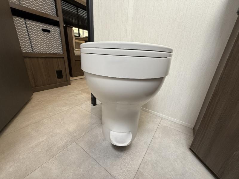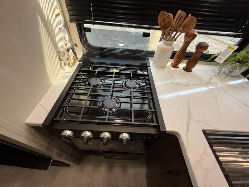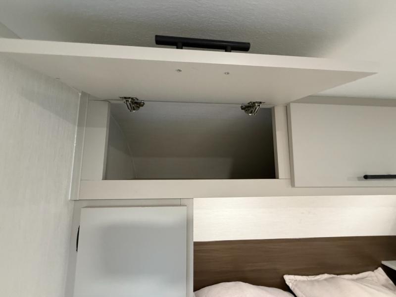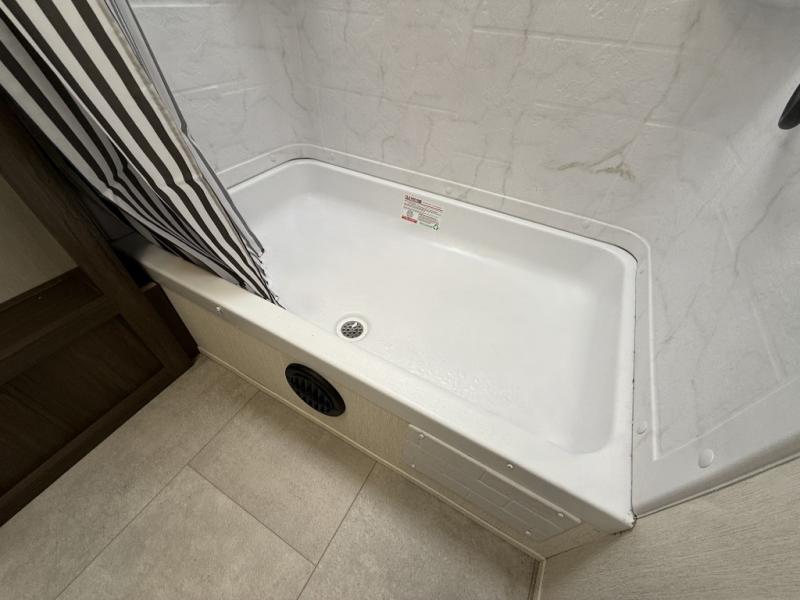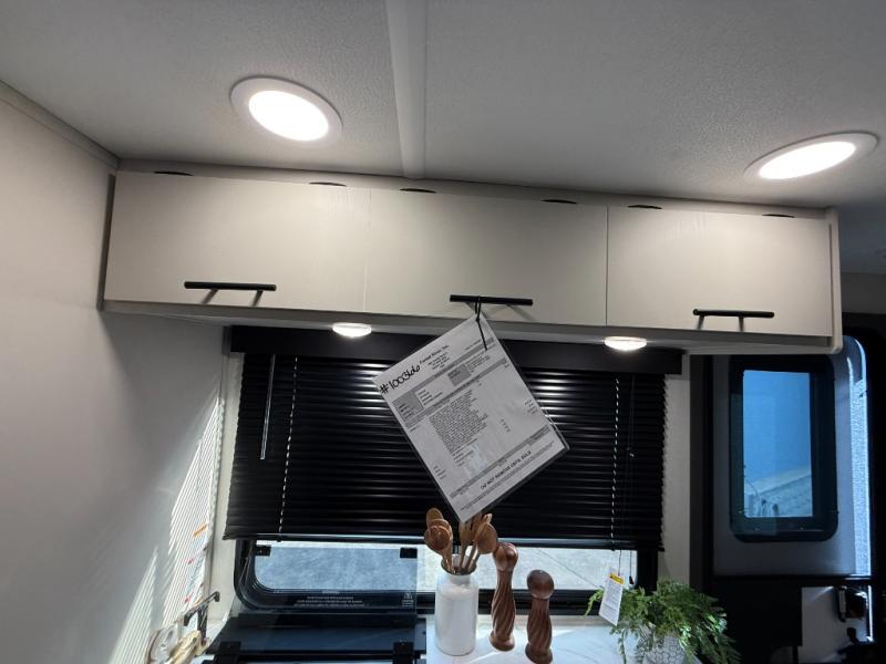 This travel trailer is the best option for a big family! The trailer boasts a spacious bunk bed above a sofa bed, providing ample sleeping space for kids and adults alike. The luxurious front king bed is a serene retreat, featuring expansive wardrobes and overhead cabinets for storing your essentials. The charming booth dinette is a cozy spot for meals or extra sleeping space, as well as the versatile jackknife sofa, which also provides additional sleeping space or a comfortable spot to relax. The sleek entertainment center is perfect for family movie nights. The well-appointed kitchen is equipped with a large fridge, convenient shelves, and a spacious pantry, making meal prep and storage an easy chore. The modern full bathroom features a well-stocked medicine cabinet. Plus, with two convenient entry/exit doors, this trailer offers added flexibility and ease of use, and the ample overhead cabinets provide additional storage space for your belongings.