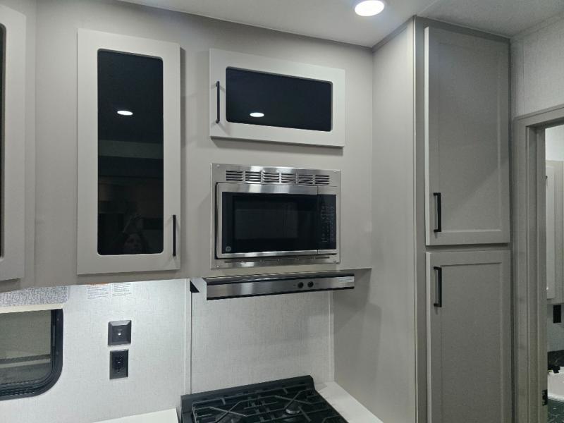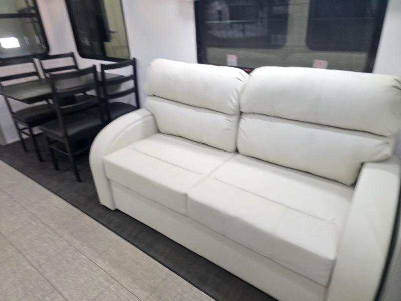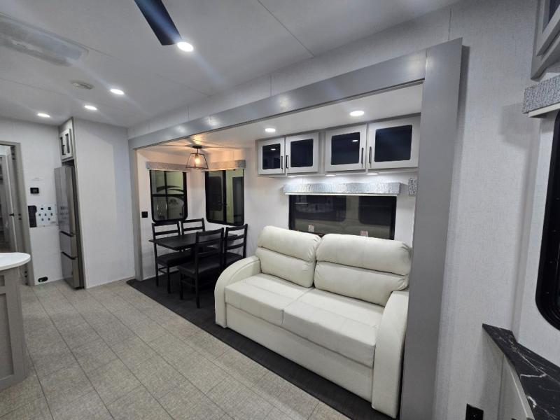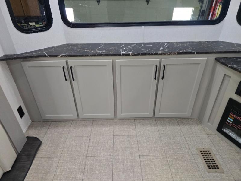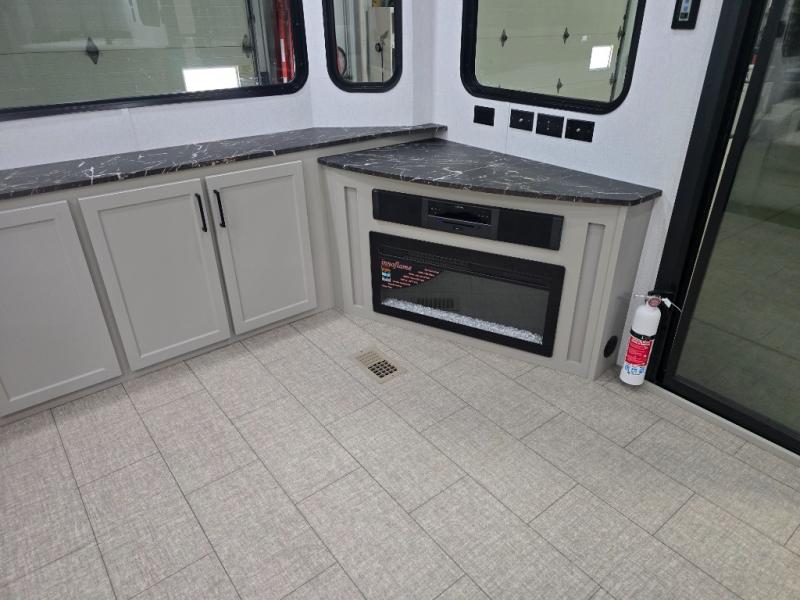 You'll love every minute spent in this double slide out, double entry destination trailer. The front living room includes front windows, an entertainment center with a fireplace, plus a large slide out with a sofa and dinette with chairs on one side and bench seating on the other. The full kitchen with a four-burner cooktop will let you make meals each day, and there is a refrigerator and pantry for food storage. There is also a spacious walk-thru bath and a rear bedroom with a bed slide out, dresser, ceiling fan and rear walk-in closet for clothes, shoes and more!