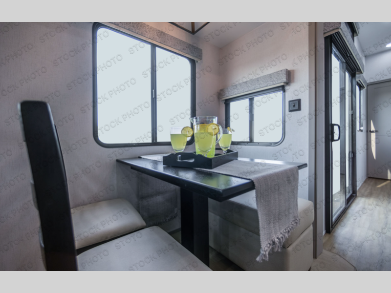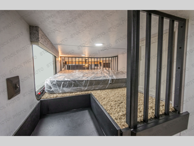 This destination trailer with a large loft and dual entry doors will be perfect for your larger group! You can wake up each day in your rear bedroom on the bed slide out, then grab your clothes from the large wardrobe and freshen up in the middle full bath. Your guests or little ones will find stairs that lead to the large loft with two beds on one side and a single bed on the other, and there is storage space here as well! Back on the main level, you'll find the combined kitchen and living area to be a favorite place to hang out. There are two sofas, an entertainment center with a fireplace and hidden storage behind, plus a kitchen island for more dinner prep space. And a dinette with two chairs on one side and bench seating on the other provides a place to dine together each day.