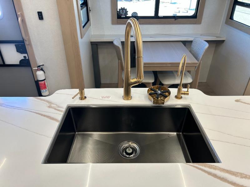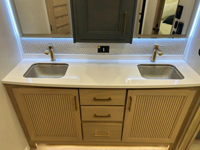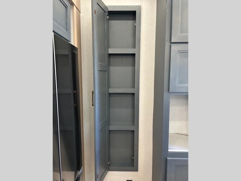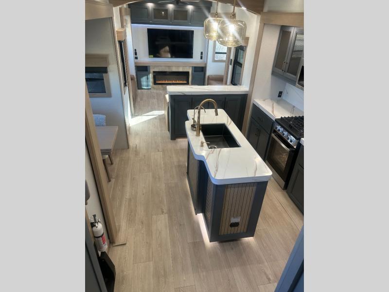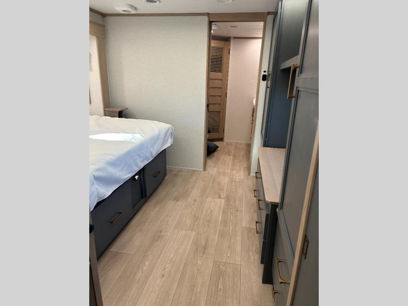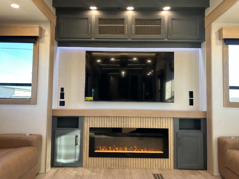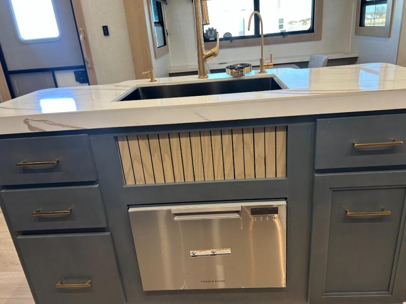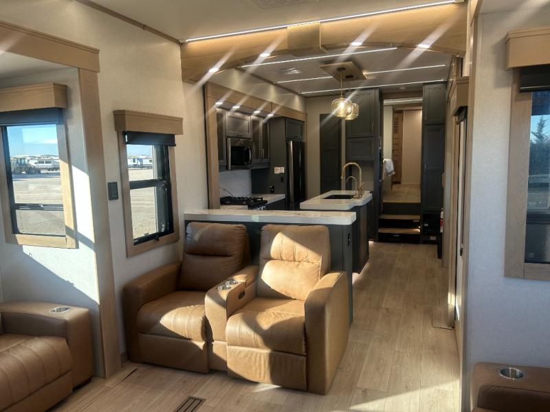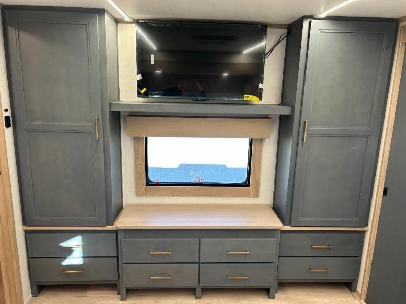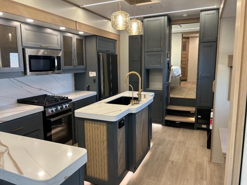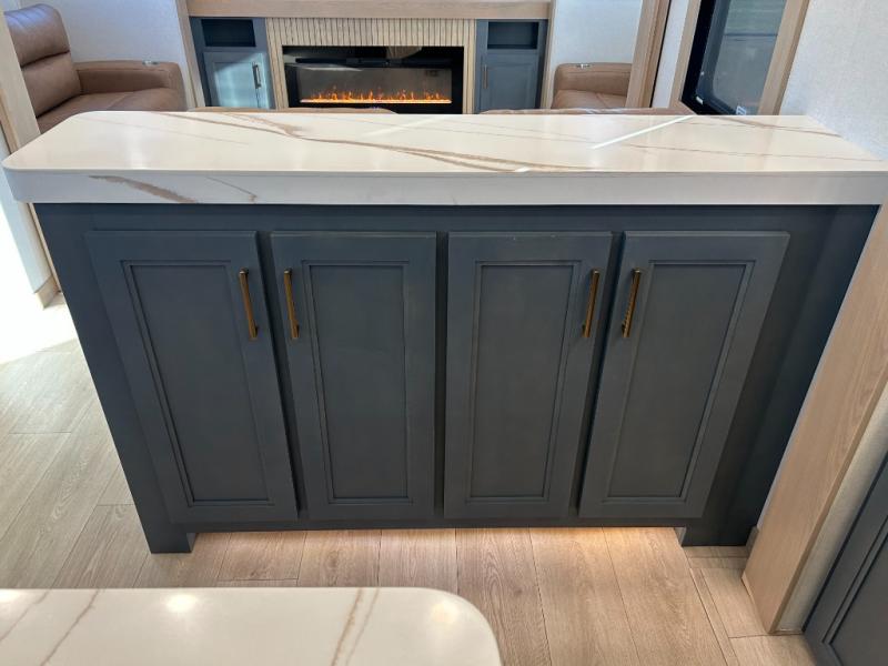 This Redwood fifth wheel is going to make you say wow! The rear living room is fully impressive with its 72" tri-fold sofa slides that are across from one another, its 60" theater sofa, entertainment center with 65" TV, and its ceiling fan. All in all, it will feel like you're lounging back at home. The kitchen is also completely decked out with opposing slides, a pull-out waste basket at the large island, two buffets, a pantry, and a message center, and just a few steps away from the kitchen is where you will find the luxurious master suite. This space has a full bathroom up at the front where you will find a huge walk-in closet, and within the bedroom, the king bed slide rests across from the 39" TV so that you can watch a movie in comfort.