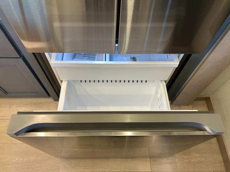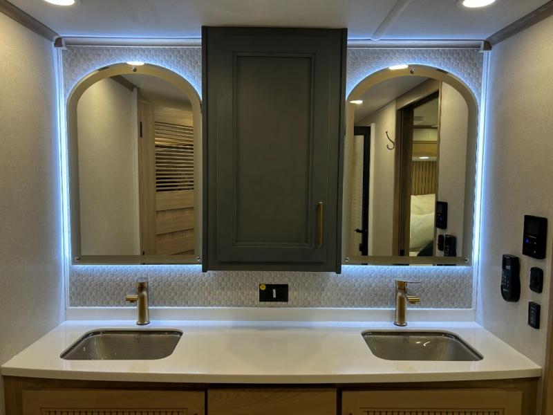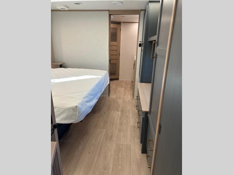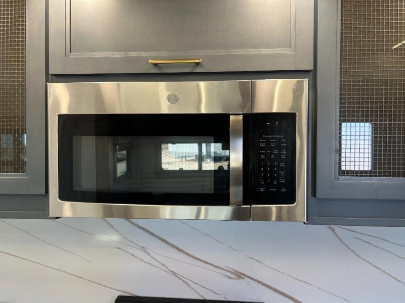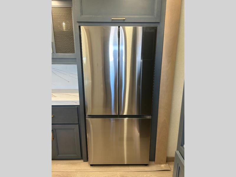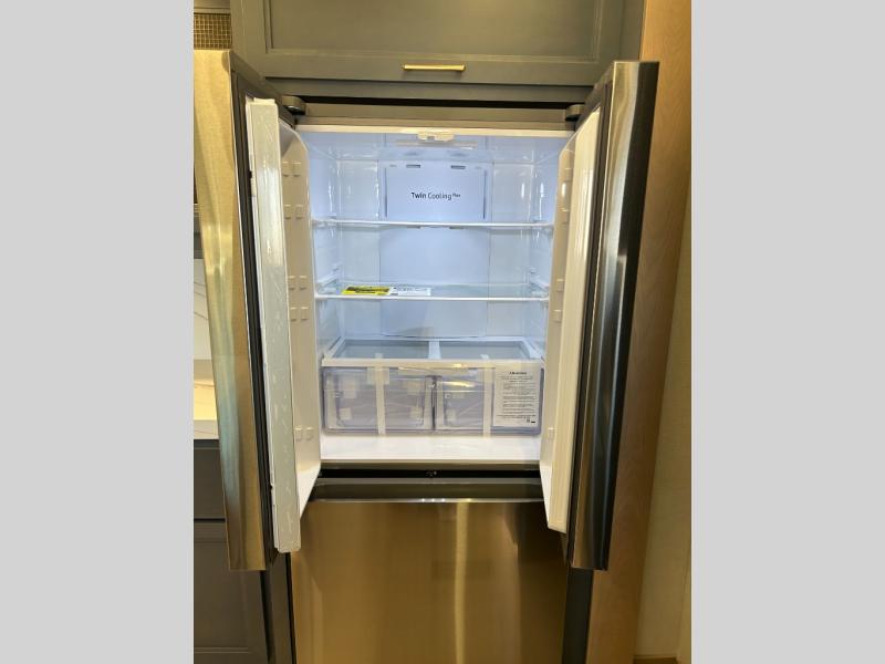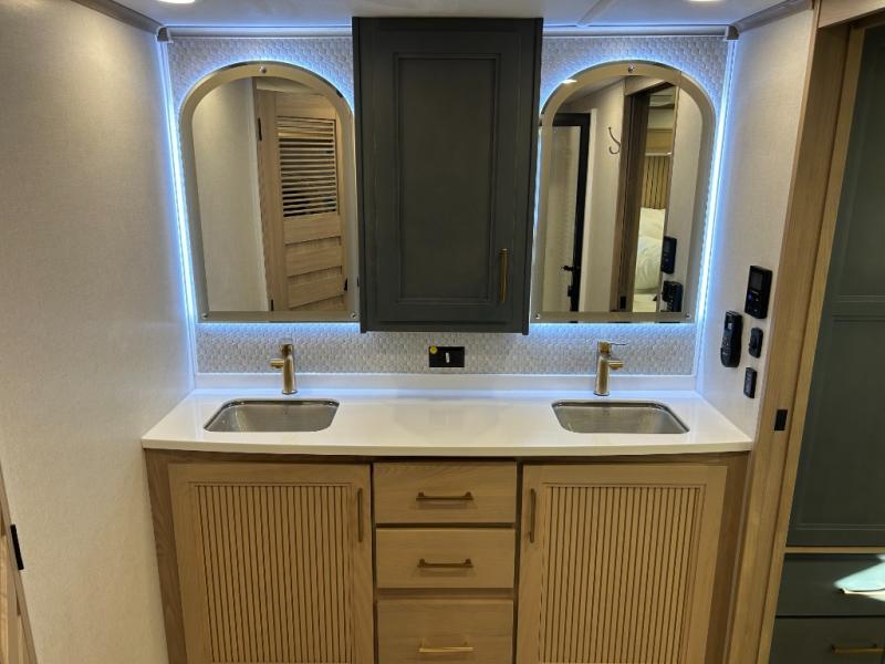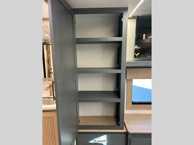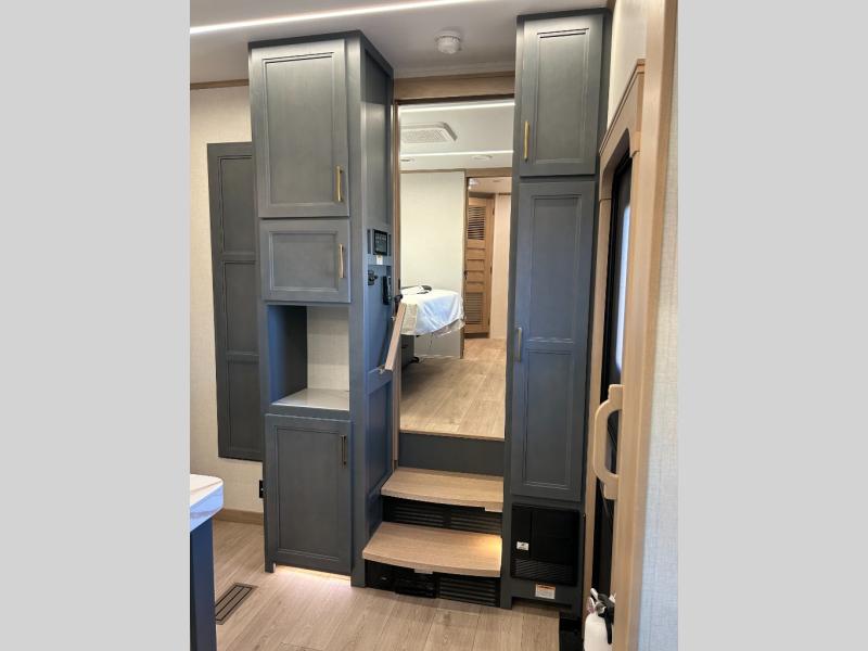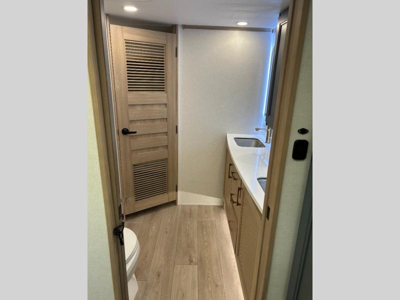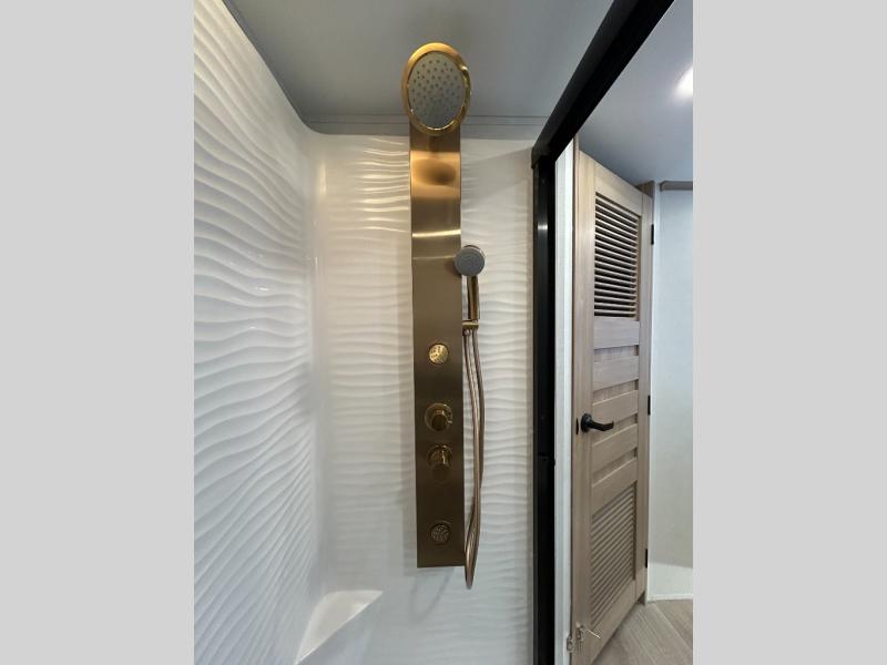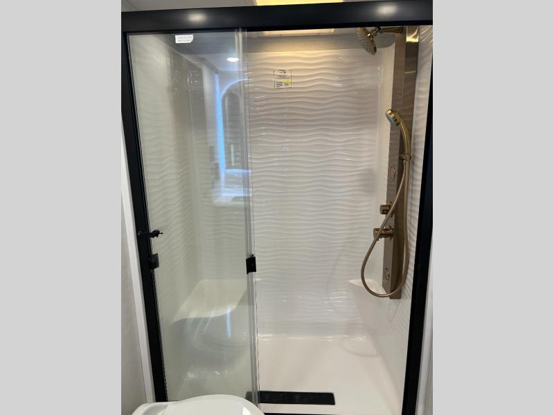 This Redwood fifth wheel is going to make you say wow! The rear living room is fully impressive with its 72" tri-fold sofa slides that are across from one another, its 60" theater sofa, entertainment center with 65" TV, and its ceiling fan. All in all, it will feel like you're lounging back at home. The kitchen is also completely decked out with opposing slides, a pull-out waste basket at the large island, two buffets, a pantry, and a message center, and just a few steps away from the kitchen is where you will find the luxurious master suite. This space has a full bathroom up at the front where you will find a huge walk-in closet, and within the bedroom, the king bed slide rests across from the 39" TV so that you can watch a movie in comfort.