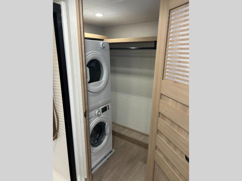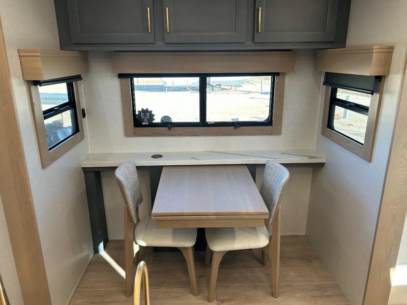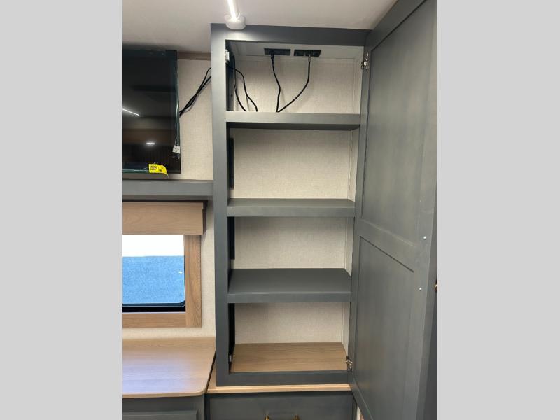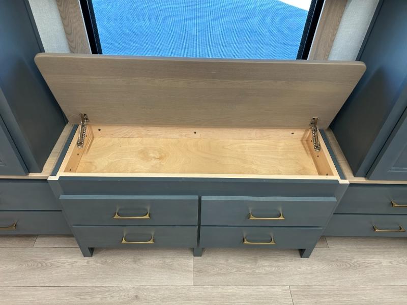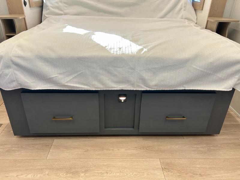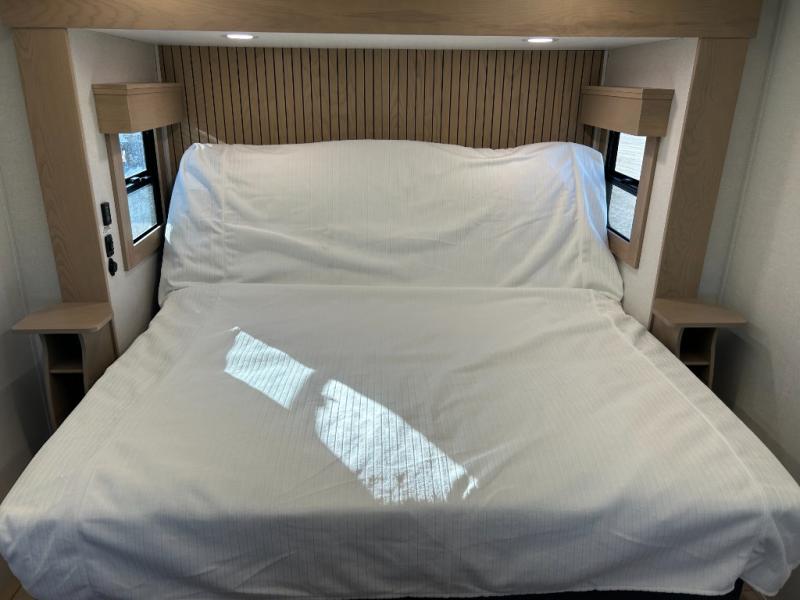 You are going to wish you found the Redwood fifth wheels sooner! With all of the residential comfort and modern luxury, you will be impressed. The Williamsburg Furniture Collection includes two premium dinette chairs, a buffet-style adjustable dinette with leaf extension, a residential-style sofa, and powered theater seating. The luxury further extends to the bedroom where you will find a gel-foam king bed with tilt and C-PAP shelves on both sides of the bed. The straight roof line gives a luxury profile, and there are preparations for a wireless backup camera as well as solar power. The seamless residential insulated heat ducts will efficiently heat your unit, and there is an exterior radio in the fully finished and heated pass-through with slat board storage.