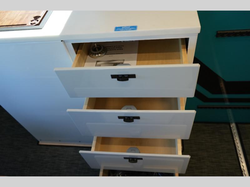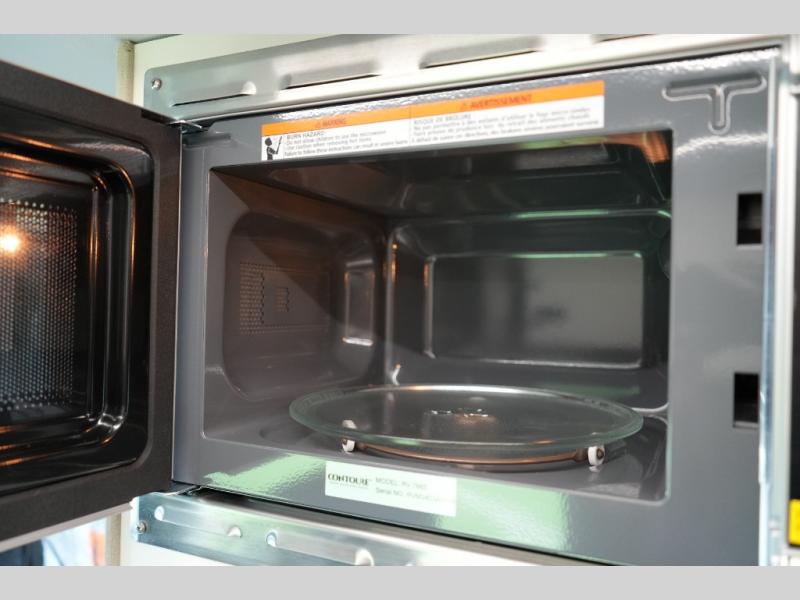 Kitchen: Portable 1300W induction cooktop, 700W microwave, and 65L drawer fridge/freezer for convenient meal prep on the road