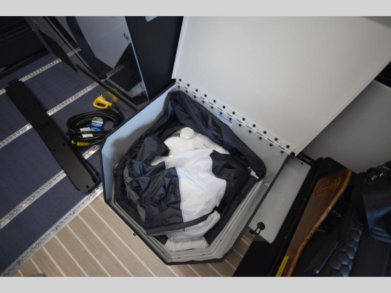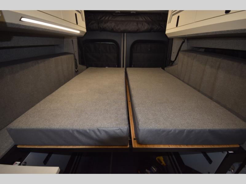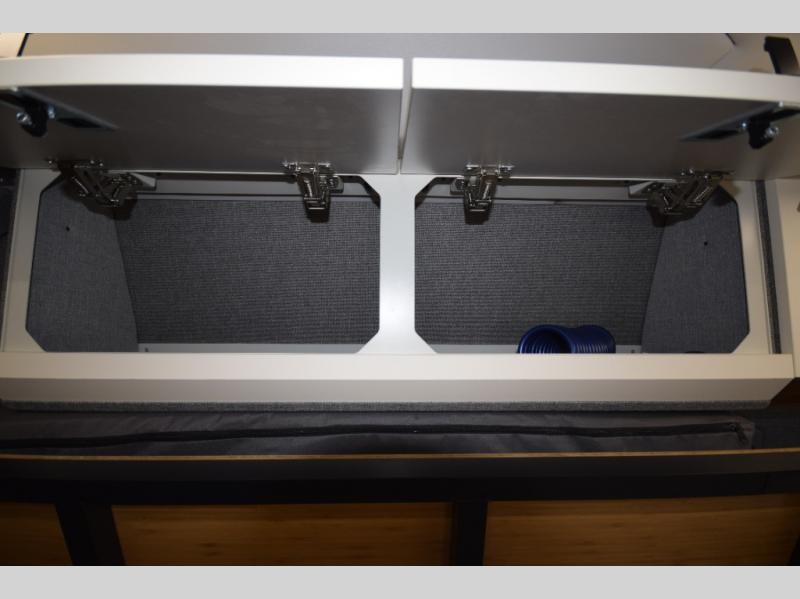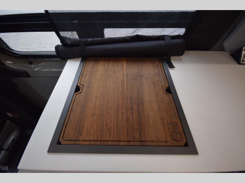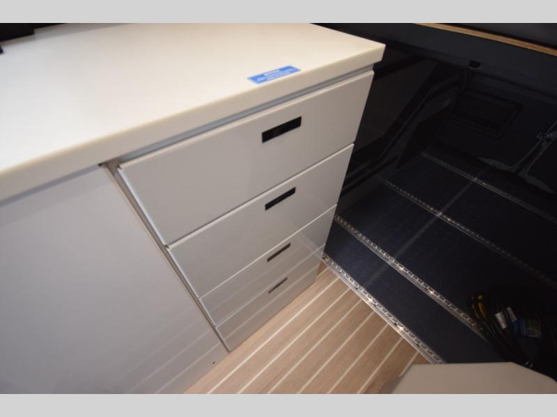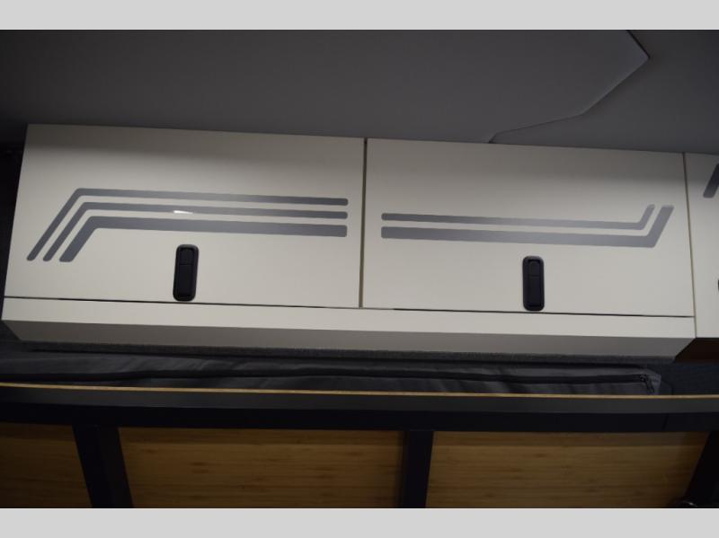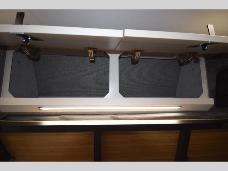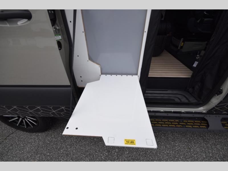 Inside, you'll find a clean and modern interior layout that prioritizes comfort and flexibility. The queen-size legless bed folds away to reveal 17.4 feet of uninterrupted garage space—perfect for bikes, boards, or your next big haul.