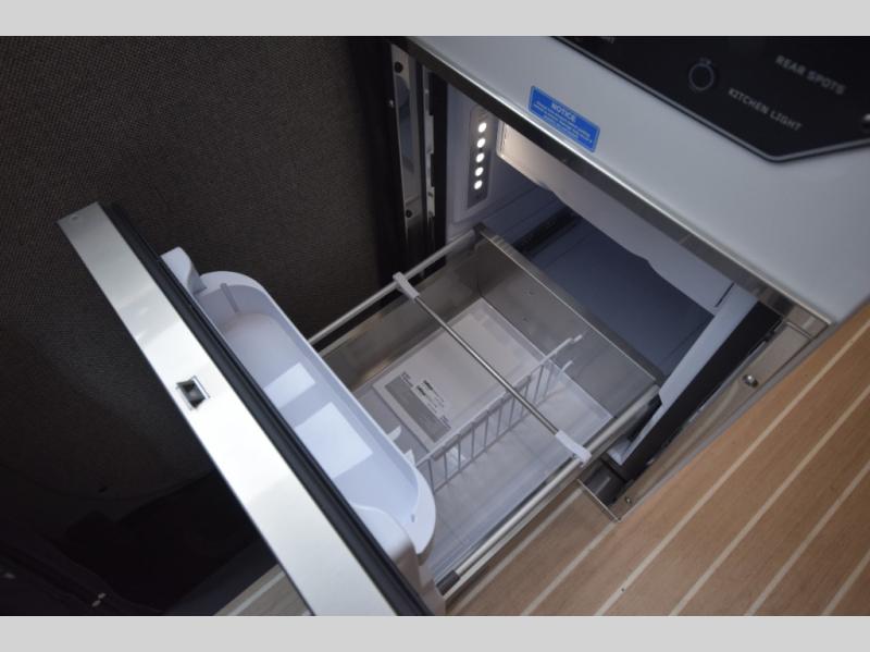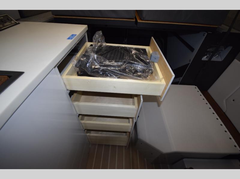 Meanwhile, the fully functional kitchen includes a 1300W portable induction cooktop, stainless steel microwave, and 65L stainless steel drawer fridge/freezer—ready to fuel any adventure. Pull down the bamboo table, set your drink, and relax.