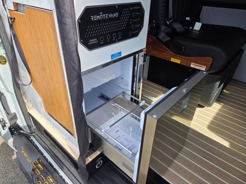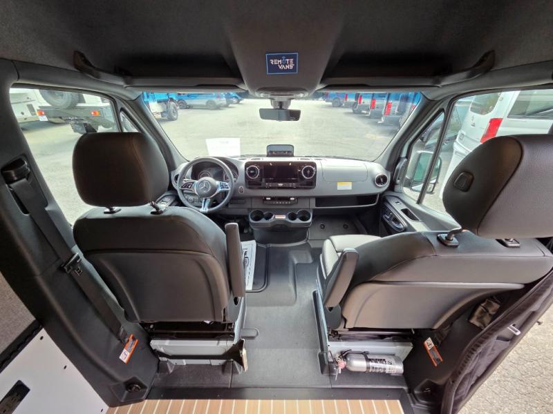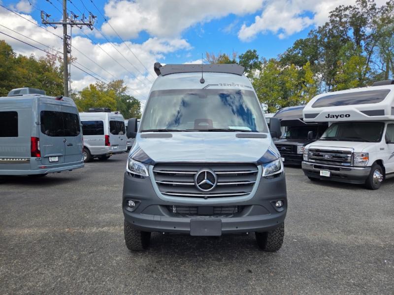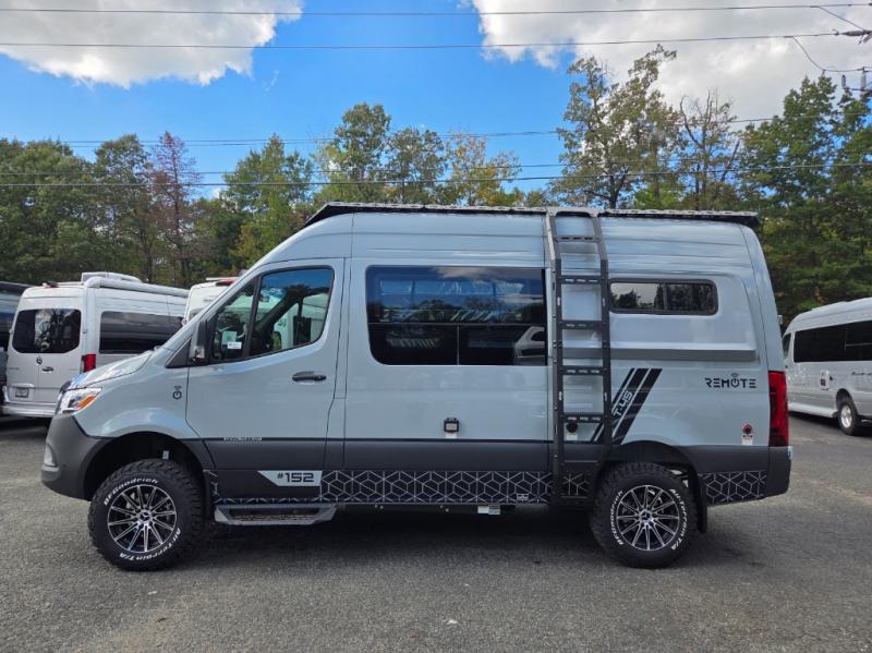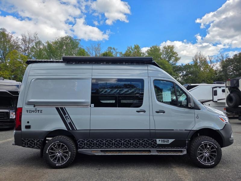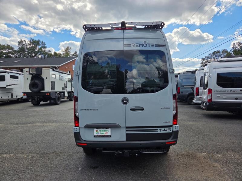 The 2026 Remote Vans T-45 is an all-wheel-drive Class B adventure van built on the Mercedes-Benz Sprinter 144" wheelbase chassis. It features an 8.4 kWh power system, a queen-sized bed, and a full kitchen.