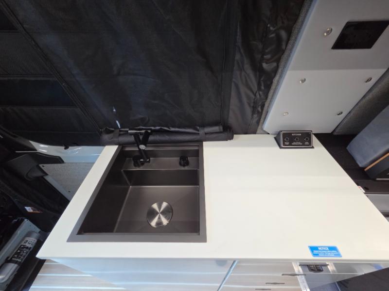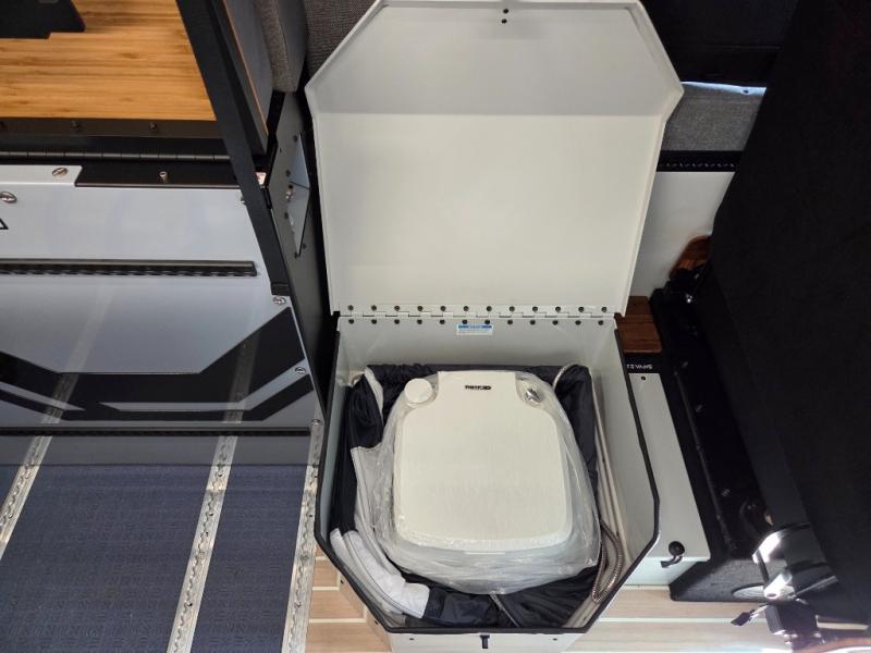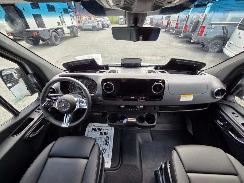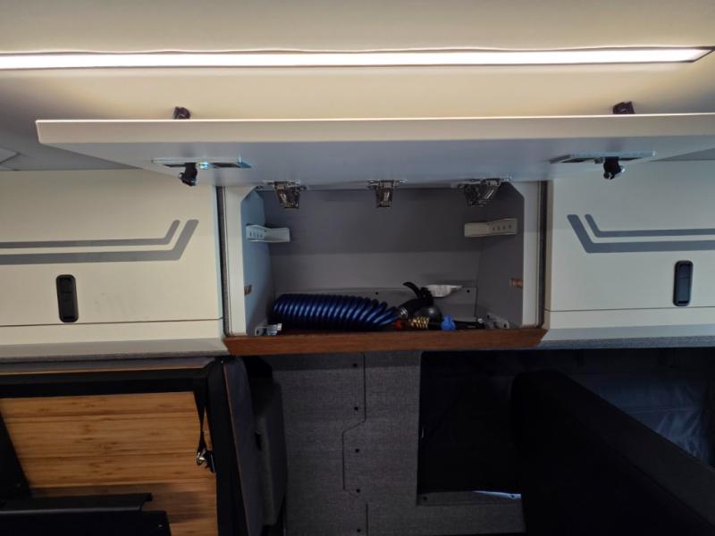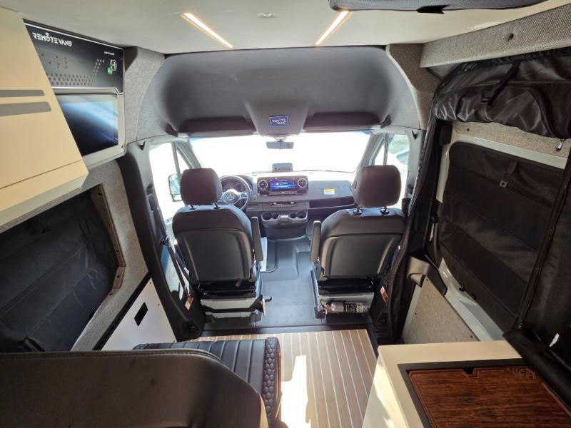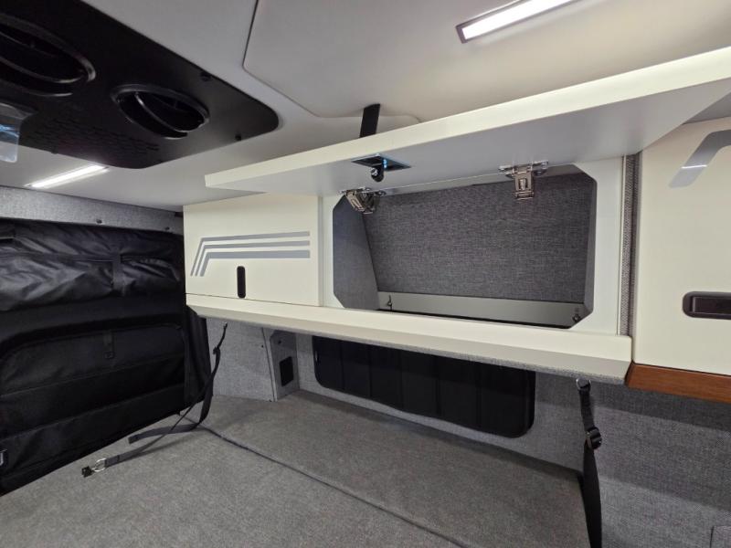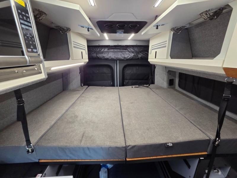 The 2026 Remote Vans T-45 is an all-wheel-drive Class B adventure van built on the Mercedes-Benz Sprinter 144" wheelbase chassis. It features an 8.4 kWh power system, a queen-sized bed, and a full kitchen.