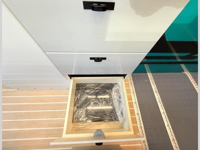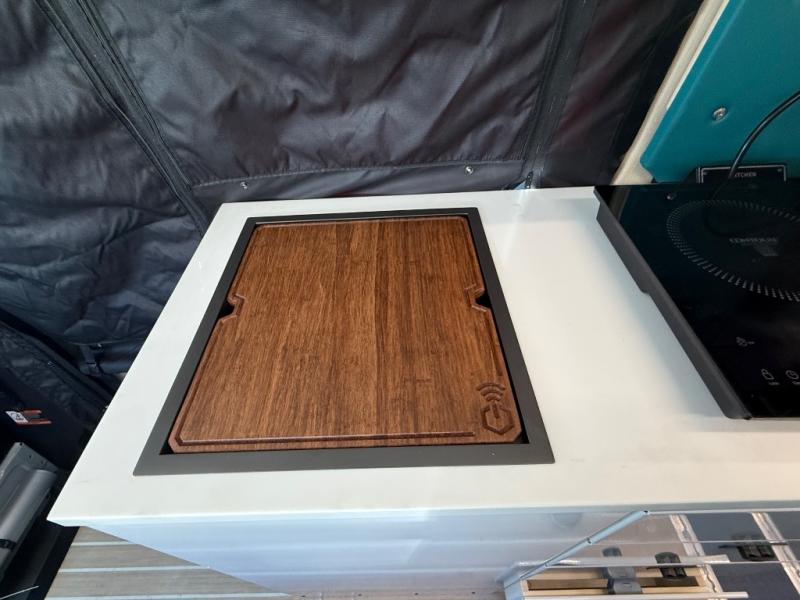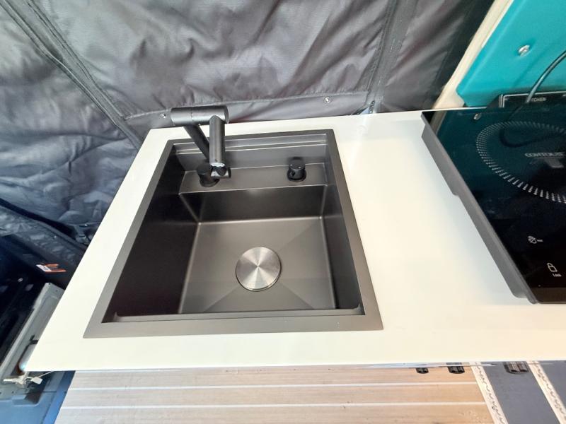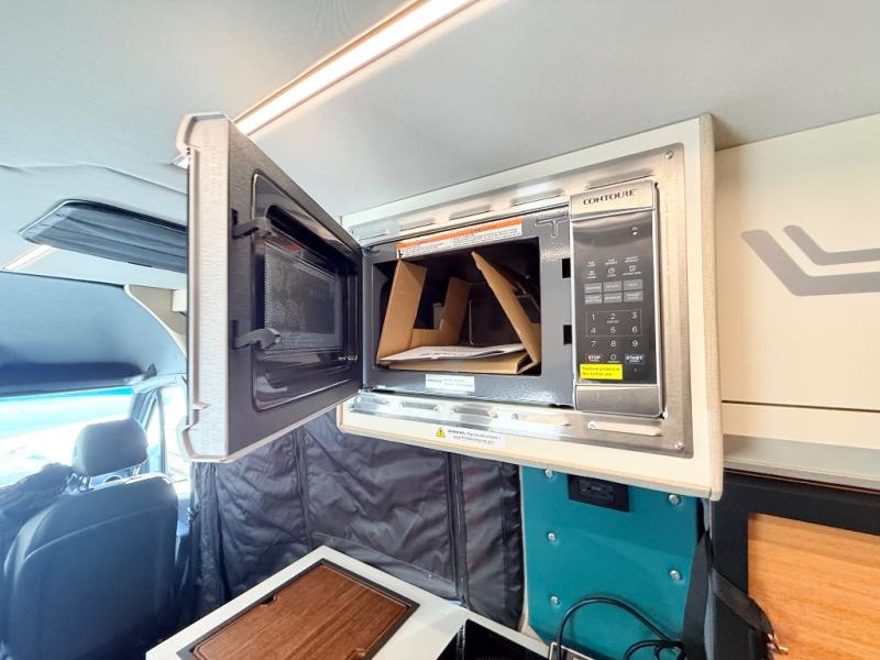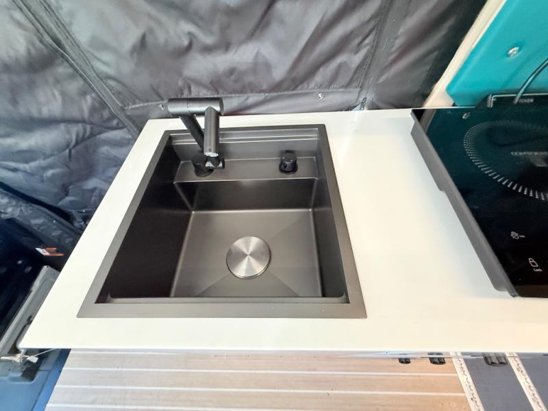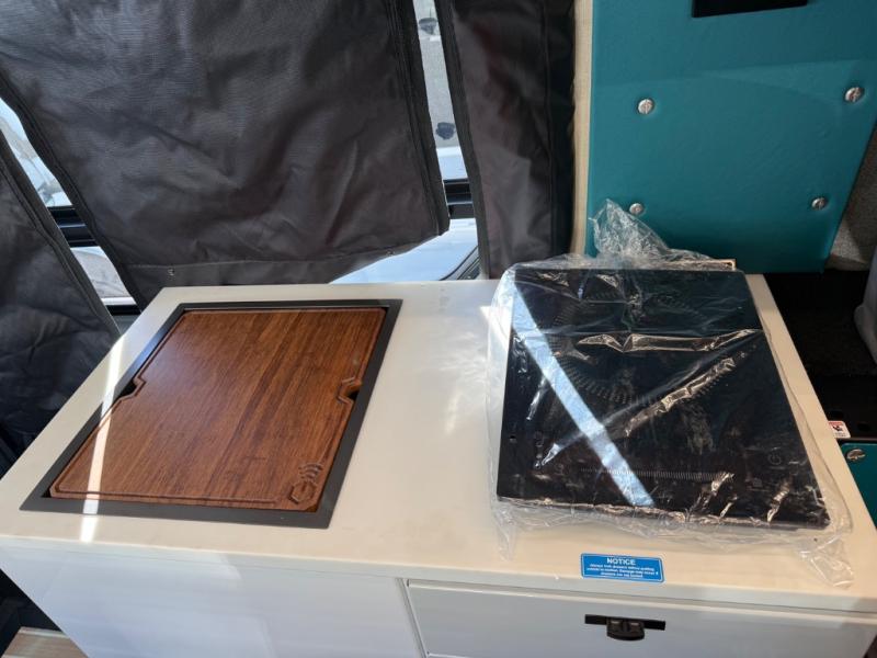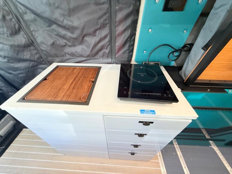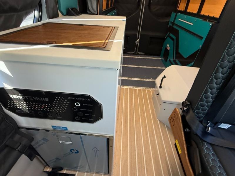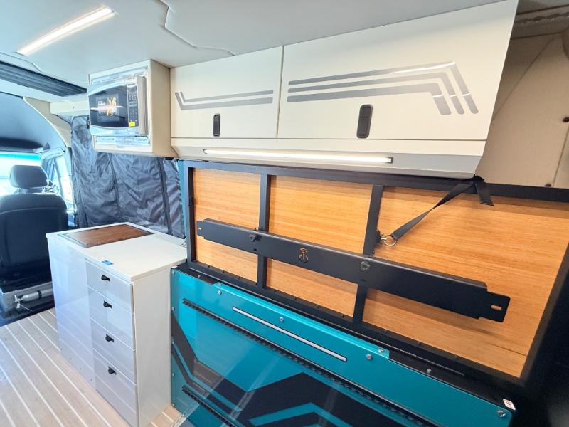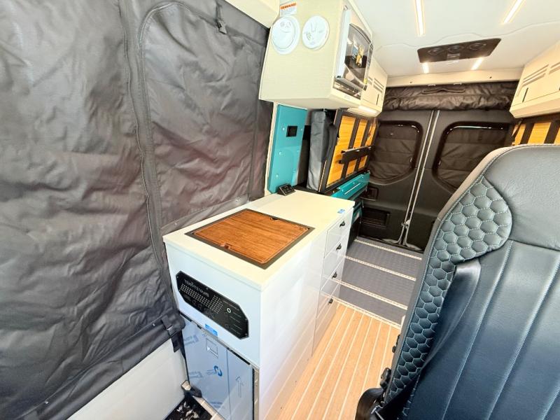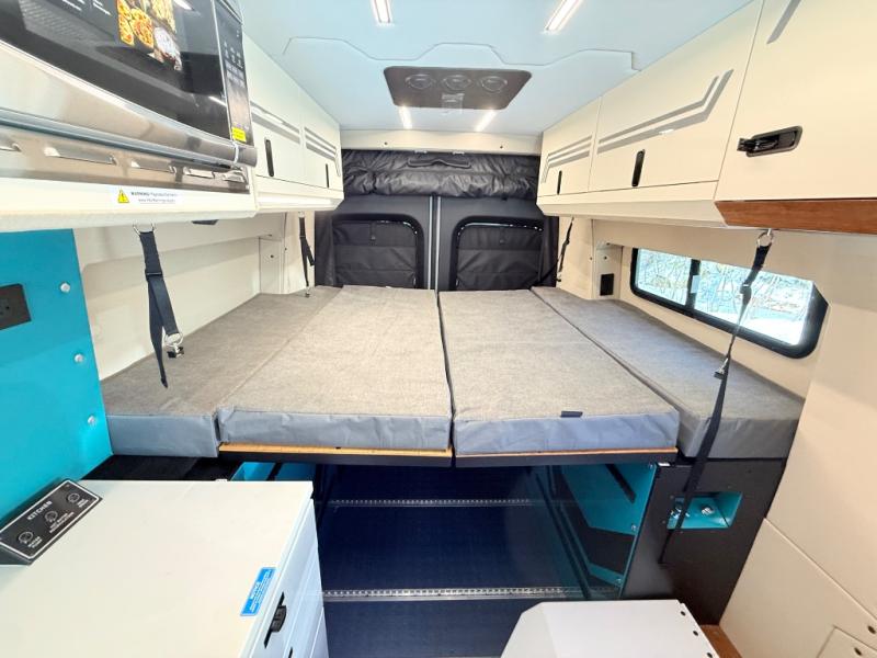 If you're new to the van lifestyle, this unit will be perfect for you! It includes many comforts and conveniences to make the journey hassle-free, plus you can customize it further if you choose! The functional kitchen features a portable 1300W induction cooktop and 700W microwave to make meals on the road, while a 65L drawer fridge/freezer keeps your food fresh. The front swivel seats can become a part of the main cabin space once you park for the day, and there is also a two-person Vanhalla rotating 90-degree sleeper seat for ride along guests! A cyber shower can be set up in 30 seconds and includes an anti-slip shower tray, a quick connect shower head and hose, plus a removable shower curtain that can be hung up to let dry completely! When you're ready to call it a night, the queen-size legless bed system can be set up for a great night's rest. In the morning, just fold up the bed to utilize the impressive garage space!