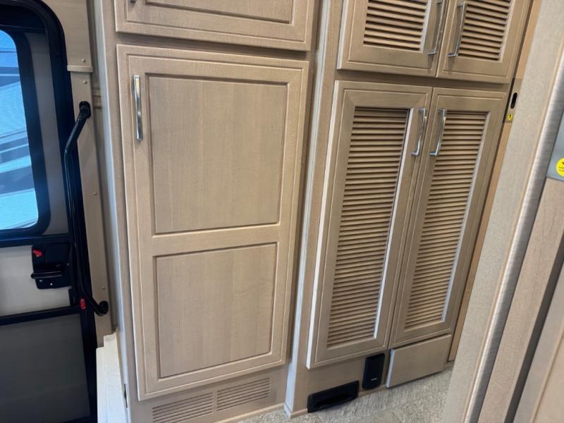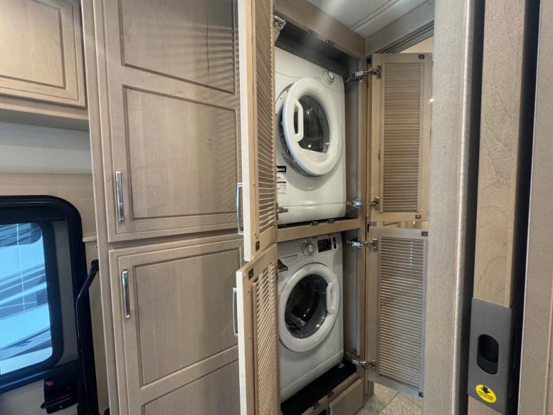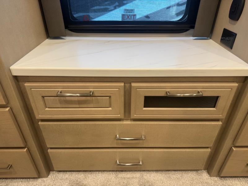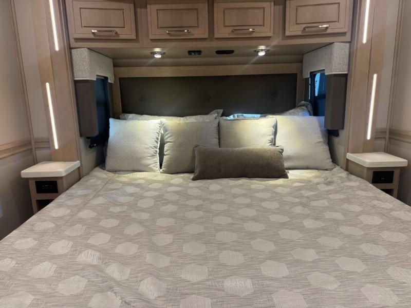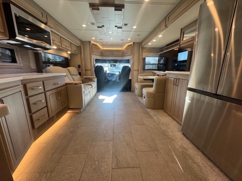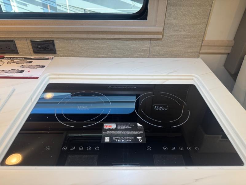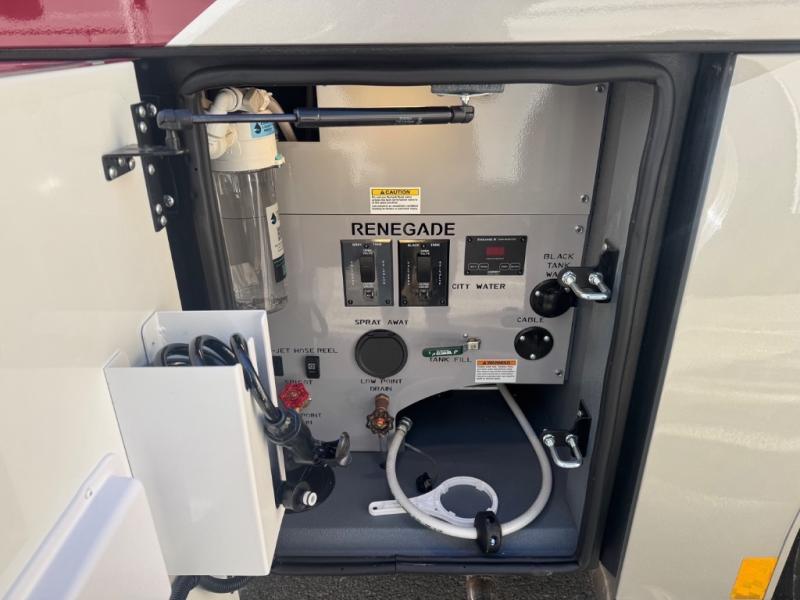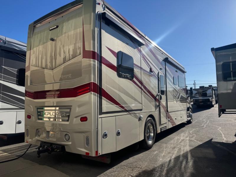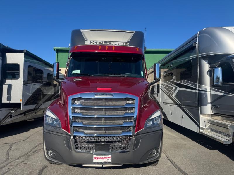 Renegade Explorer Super C diesel motorhome 38EMB highlights: Private Bedroom Ceiling Fan Opposing Slides Exterior 43" TV Induction Cooktop (3) 200W Solar Panels You will be completely ready to take on the next adventure with this Explorer Super C diesel motorhome! This coach delivers a comfortable, attractive, modern interior in which you can spend your time. There are loads of the latest appliances, like the 18-cubic foot French door refrigerator, stainless steel convection microwave, and two-burner induction cooktop. The full bathroom will be exceptionally helpful when getting ready with its shower skylight and LED vanity light, and the sofa sleeper is going to be a great place to sit down with a good book and cup of coffee. You will also appreciate having a booth dinette so that you can sit down together to enjoy a meal. Get a good night's rest each night on the 66" x 74" king bed slide across from another slide that houses a dresser base with closets on either side in the rear private bedroom! Extreme luxury, extreme purpose, and extreme durability is what you will find in each one of these Renegade Explorer Super C diesel motorhomes! They are more advanced than ever with a Freightliner Cascadia 116 chassis with an Allison TRV4000 transmission or Detroit DT12 12-speed transmission, a Detroit DD13 engine, and 525HP. The spacious interior is beautifully designed with tile floors, full maple, hardwood residential style cabinets, tile backsplashes, and ultra soft touch vinyl furniture upholstery. A multiplex system comes with Bluetooth app control so you can use it at the touch of a finger, and the Girard 2-Stage lateral arm rooftop awning with LED lights will protect you rain or shine and night or day. The exterior also has nine full body paint treatment colors to choose from and a four-point automatic hydraulic leveling system. Start driving in style today!