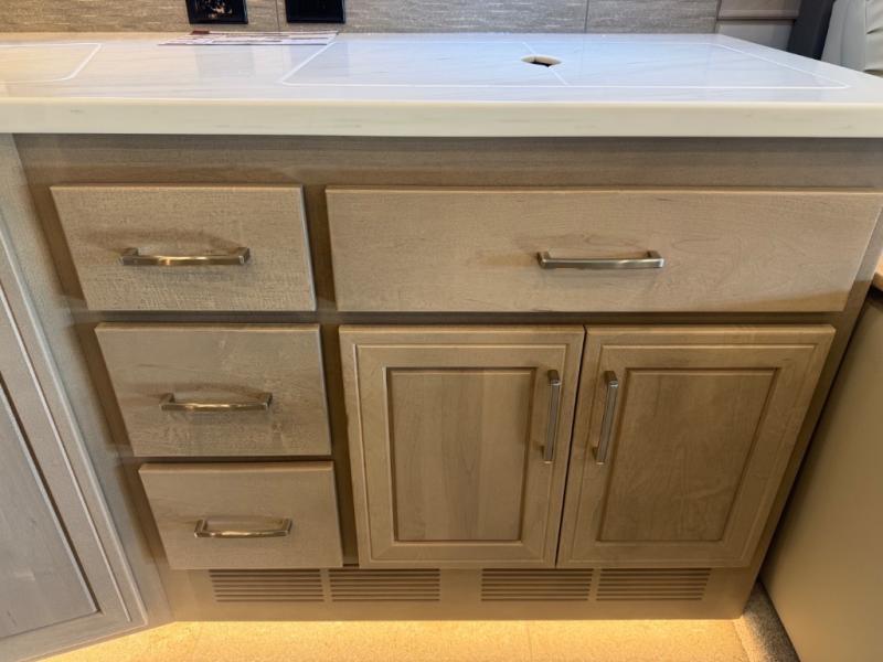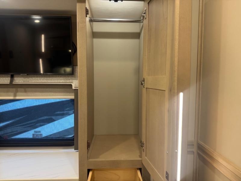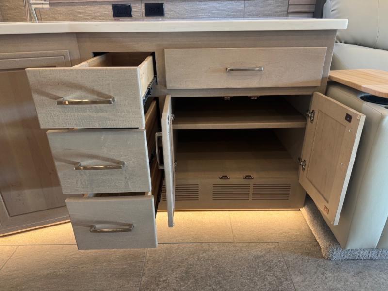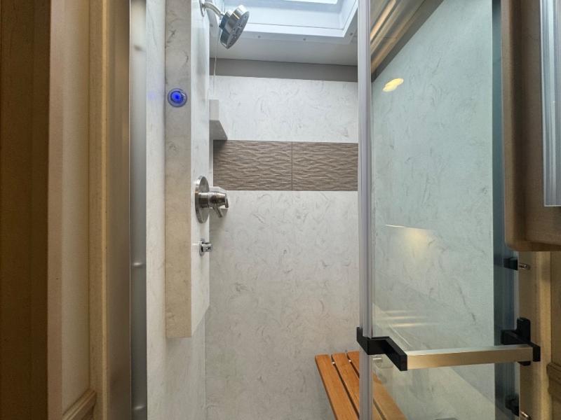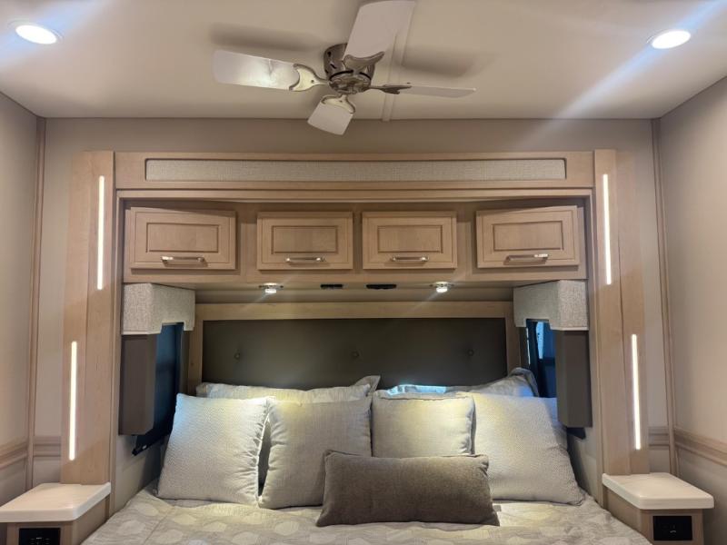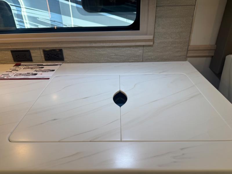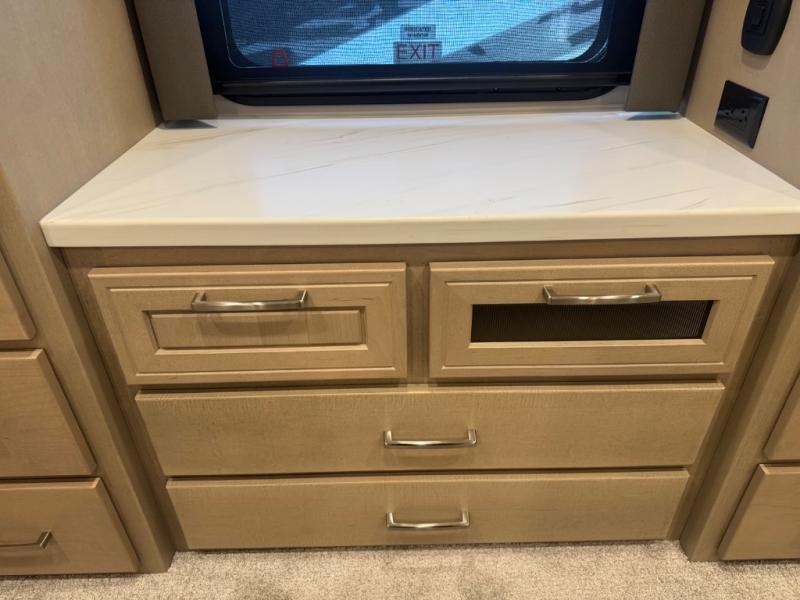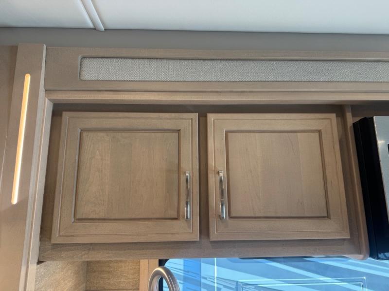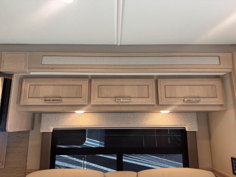 Renegade Explorer Super C diesel motorhome 38EMB highlights: Private Bedroom Ceiling Fan Opposing Slides Exterior 43" TV Induction Cooktop (3) 200W Solar Panels You will be completely ready to take on the next adventure with this Explorer Super C diesel motorhome! This coach delivers a comfortable, attractive, modern interior in which you can spend your time. There are loads of the latest appliances, like the 18-cubic foot French door refrigerator, stainless steel convection microwave, and two-burner induction cooktop. The full bathroom will be exceptionally helpful when getting ready with its shower skylight and LED vanity light, and the sofa sleeper is going to be a great place to sit down with a good book and cup of coffee. You will also appreciate having a booth dinette so that you can sit down together to enjoy a meal. Get a good night's rest each night on the 66" x 74" king bed slide across from another slide that houses a dresser base with closets on either side in the rear private bedroom! Extreme luxury, extreme purpose, and extreme durability is what you will find in each one of these Renegade Explorer Super C diesel motorhomes! They are more advanced than ever with a Freightliner Cascadia 116 chassis with an Allison TRV4000 transmission or Detroit DT12 12-speed transmission, a Detroit DD13 engine, and 525HP. The spacious interior is beautifully designed with tile floors, full maple, hardwood residential style cabinets, tile backsplashes, and ultra soft touch vinyl furniture upholstery. A multiplex system comes with Bluetooth app control so you can use it at the touch of a finger, and the Girard 2-Stage lateral arm rooftop awning with LED lights will protect you rain or shine and night or day. The exterior also has nine full body paint treatment colors to choose from and a four-point automatic hydraulic leveling system. Start driving in style today!