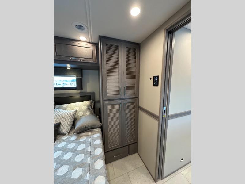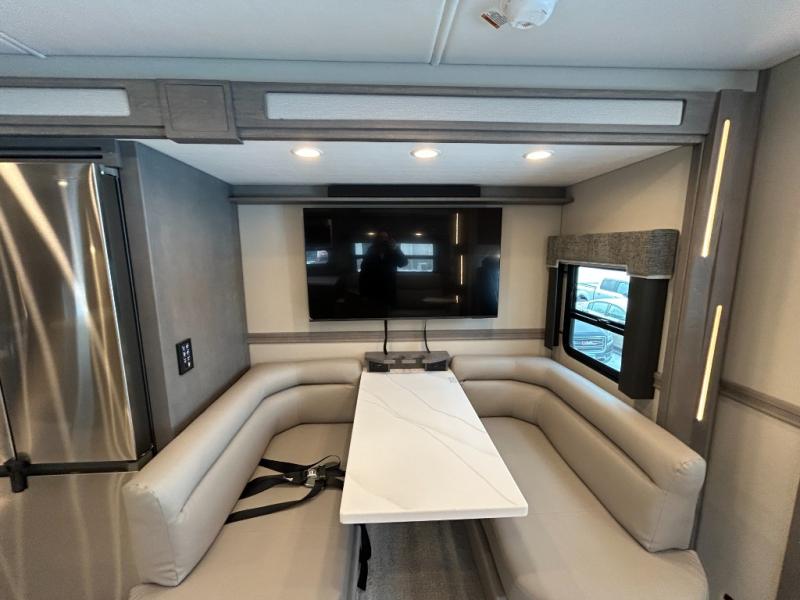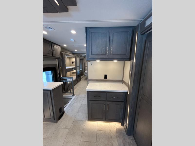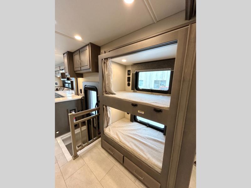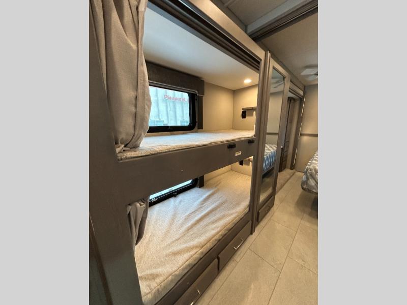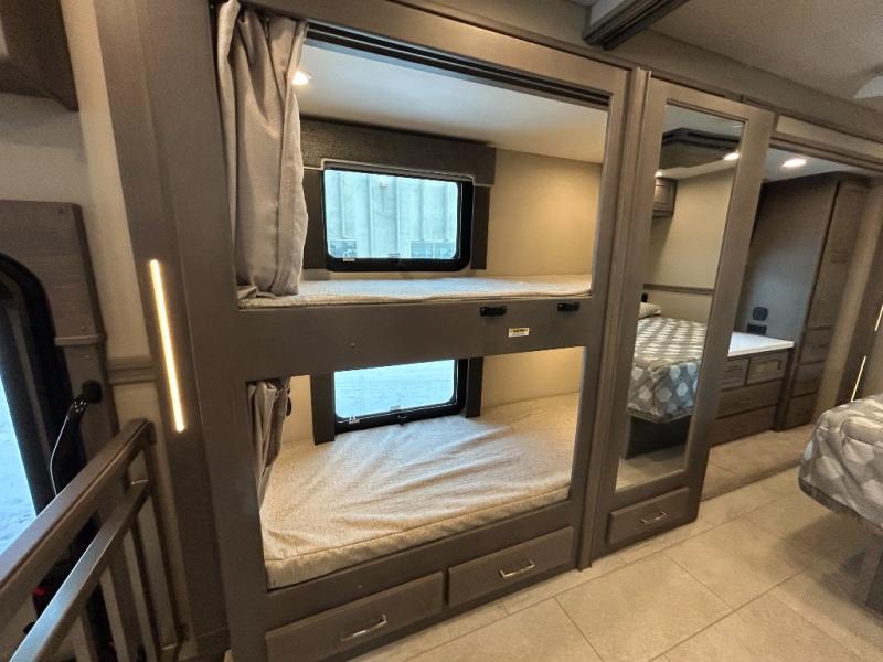 Designed for sophisticated travelers who demand the best, this motorhome is a safe bet! The rear bedroom is a serene sanctuary, featuring a majestic king-sized bed, a whisper-quiet ceiling fan, and a beautifully crafted dresser base. A stunning LED TV provides entertainment, and the area is prepped for a high-end washer and dryer. The full bathroom is equipped with premium fixtures and amenities, including a spacious linen closet for storing plush towels and essentials. The charming bunk beds provide a snug and inviting sleeping spot for kids, while generous overhead cabinets offer ample storage for clothes, toys, and personal items. The kitchen is a culinary haven, equipped with a high-capacity 18 cu. refrigerator, a precision-crafted microwave, and elegant storage solutions, including a stately hutch. The dinette provides a warm and welcoming spot for meals and snacks, and a brilliant LED TV entertains.