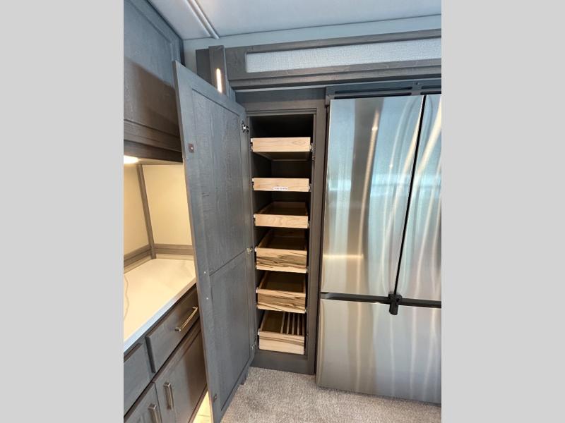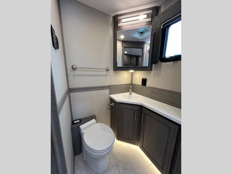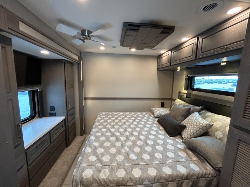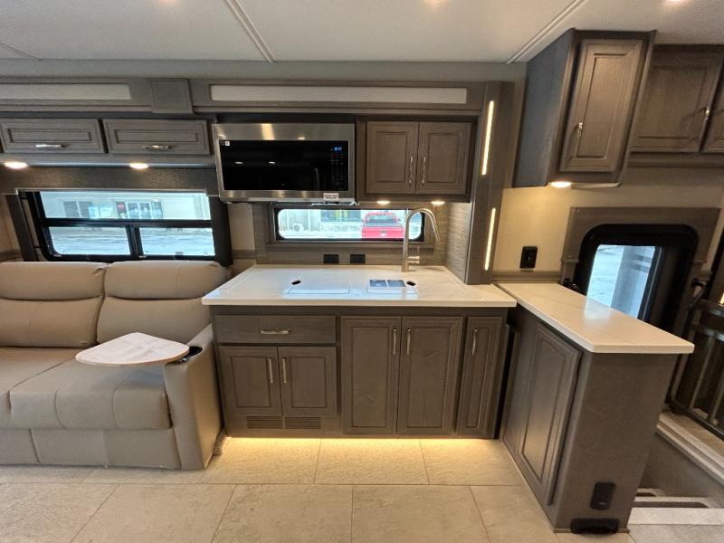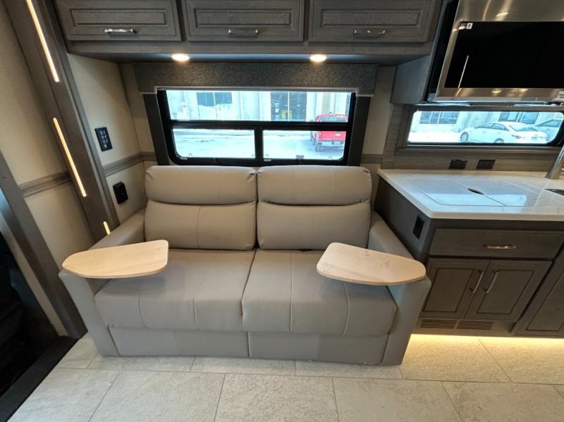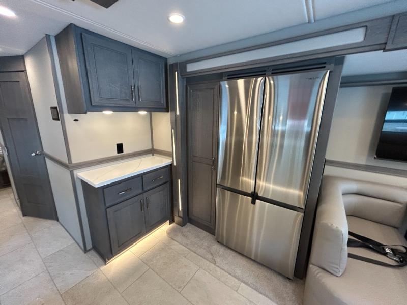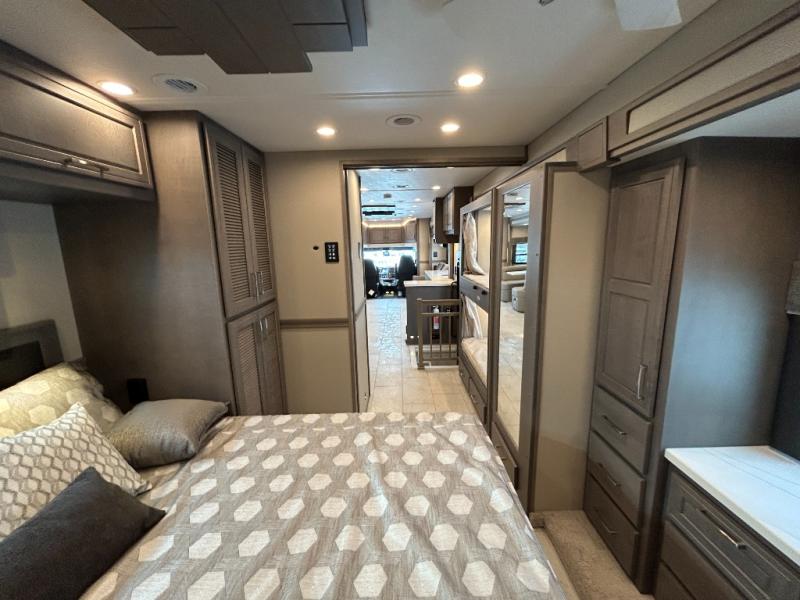 Designed for sophisticated travelers who demand the best, this motorhome is a safe bet! The rear bedroom is a serene sanctuary, featuring a majestic king-sized bed, a whisper-quiet ceiling fan, and a beautifully crafted dresser base. A stunning LED TV provides entertainment, and the area is prepped for a high-end washer and dryer. The full bathroom is equipped with premium fixtures and amenities, including a spacious linen closet for storing plush towels and essentials. The charming bunk beds provide a snug and inviting sleeping spot for kids, while generous overhead cabinets offer ample storage for clothes, toys, and personal items. The kitchen is a culinary haven, equipped with a high-capacity 18 cu. refrigerator, a precision-crafted microwave, and elegant storage solutions, including a stately hutch. The dinette provides a warm and welcoming spot for meals and snacks, and a brilliant LED TV entertains.