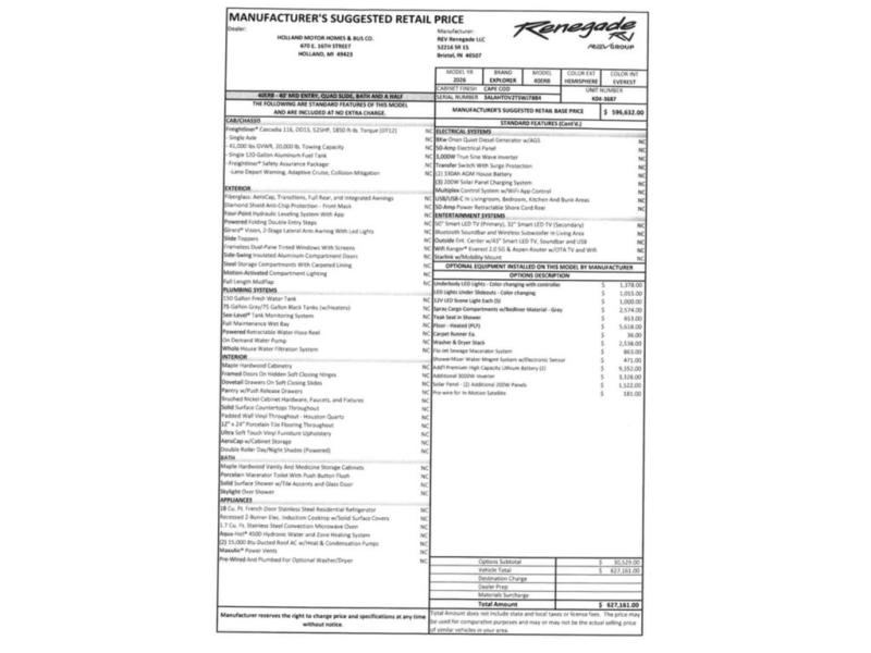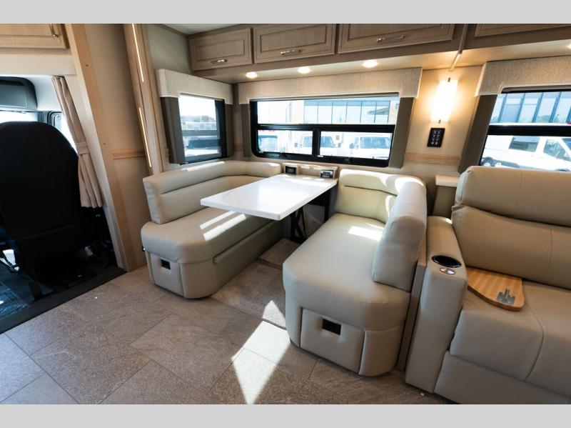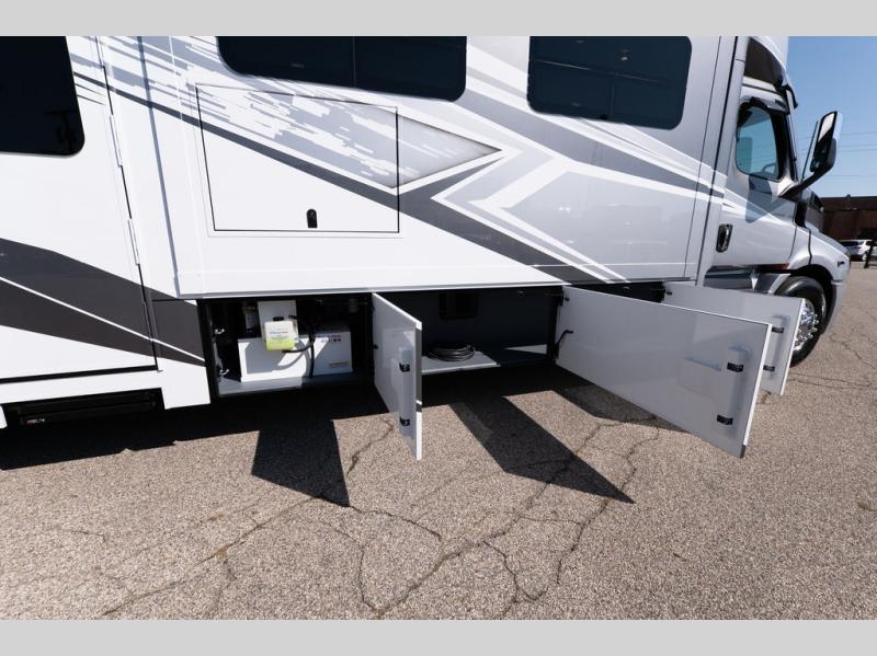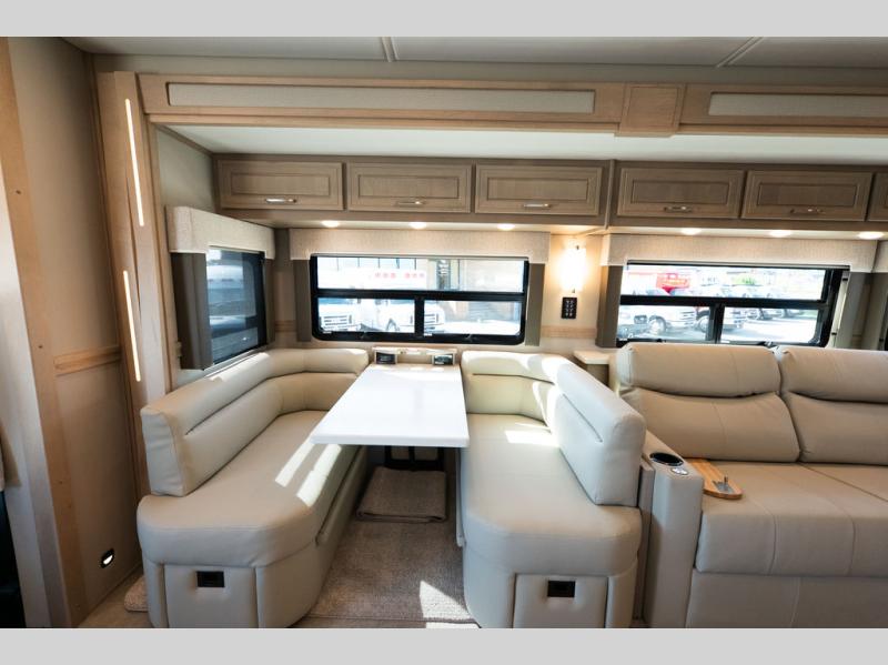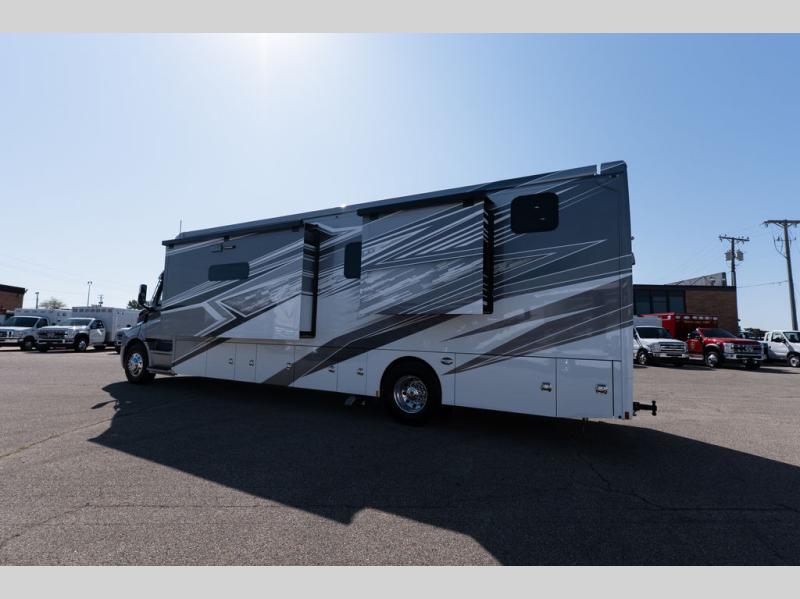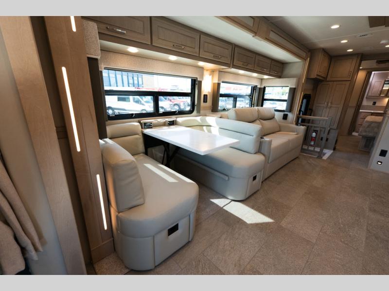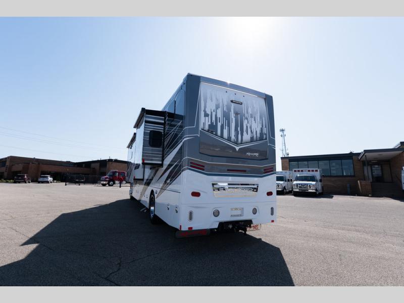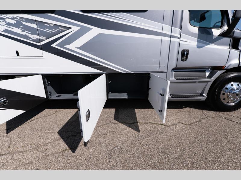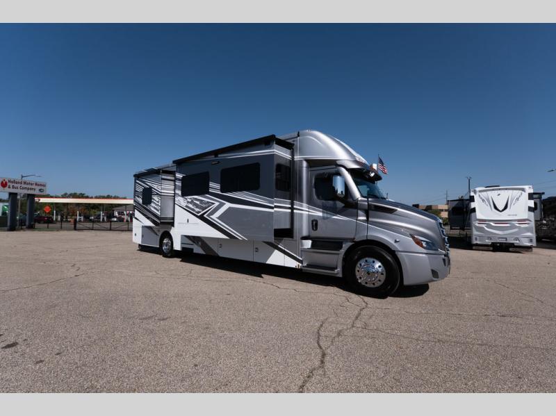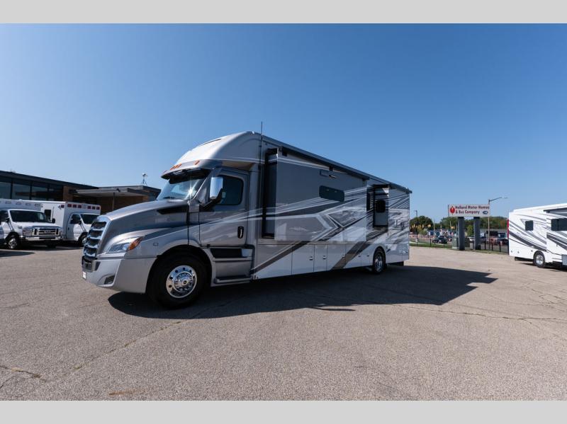 Extreme luxury, extreme purpose, and extreme durability is what you will find in each one of these Renegade Explorer Super C diesel motorhomes! They are more advanced than ever with a Freightliner Cascadia 116 chassis with an Allison TRV4000 transmission or Detroit DT12 12-speed transmission, a Detroit DD13 engine, and 525HP. The spacious interior is beautifully designed with tile floors, full maple, hardwood residential style cabinets, tile backsplashes, and ultra soft touch vinyl furniture upholstery. A multiplex system comes with Bluetooth app control so you can use it at the touch of a finger, and the Girard 2-Stage lateral arm rooftop awning with LED lights will protect you rain or shine and night or day. The exterior also has nine full body paint treatment colors to choose from and a four-point automatic hydraulic leveling system. Start driving in style today!
