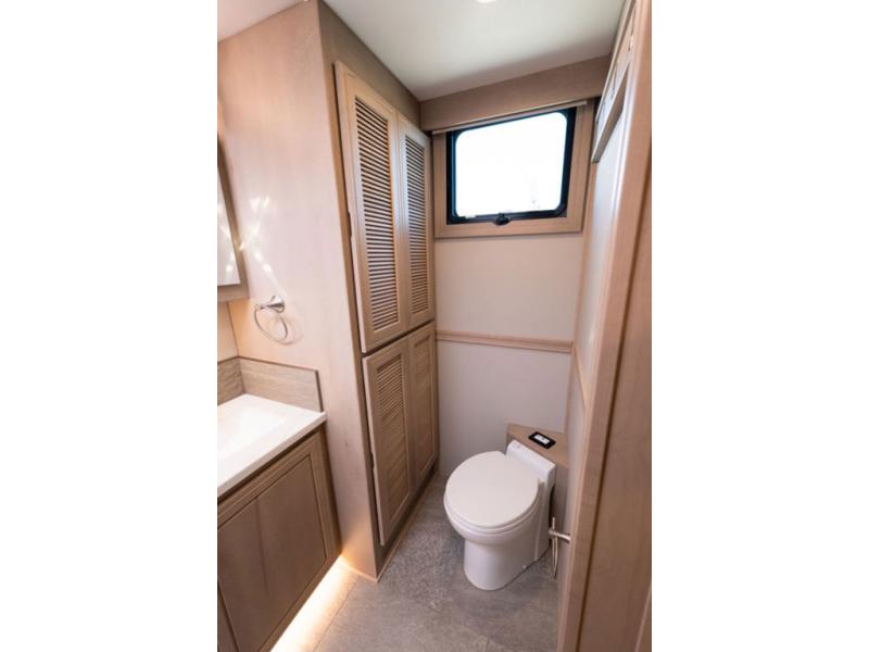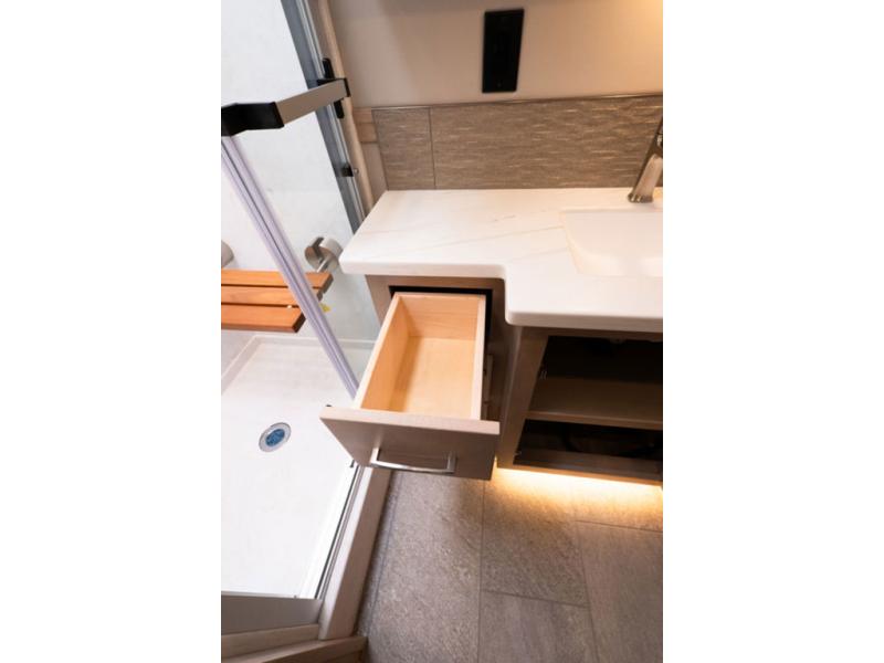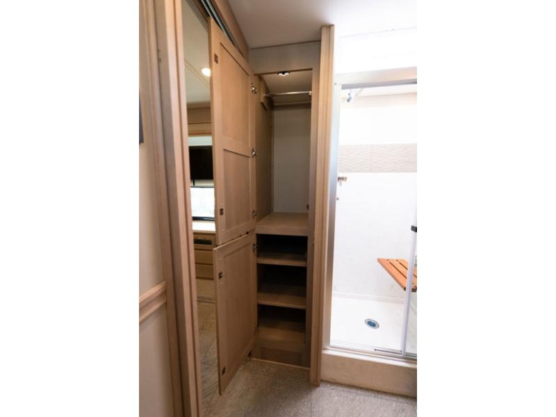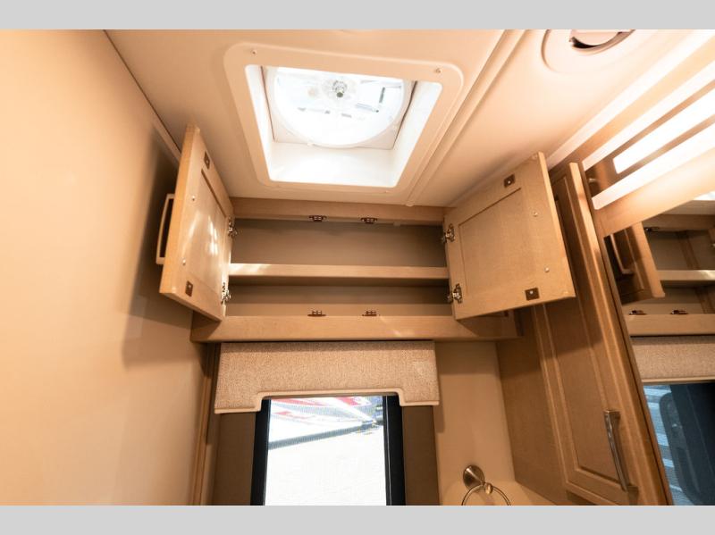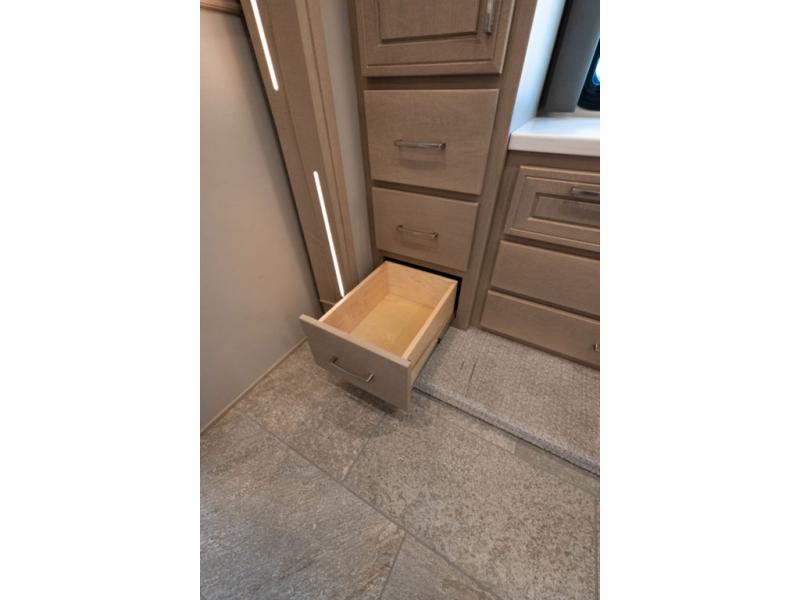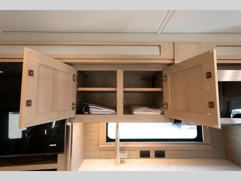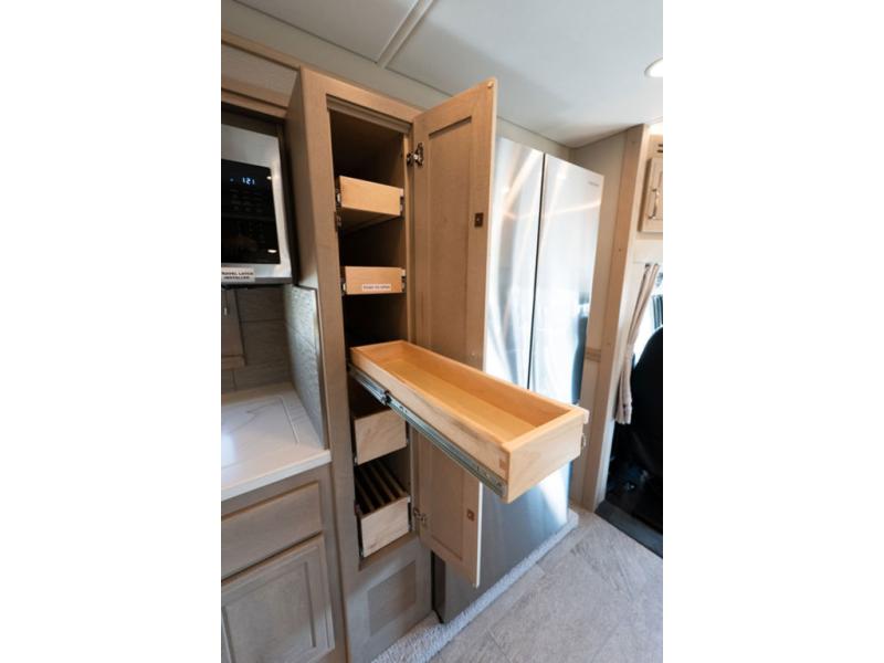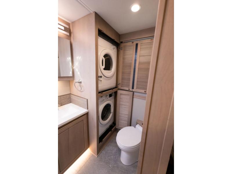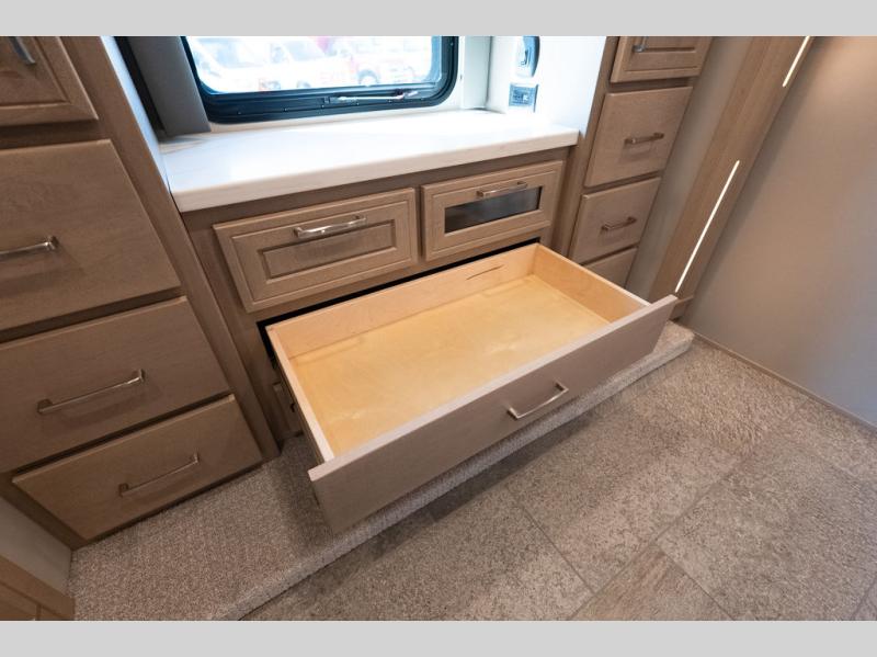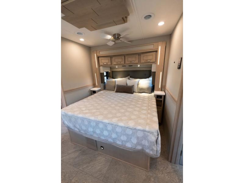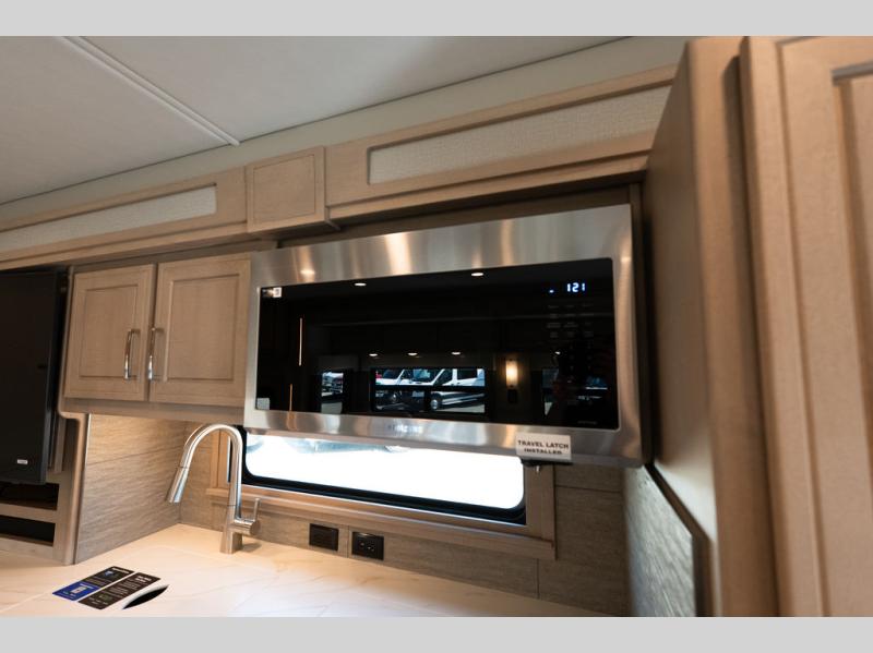 Designed for sophisticated travelers who demand the best, this motorhome is a safe bet. The rear bedroom is a serene sanctuary, featuring a majestic king-sized bed, a whisper-quiet ceiling fan, a beautifully crafted dresser base, and an expansive walk-in closet. A stunning LED TV provides entertainment, and the area is prepped for a high-end washer and dryer. The full bathroom is equipped with premium fixtures and amenities, including a spacious linen closet for storing plush towels and essentials. The charming bunk beds provide a snug and inviting sleeping spot for kids, while generous overhead cabinets offer ample storage for clothes, toys, and personal items. The kitchen is a culinary haven, equipped with a high-capacity 18 cu. refrigerator, a precision-crafted microwave, and elegant storage solutions, including a stately hutch. The dinette provides a warm and welcoming spot for meals and snacks, and a brilliant LED TV entertains.