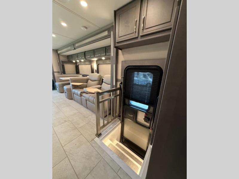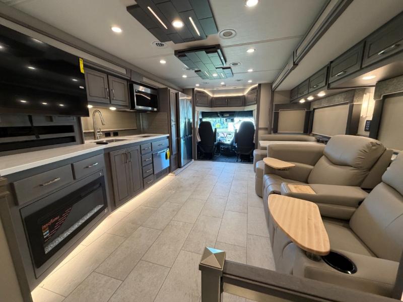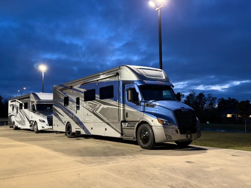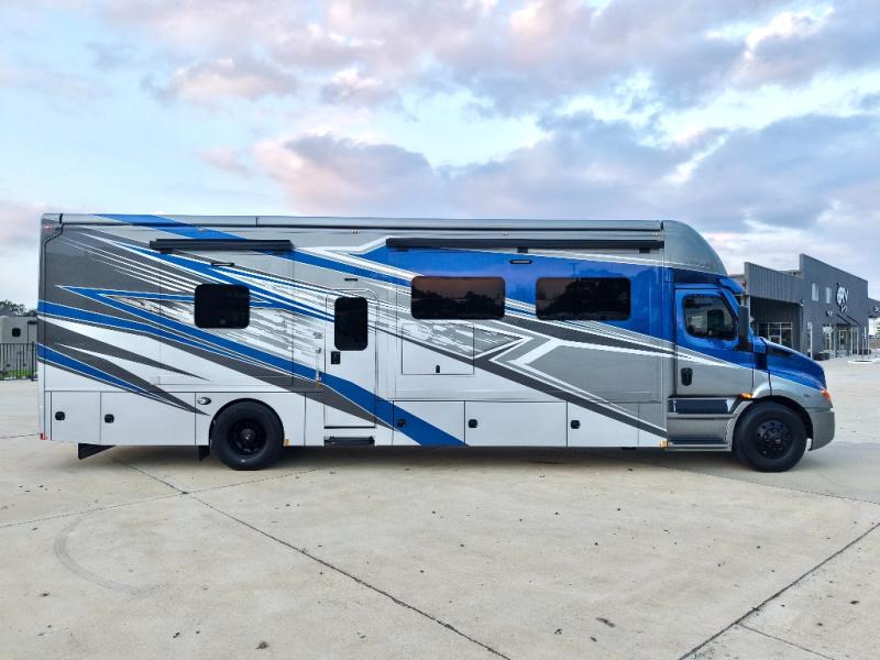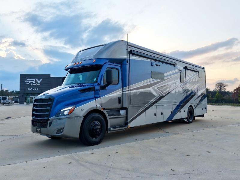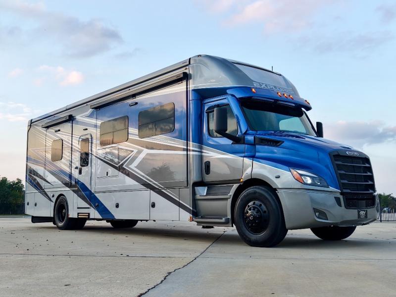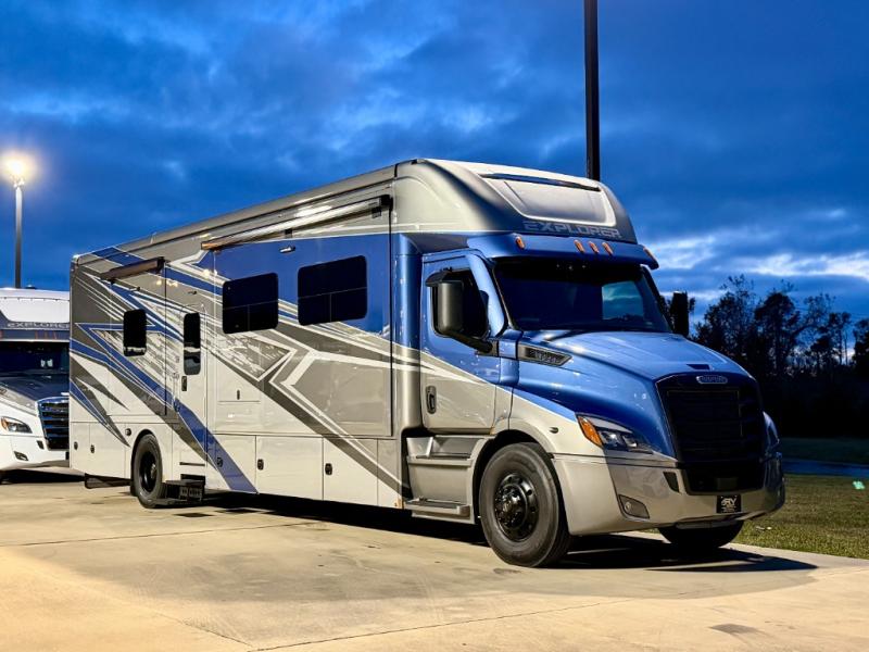 Extreme luxury, extreme purpose, and extreme durability is what you will find in each one of these Renegade Explorer Super C diesel motorhomes! They are more advanced than ever with a Freightliner Cascadia 116 chassis with an Allison TRV4000 transmission or Detroit DT12 12-speed transmission, a Detroit DD13 engine, and 525HP. The spacious interior is beautifully designed with tile floors, full maple, hardwood residential style cabinets, tile backsplashes, and ultra soft touch vinyl furniture upholstery. A multiplex system comes with Bluetooth app control so you can use it at the touch of a finger, and the Girard 2-Stage lateral arm rooftop awning with LED lights will protect you rain or shine and night or day. The exterior also has nine full body paint treatment colors to choose from and a four-point automatic hydraulic leveling system. Start driving in style today!