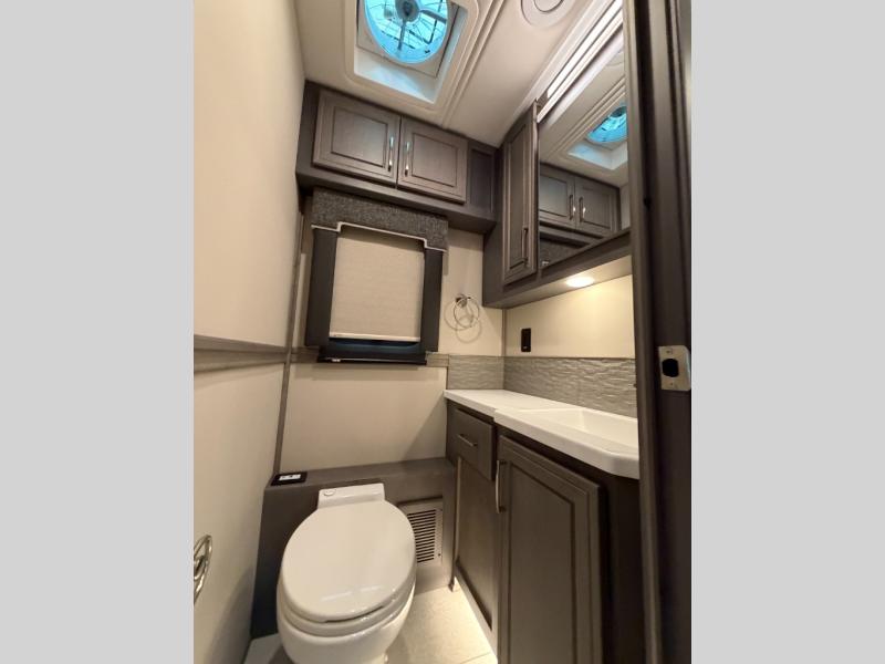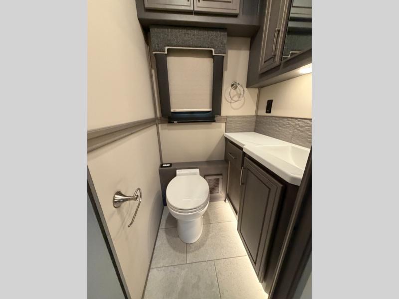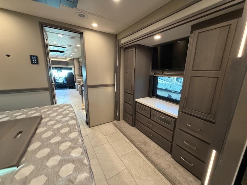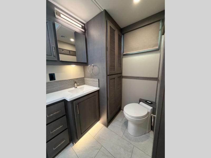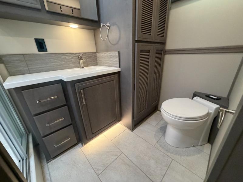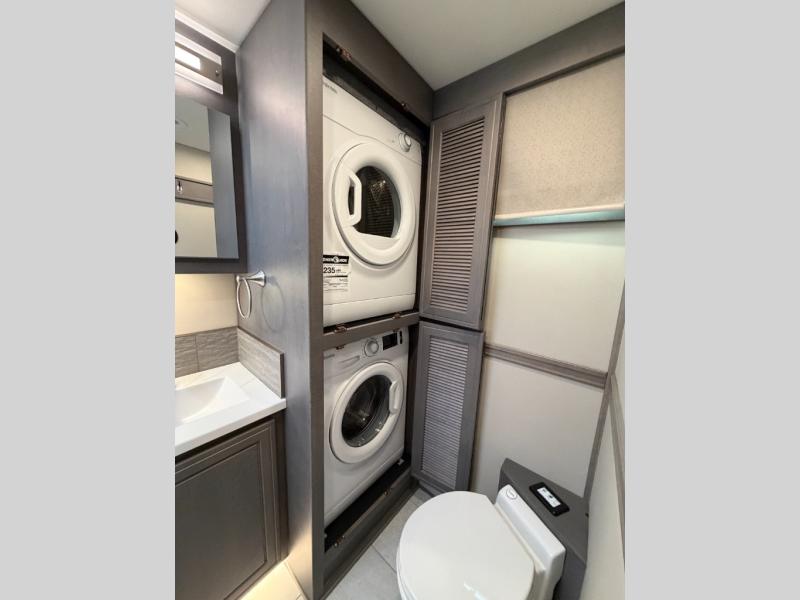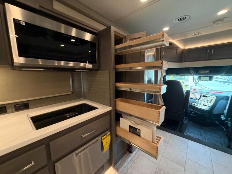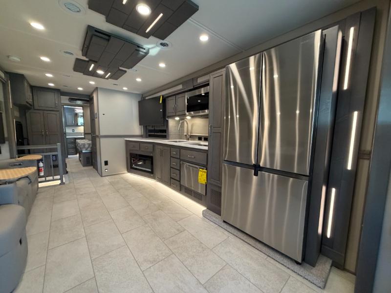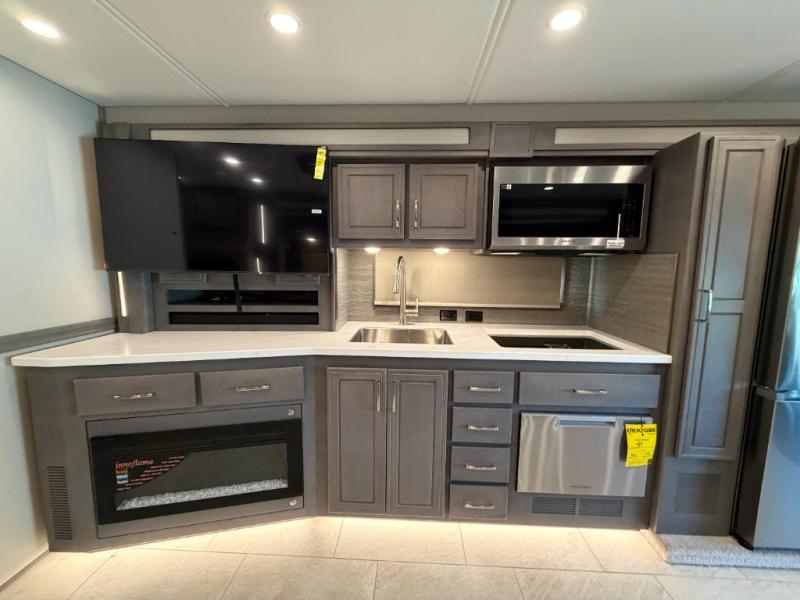 Designed for sophisticated travelers who demand the best, this motorhome is a safe bet. The rear bedroom is a serene sanctuary, featuring a majestic king-sized bed, a whisper-quiet ceiling fan, a beautifully crafted dresser base, and an expansive walk-in closet. A stunning LED TV provides entertainment, and the area is prepped for a high-end washer and dryer. The full bathroom is equipped with premium fixtures and amenities, including a spacious linen closet for storing plush towels and essentials. The charming bunk beds provide a snug and inviting sleeping spot for kids, while generous overhead cabinets offer ample storage for clothes, toys, and personal items. The kitchen is a culinary haven, equipped with a high-capacity 18 cu. refrigerator, a precision-crafted microwave, and elegant storage solutions, including a stately hutch. The dinette provides a warm and welcoming spot for meals and snacks, and a brilliant LED TV entertains.