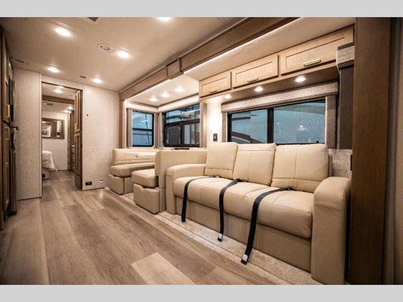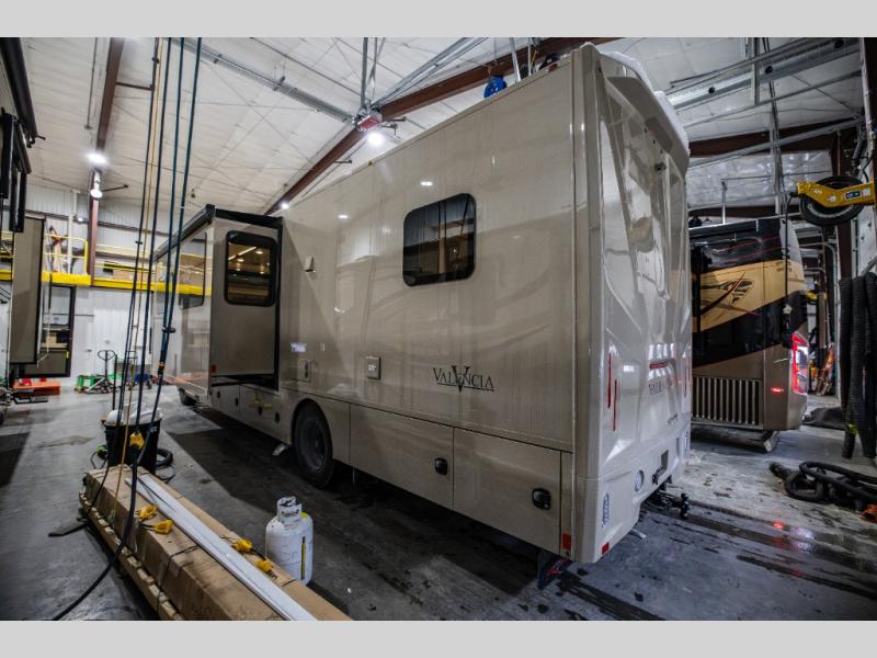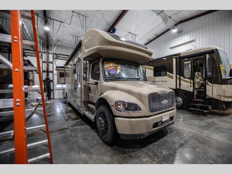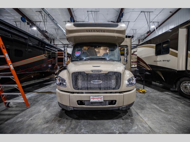 Each one of these Renegade Valencia Super C diesel motorhomes offer ultimate comfort and durable construction! They have a Freightliner S2RV chassis for a refined ride with responsive handling, as well as a powerful Cummins ISB 360 HP engine with a 3,000MH Alison transmission and a single 100 gallon fuel tank to get you farther. A few of the beautifully designed interior features are the solid hardwood cabinets, the polished solid surface countertops, and the stainless steel appliances. Travel in comfort and style with the modern furniture and abundant storage areas like the exterior steel storage compartments with carpeted lining. You will also appreciate the four point automatic hydraulic leveling system and the multiplex system with Bluetooth app control. With six colorway paint options and three interior décor options, you can be sure to find the right one for you!