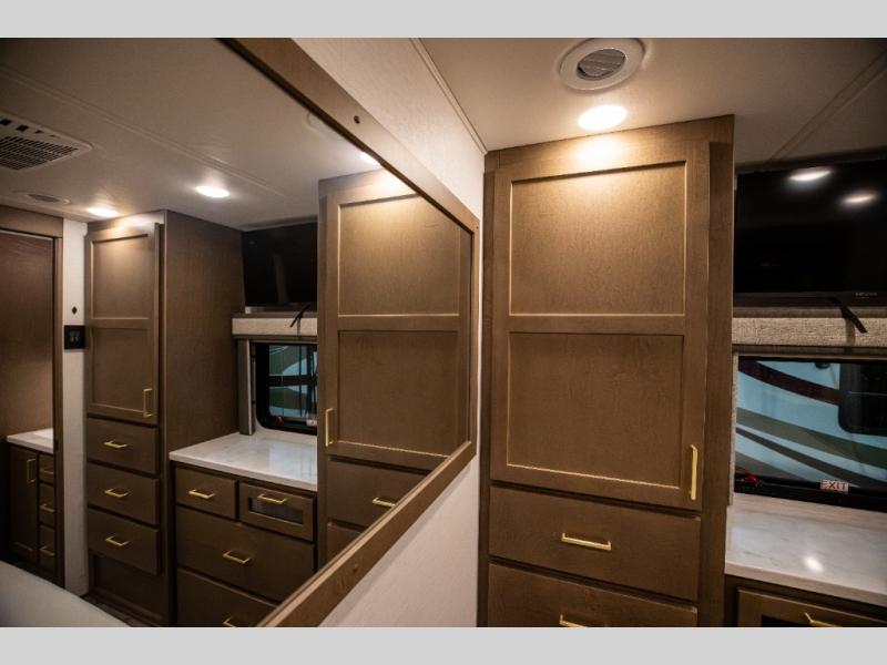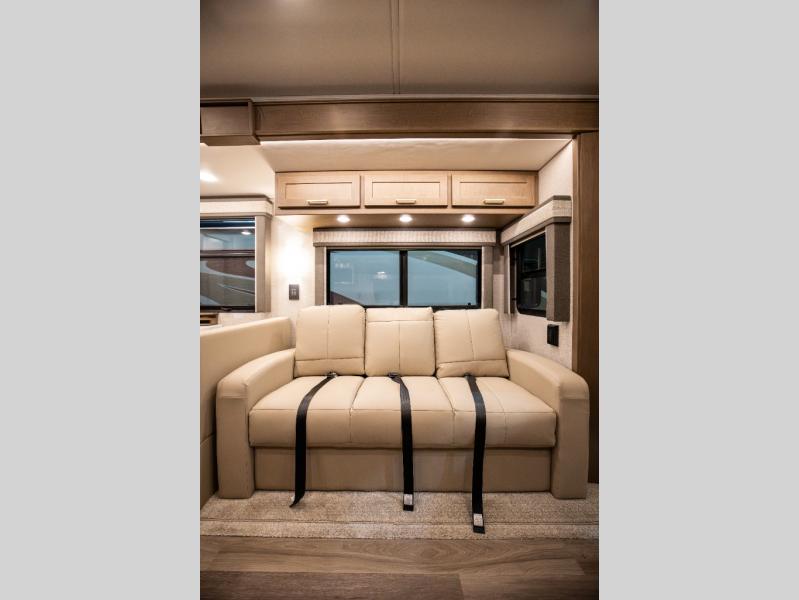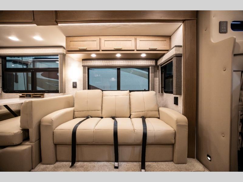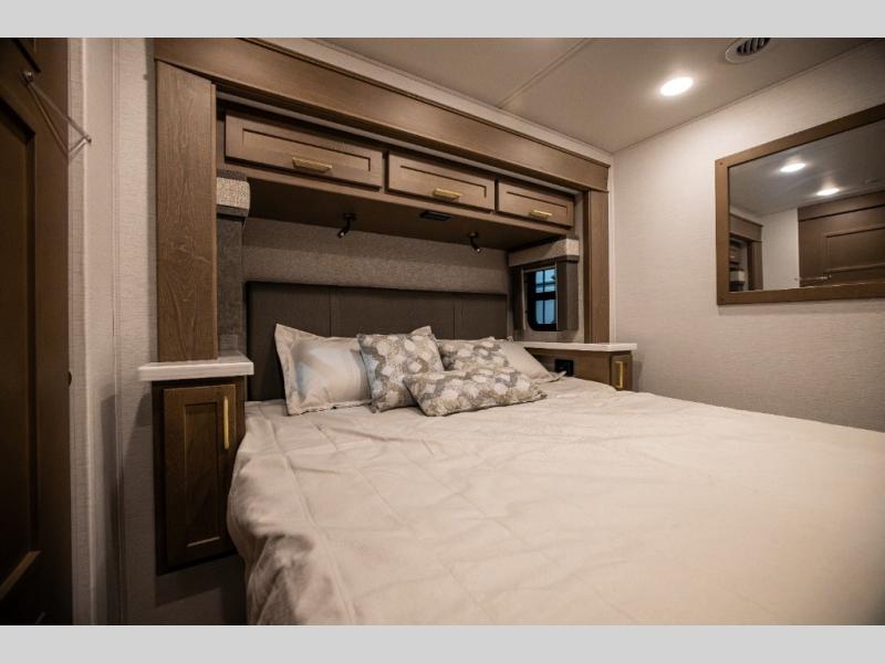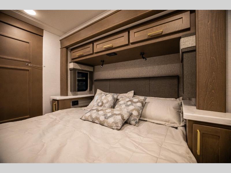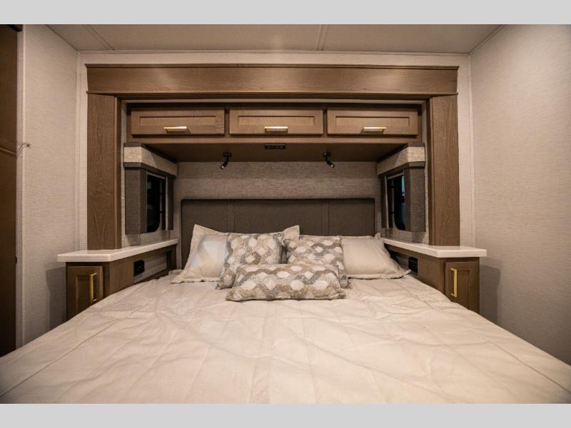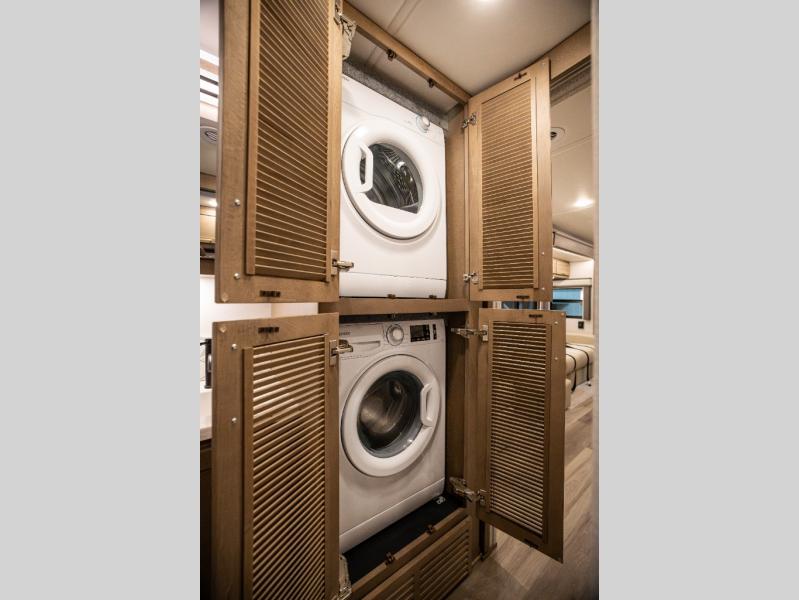 You will experience comfort and luxury with this motorhome! The rear private bedroom has a 66" x 74" mini-king bed across from a 32" Smart LED TV with a dresser below and closets on either side, plus it leads into the separated bathroom. The bathroom has a radius shower with a skylight above for natural lighting as you get ready and a closet that pre-wired and plumbed for an optional washer and dryer for clean clothes throughout your entire trip. The sofa sleeper and booth dinette offer a comfortable place to relax and convert to sleeping space. Grab a cold beverage from the 18 cu. ft. residential stainless steel refrigerator then head to the exterior entertainment center to watch the big game on the 32" Smart LED TV with a sound bar on a swivel and USB charging!