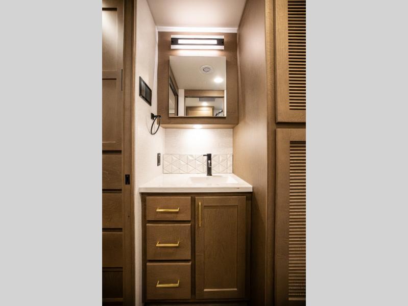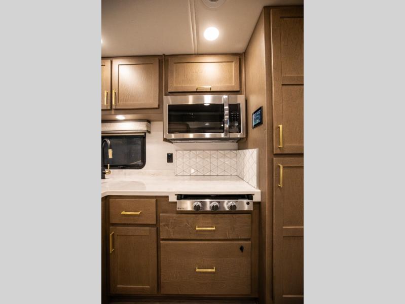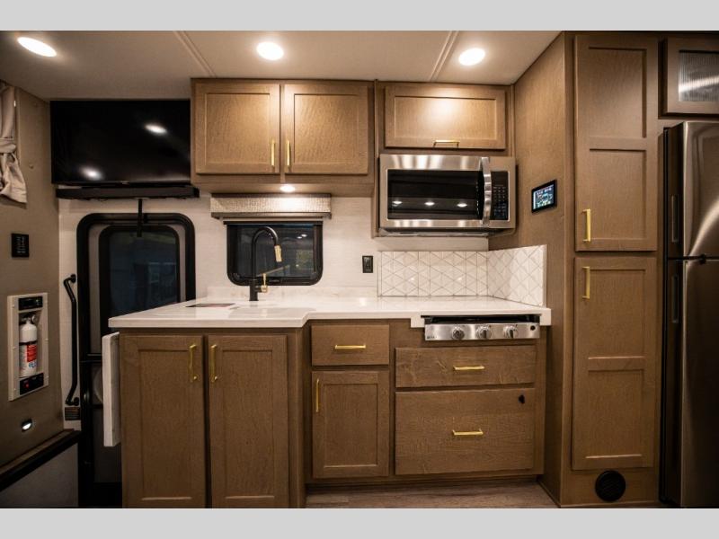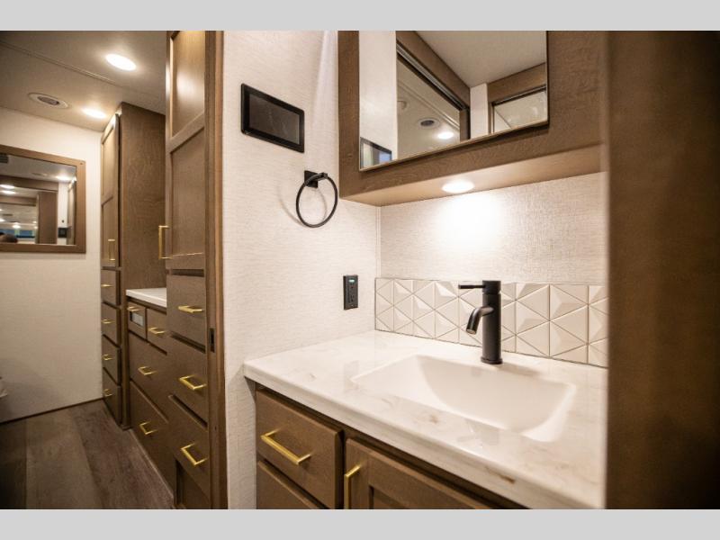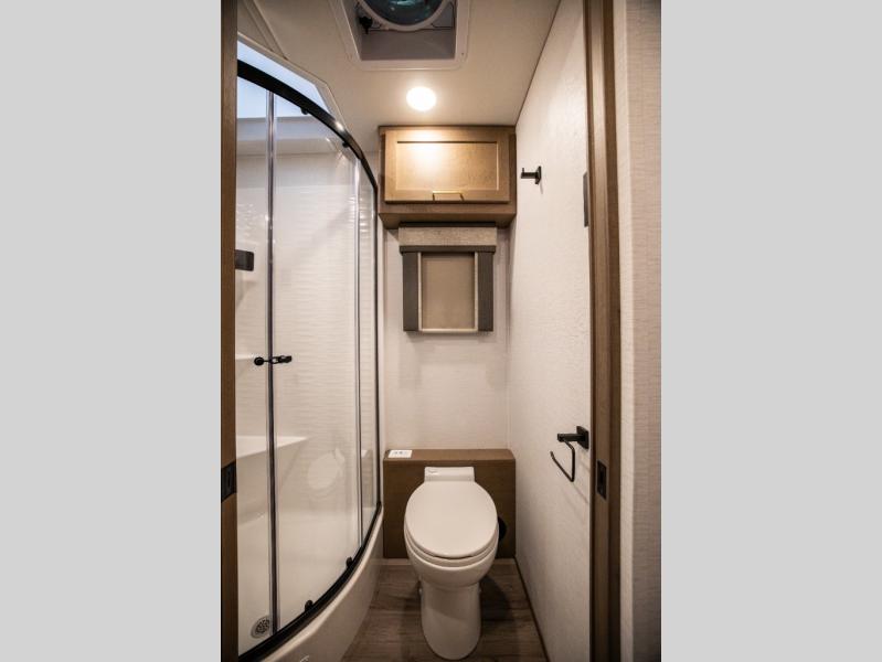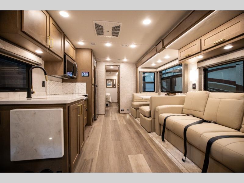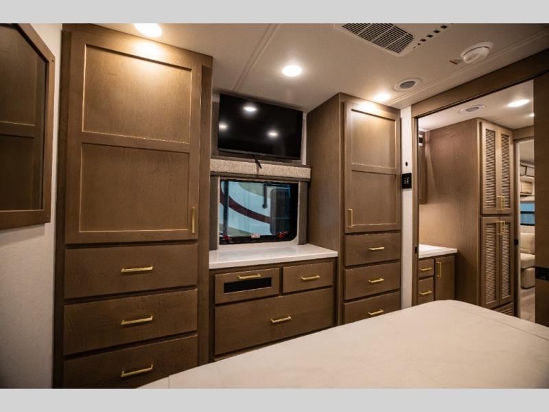 You will experience comfort and luxury with this motorhome! The rear private bedroom has a 66" x 74" mini-king bed across from a 32" Smart LED TV with a dresser below and closets on either side, plus it leads into the separated bathroom. The bathroom has a radius shower with a skylight above for natural lighting as you get ready and a closet that pre-wired and plumbed for an optional washer and dryer for clean clothes throughout your entire trip. The sofa sleeper and booth dinette offer a comfortable place to relax and convert to sleeping space. Grab a cold beverage from the 18 cu. ft. residential stainless steel refrigerator then head to the exterior entertainment center to watch the big game on the 32" Smart LED TV with a sound bar on a swivel and USB charging!