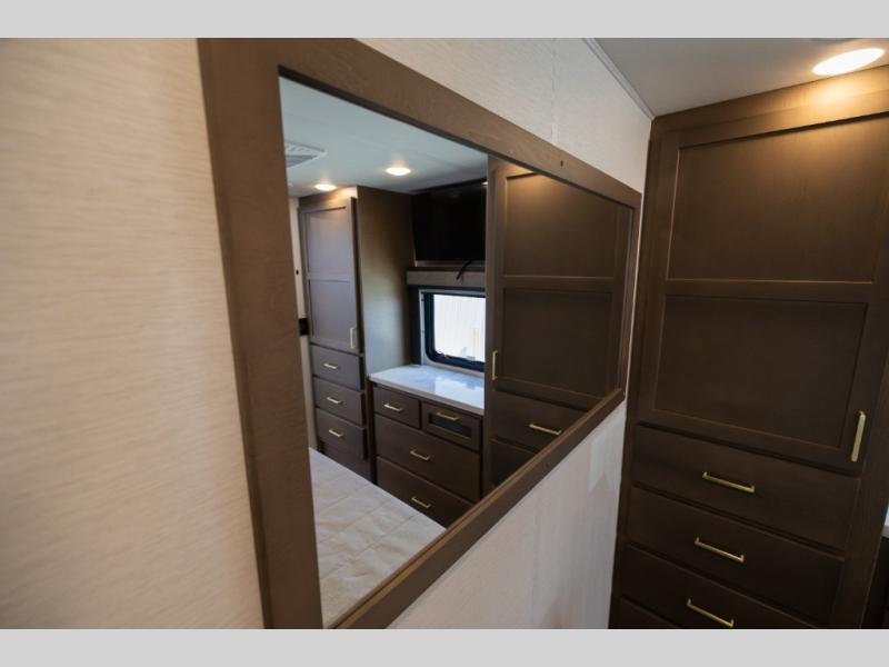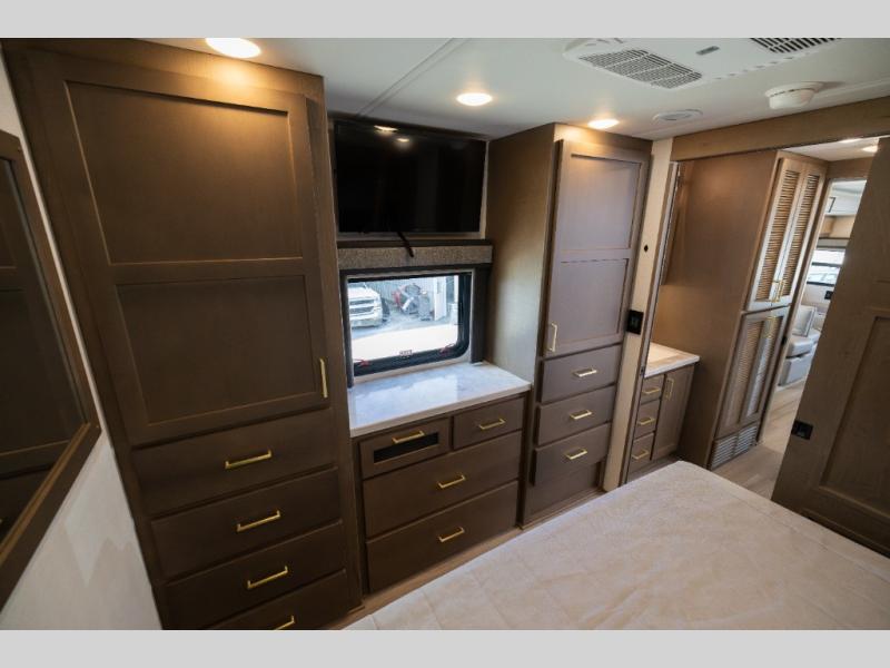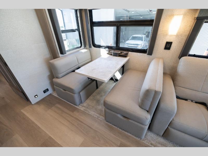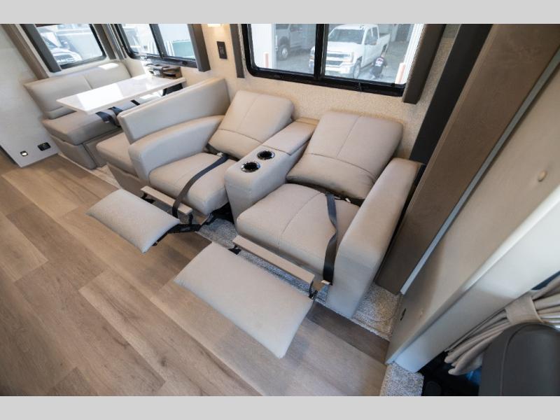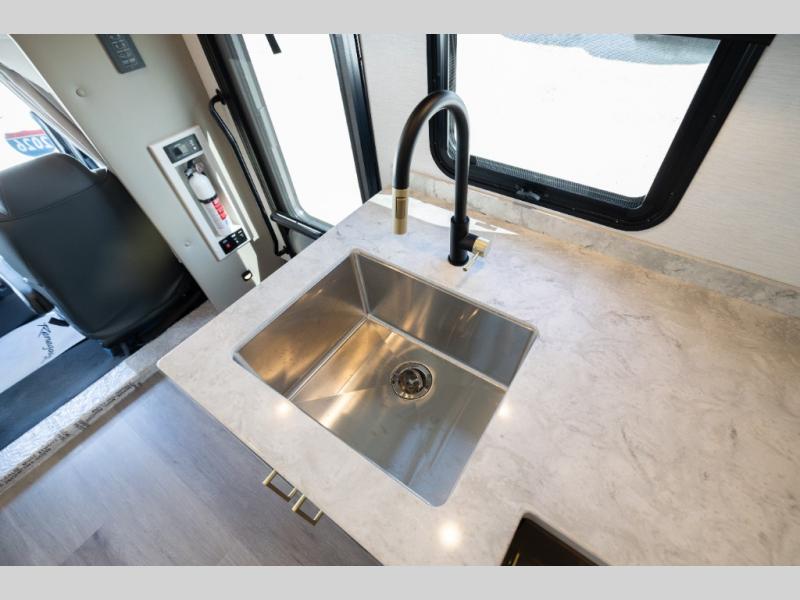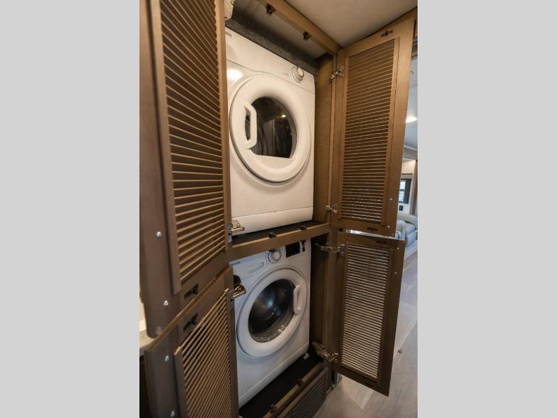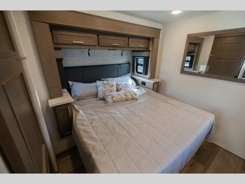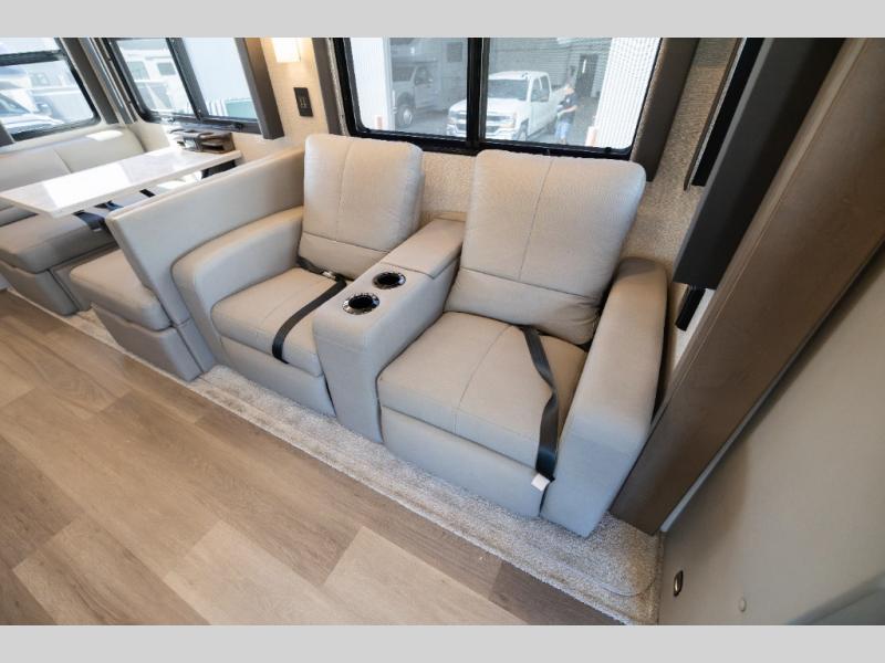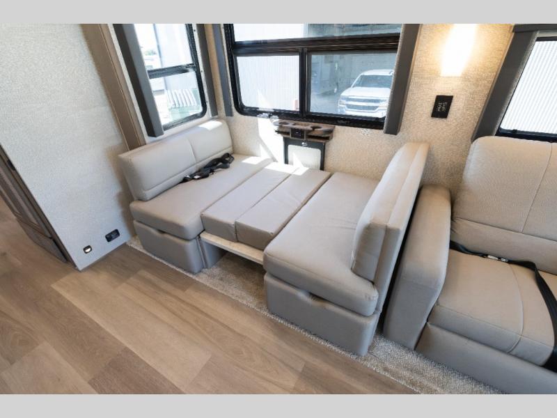 You will experience comfort and luxury with this motorhome! The rear private bedroom has a 66" x 74" mini-king bed across from a 32" Smart LED TV with a dresser below and closets on either side, plus it leads into the separated bathroom. The bathroom has a radius shower with a skylight above for natural lighting as you get ready and a closet that pre-wired and plumbed for an optional washer and dryer for clean clothes throughout your entire trip. The sofa sleeper and booth dinette offer a comfortable place to relax and convert to sleeping space. Grab a cold beverage from the 18 cu. ft. residential stainless steel refrigerator then head to the exterior entertainment center to watch the big game on the 32" Smart LED TV with a sound bar on a swivel and USB charging!