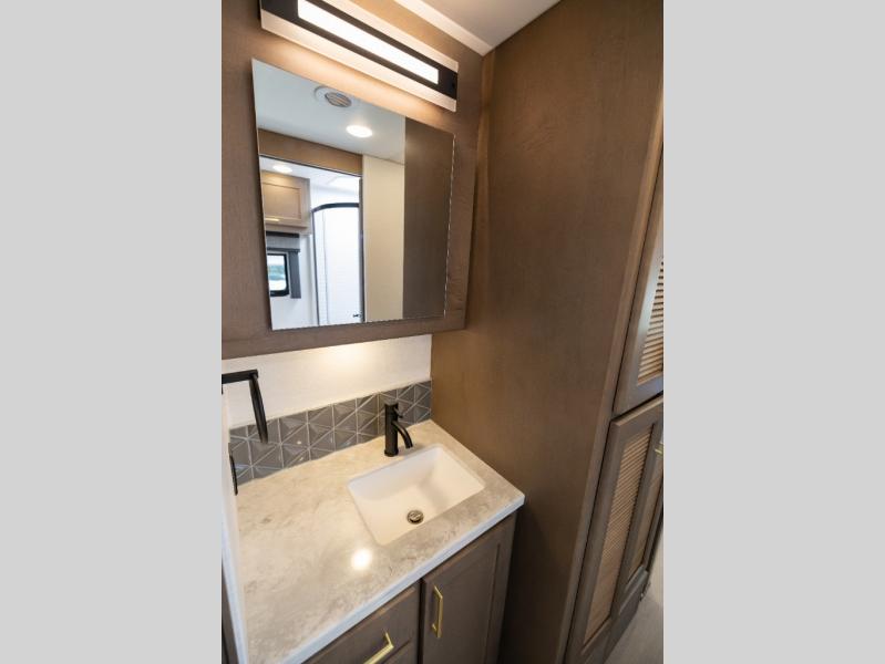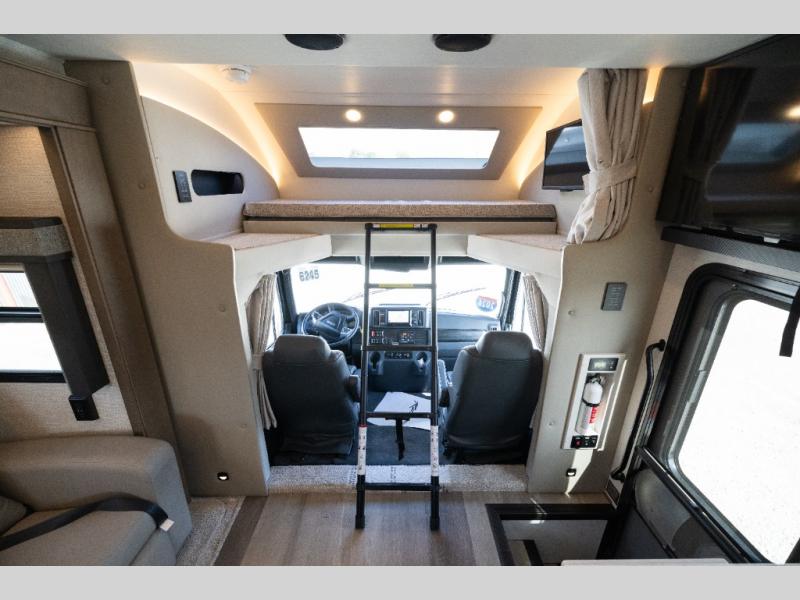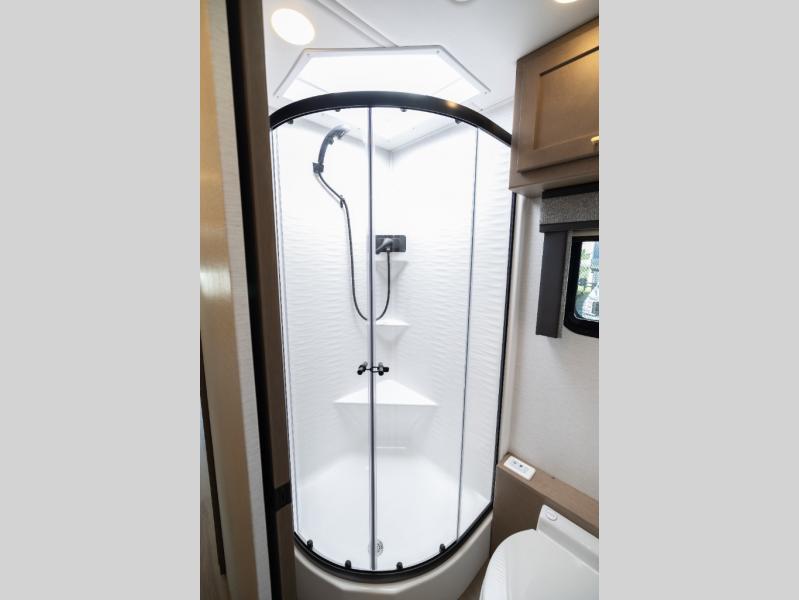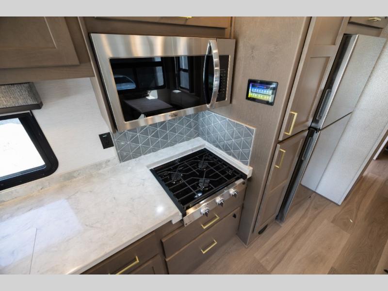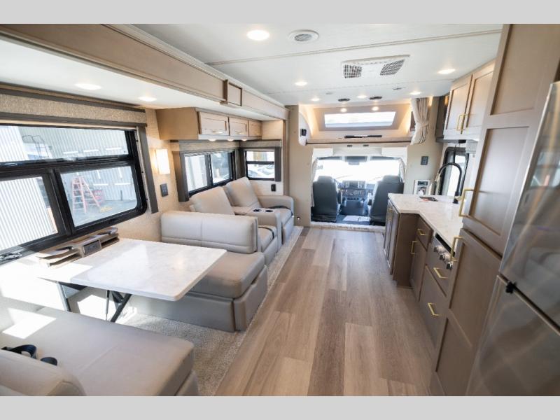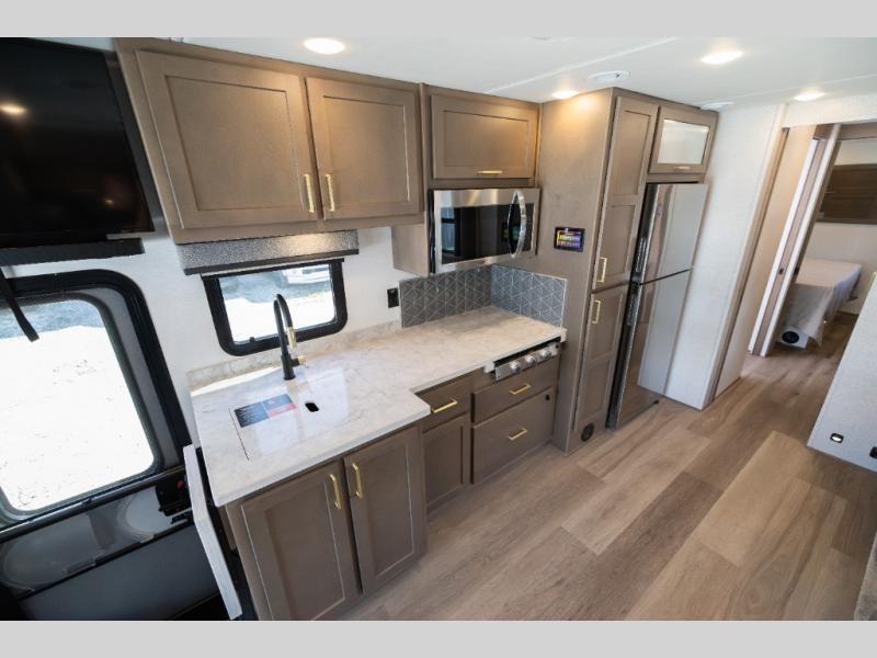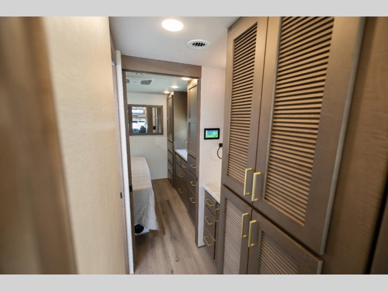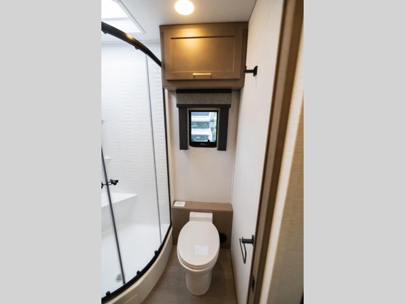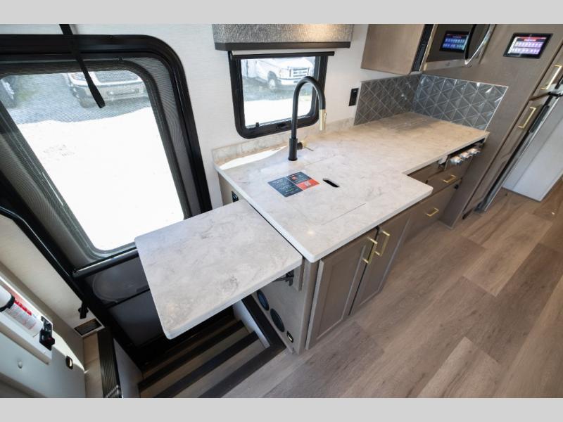You will experience comfort and luxury with this motorhome! The rear private bedroom has a 66" x 74" mini-king bed across from a 32" Smart LED TV with a dresser below and closets on either side, plus it leads into the separated bathroom. The bathroom has a radius shower with a skylight above for natural lighting as you get ready and a closet that pre-wired and plumbed for an optional washer and dryer for clean clothes throughout your entire trip. The sofa sleeper and booth dinette offer a comfortable place to relax and convert to sleeping space. Grab a cold beverage from the 18 cu. ft. residential stainless steel refrigerator then head to the exterior entertainment center to watch the big game on the 32" Smart LED TV with a sound bar on a swivel and USB charging!