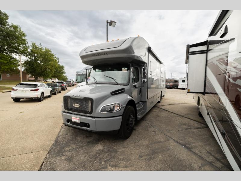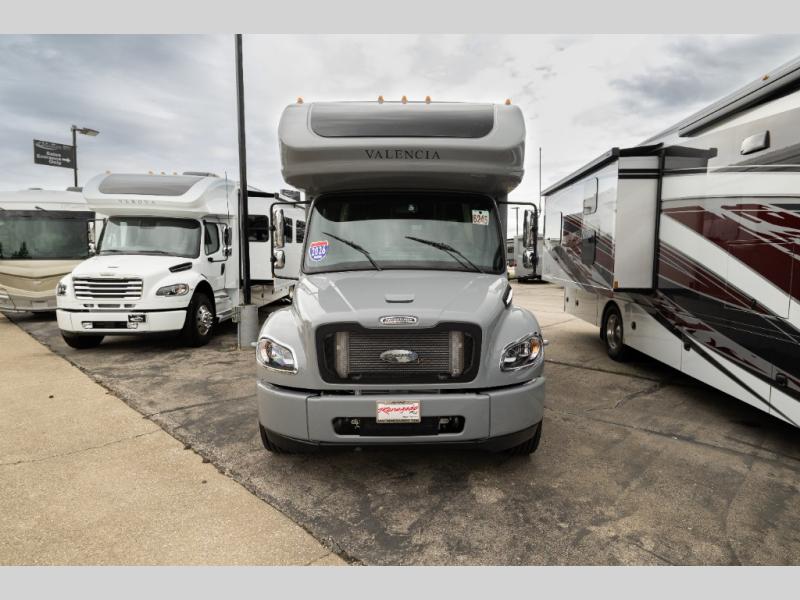 Each one of these Renegade Valencia Super C diesel motorhomes offer ultimate comfort and durable construction! They have a Freightliner S2RV chassis for a refined ride with responsive handling, as well as a powerful Cummins ISB 360 HP engine with a 3,000MH Alison transmission and a single 100 gallon fuel tank to get you farther. A few of the beautifully designed interior features are the solid hardwood cabinets, the polished solid surface countertops, and the stainless steel appliances. Travel in comfort and style with the modern furniture and abundant storage areas like the exterior steel storage compartments with carpeted lining. You will also appreciate the four point automatic hydraulic leveling system and the multiplex system with Bluetooth app control. With six colorway paint options and three interior décor options, you can be sure to find the right one for you!