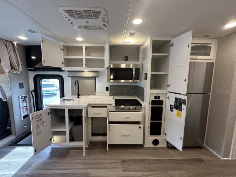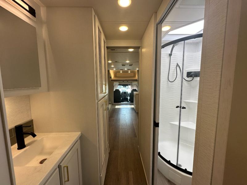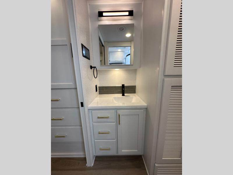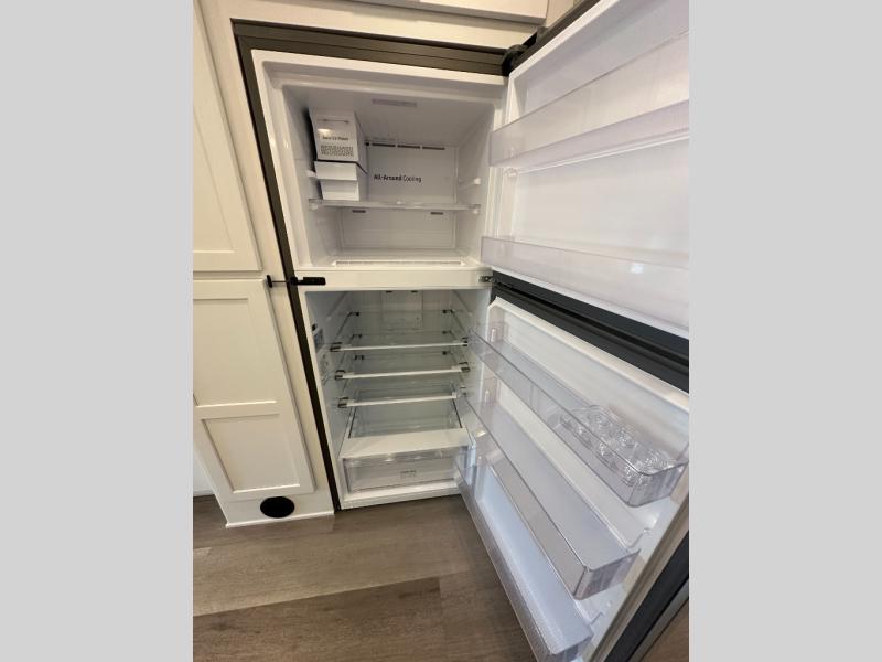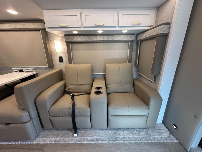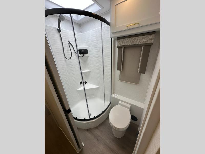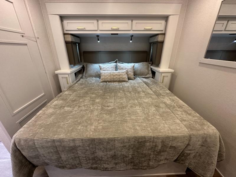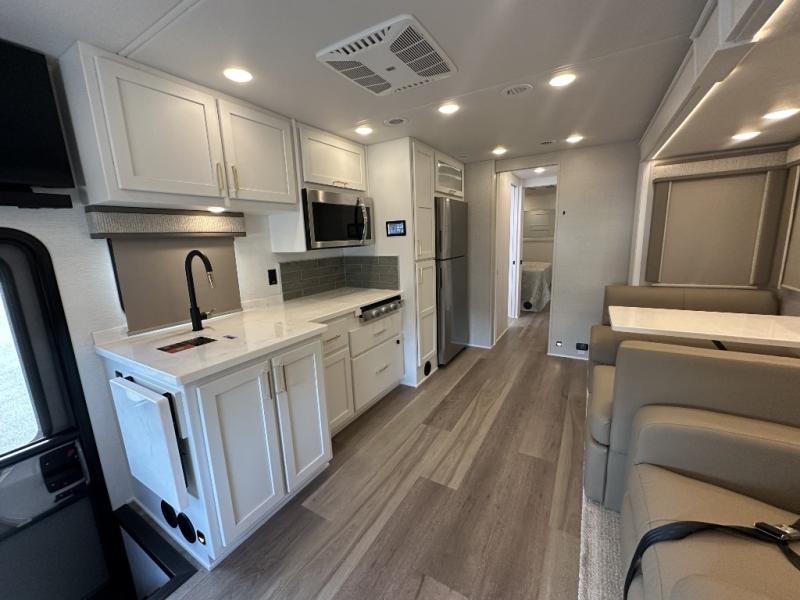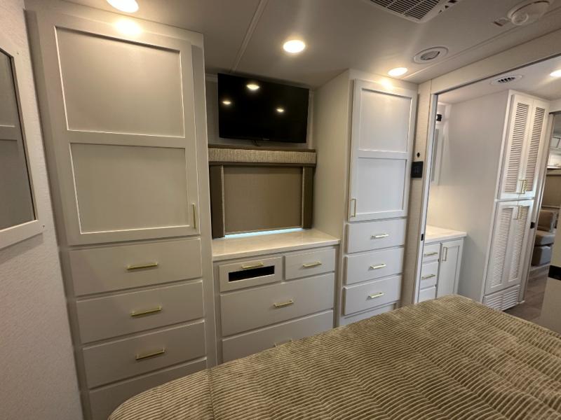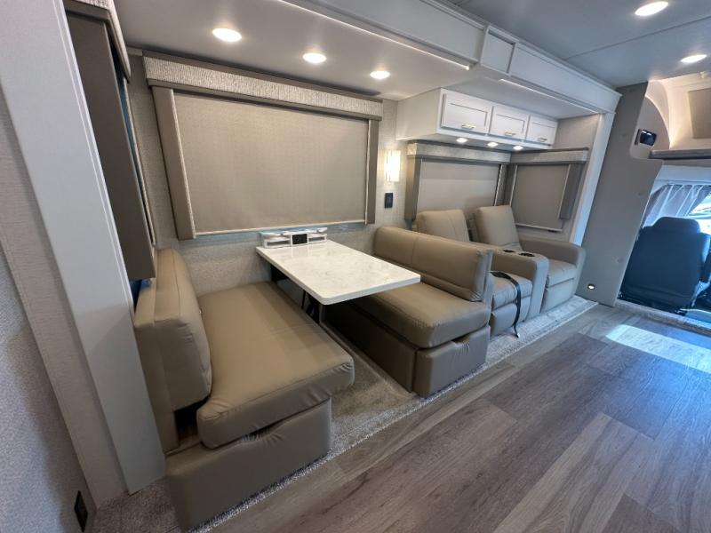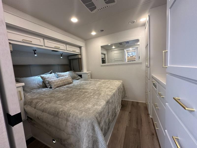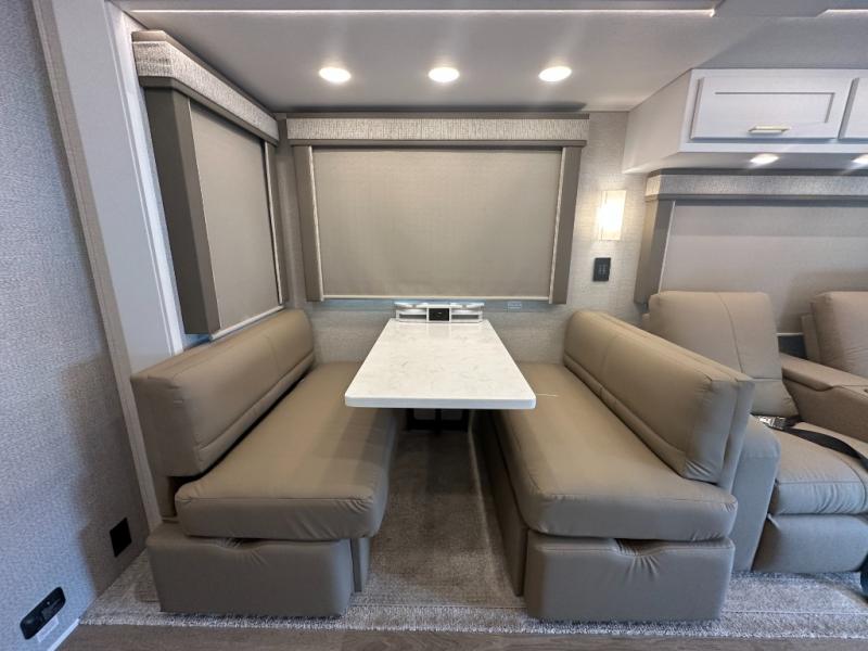 You will experience comfort and luxury with this motorhome! The rear private bedroom has a 66" x 74" mini-king bed across from a 32" Smart LED TV with a dresser below and closets on either side, plus it leads into the separated bathroom. The bathroom has a radius shower with a skylight above for natural lighting as you get ready and a closet that pre-wired and plumbed for an optional washer and dryer for clean clothes throughout your entire trip. The sofa sleeper and booth dinette offer a comfortable place to relax and convert to sleeping space. Grab a cold beverage from the 18 cu. ft. residential stainless steel refrigerator then head to the exterior entertainment center to watch the big game on the 32" Smart LED TV with a sound bar on a swivel and USB charging!