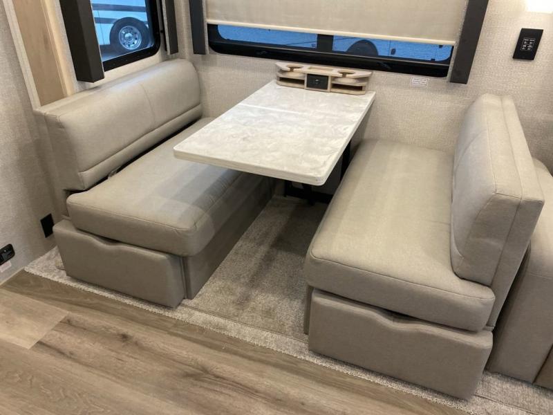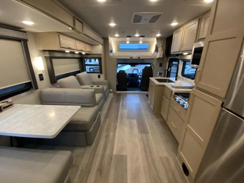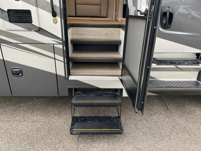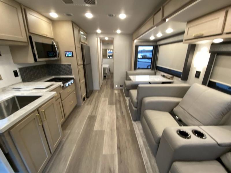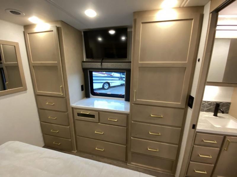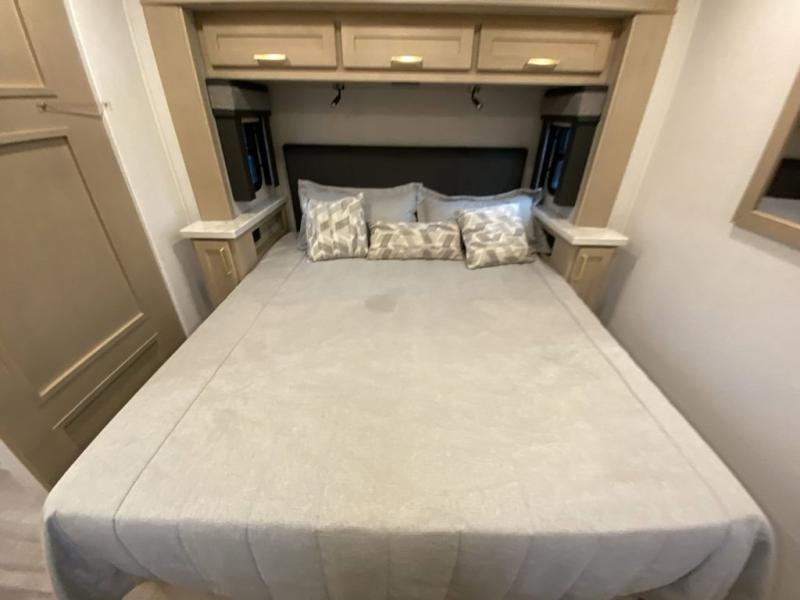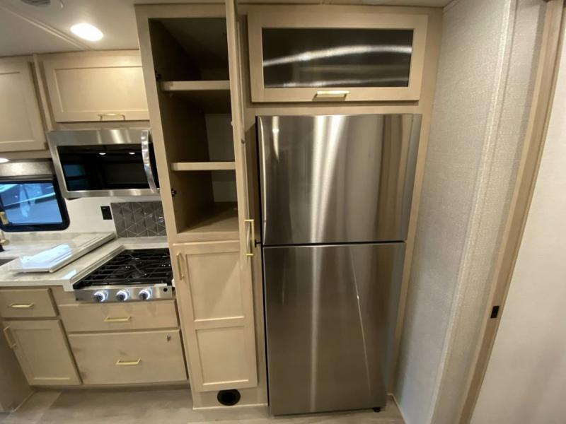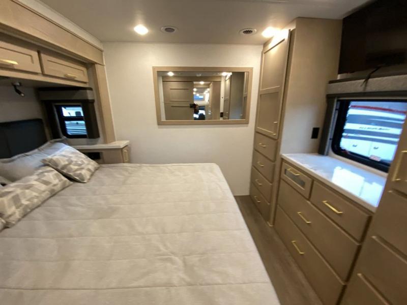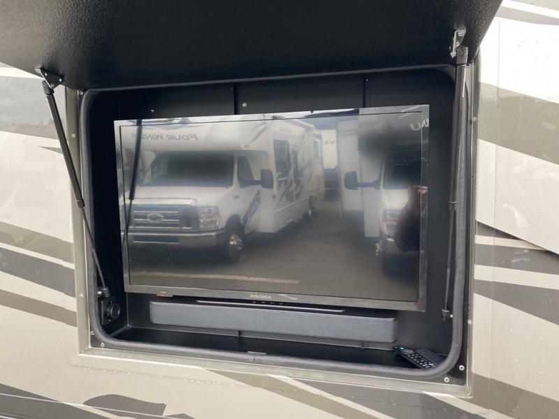 You will experience comfort and luxury with this motorhome! The rear private bedroom has a 66" x 74" mini-king bed across from a 32" Smart LED TV with a dresser below and closets on either side, plus it leads into the separated bathroom. The bathroom has a radius shower with a skylight above for natural lighting as you get ready and a closet that pre-wired and plumbed for an optional washer and dryer for clean clothes throughout your entire trip. The sofa sleeper and booth dinette offer a comfortable place to relax and convert to sleeping space. Grab a cold beverage from the 18 cu. ft. residential stainless steel refrigerator then head to the exterior entertainment center to watch the big game on the 32" Smart LED TV with a sound bar on a swivel and USB charging!