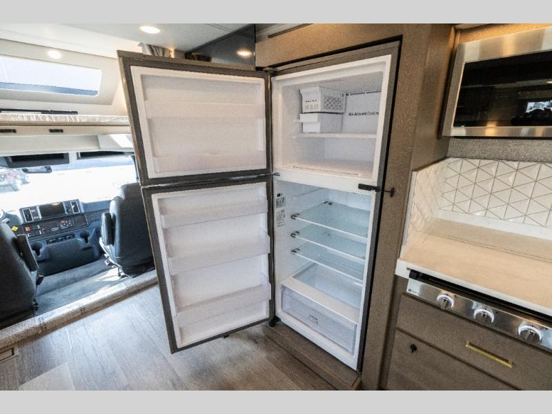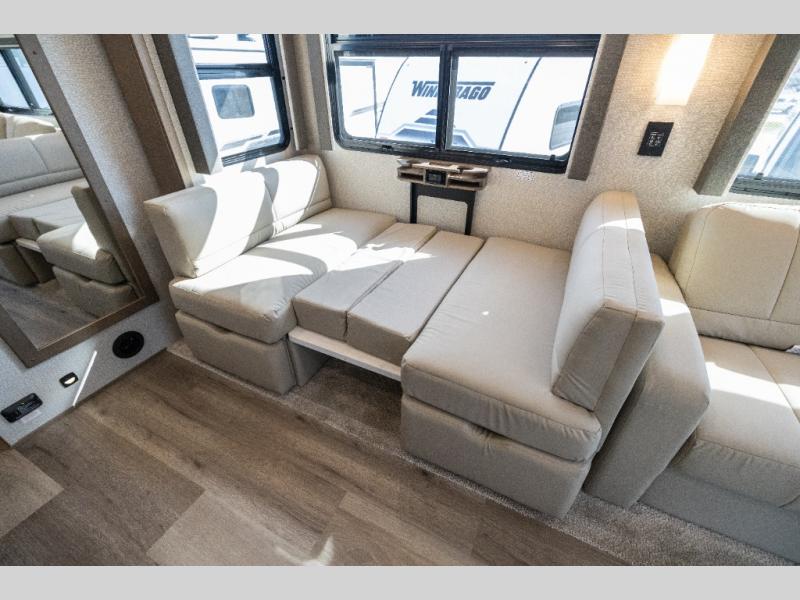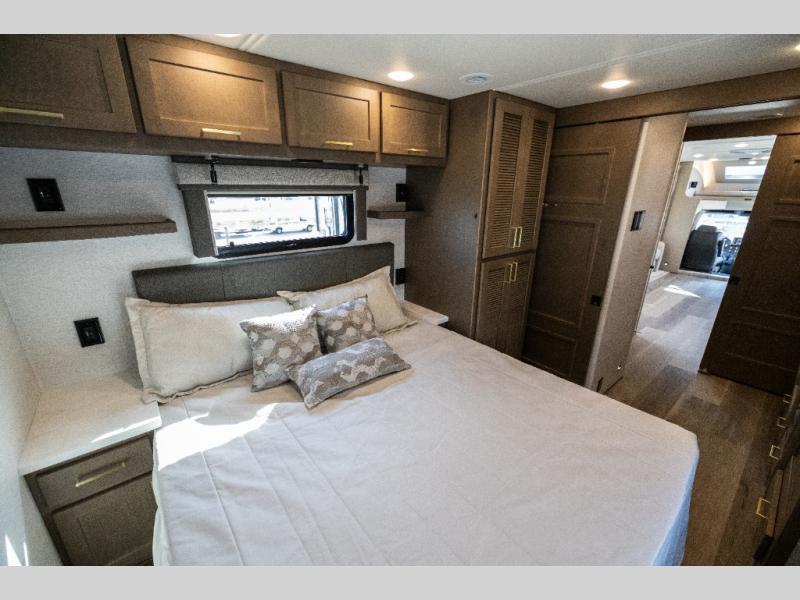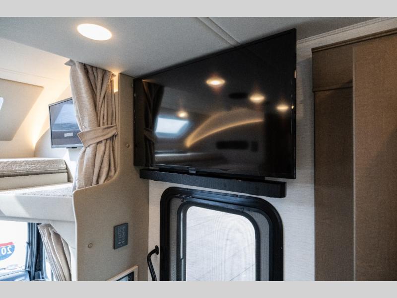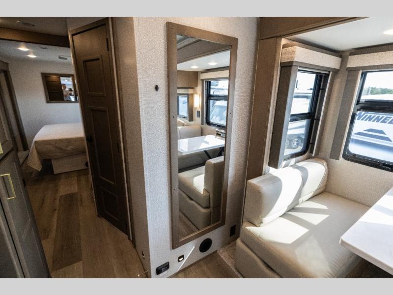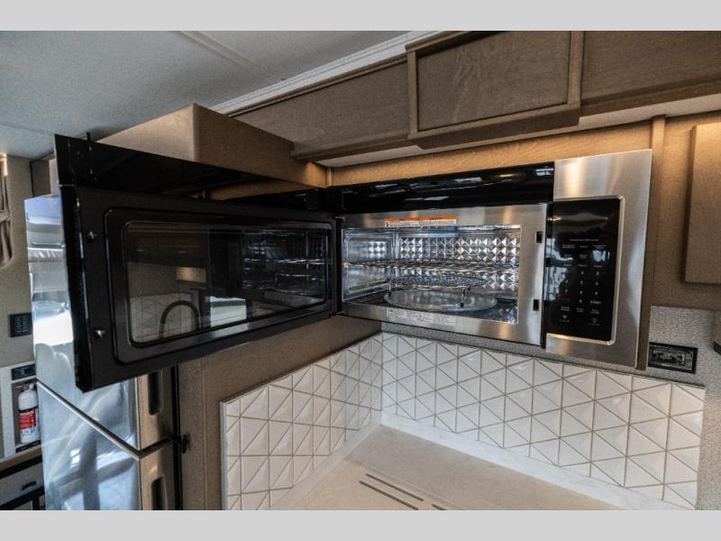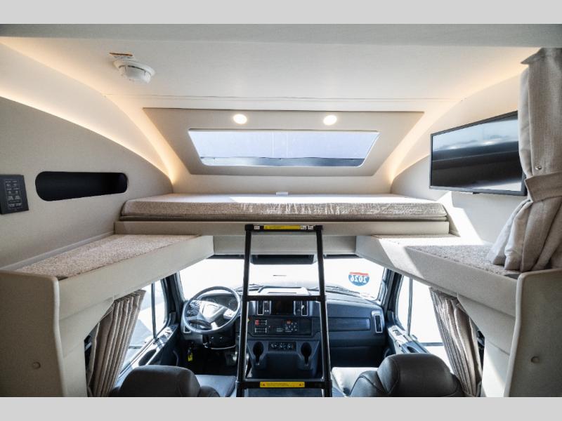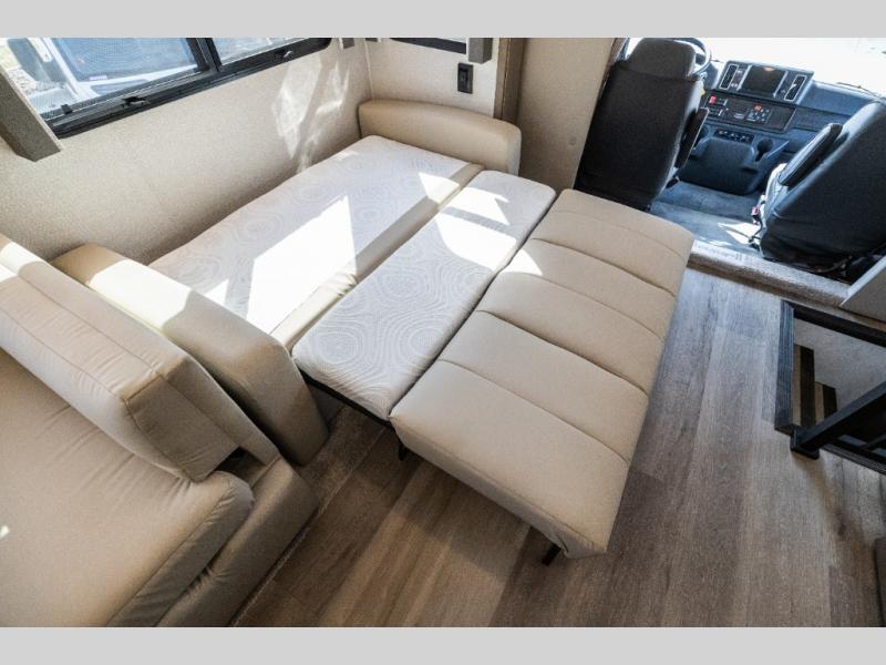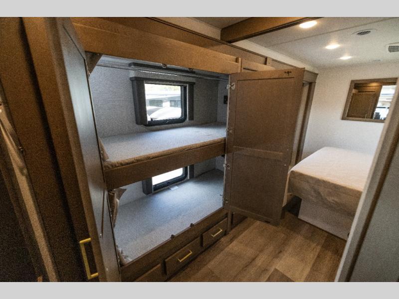 Pack your bags and load up this motorhome for a luxurious road trip! The rear private bedroom has a 66" x 74" mini-king bed to lay your head on at night, a dresser base with a 32" Smart LED TV above it, and closets on either side of it. Your kiddos or guests can sleep on the set of 30" x 76" bunk beds and the 54" x 78" bunk over cab. Or utilize the sofa sleeper and the booth dinette which convert to even more sleeping spaces. Create your best meals with the three burner cooktop and keep your perishables fresh with the 18 cu. ft. stainless steel residential refrigerator. And you will love having a mid bath for easy use!