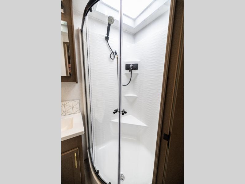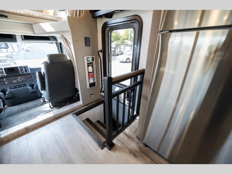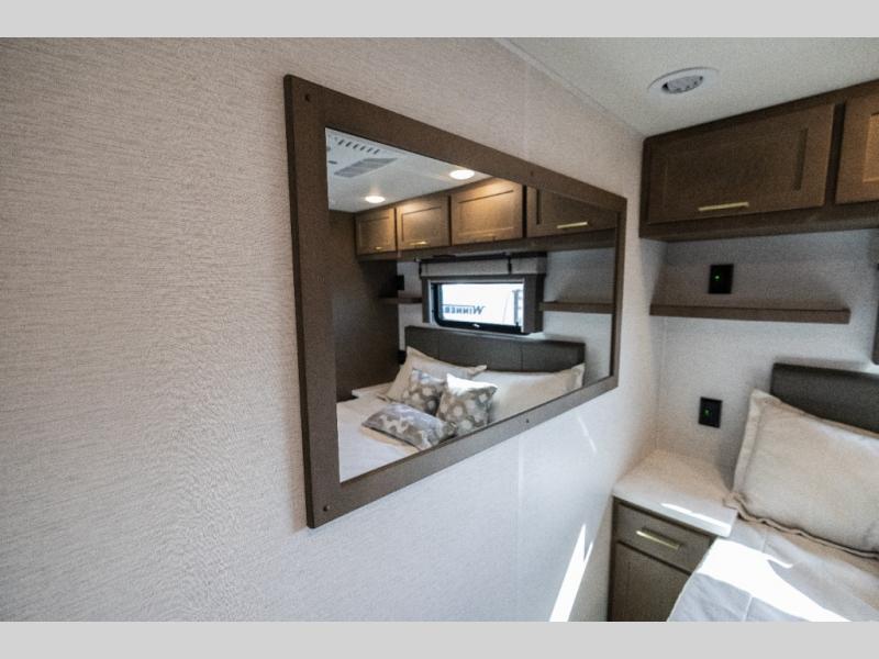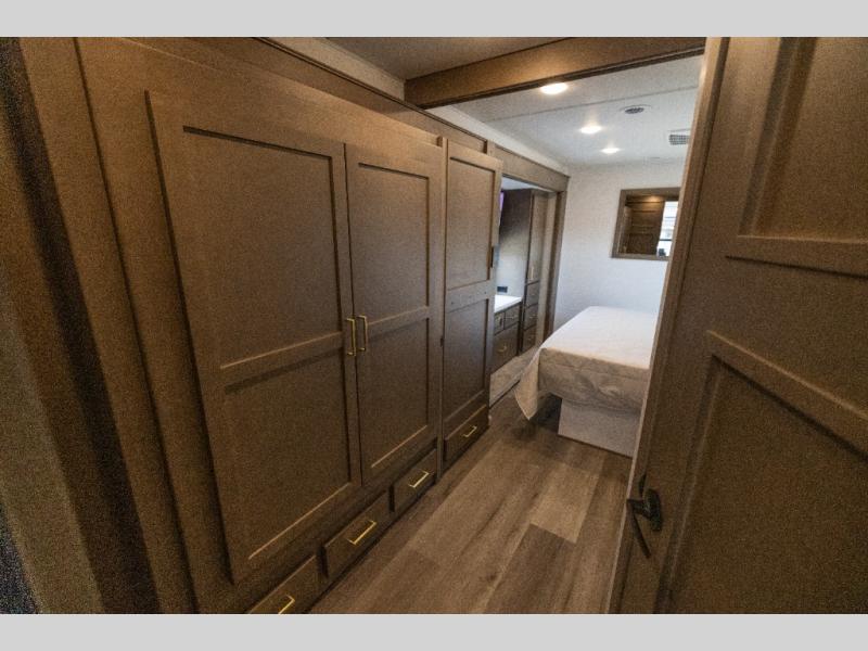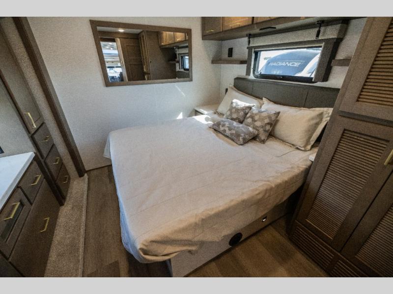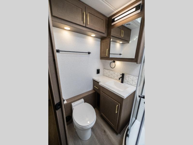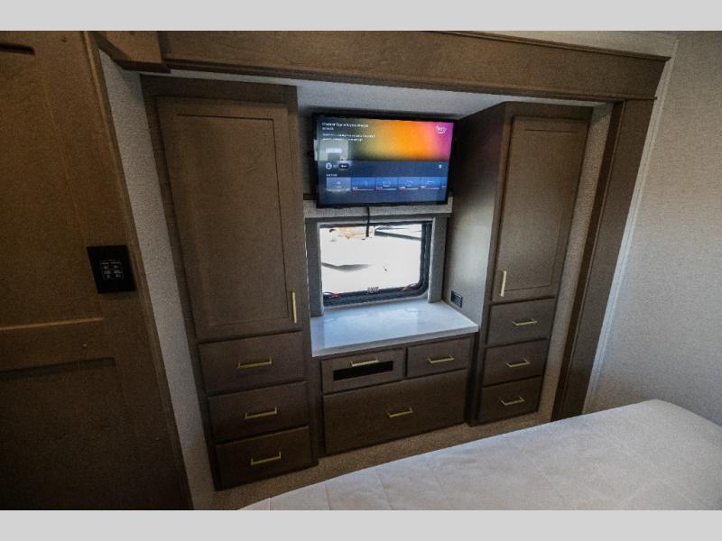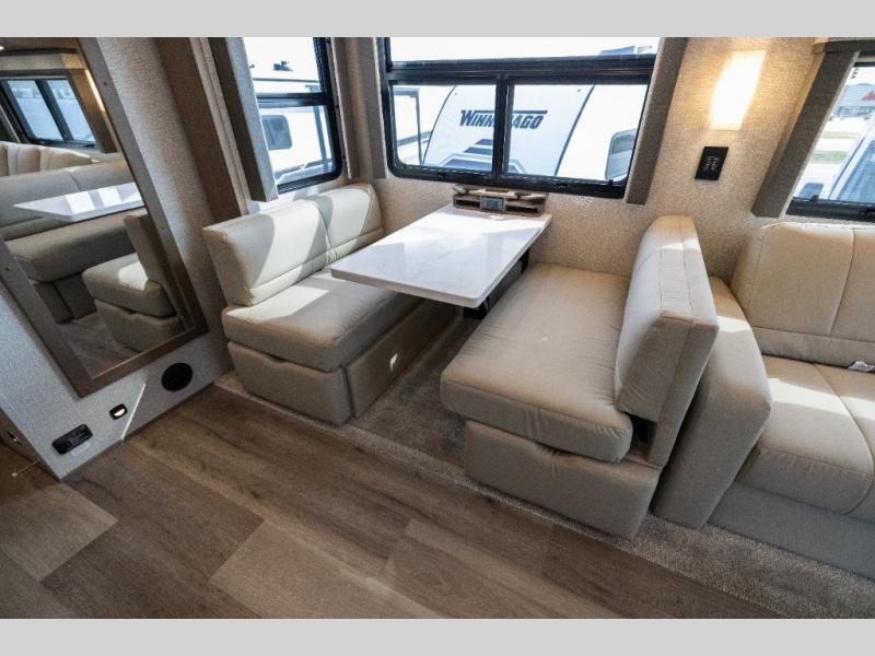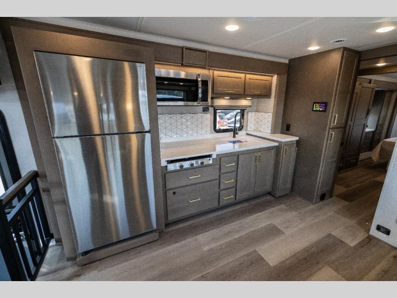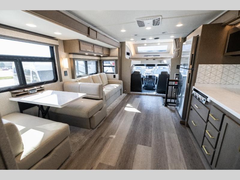 Pack your bags and load up this motorhome for a luxurious road trip! The rear private bedroom has a 66" x 74" mini-king bed to lay your head on at night, a dresser base with a 32" Smart LED TV above it, and closets on either side of it. Your kiddos or guests can sleep on the set of 30" x 76" bunk beds and the 54" x 78" bunk over cab. Or utilize the sofa sleeper and the booth dinette which convert to even more sleeping spaces. Create your best meals with the three burner cooktop and keep your perishables fresh with the 18 cu. ft. stainless steel residential refrigerator. And you will love having a mid bath for easy use!