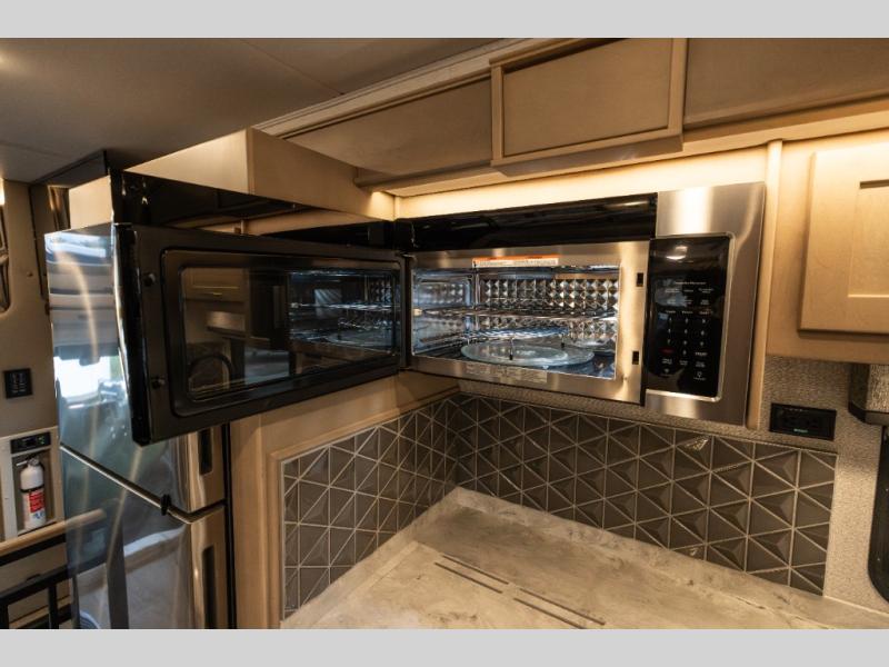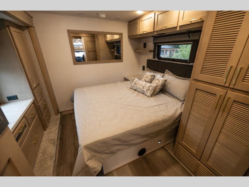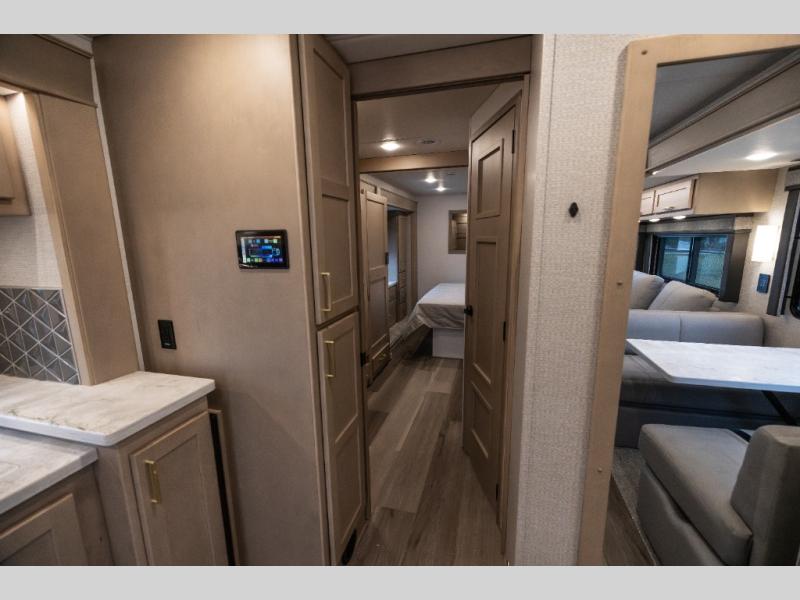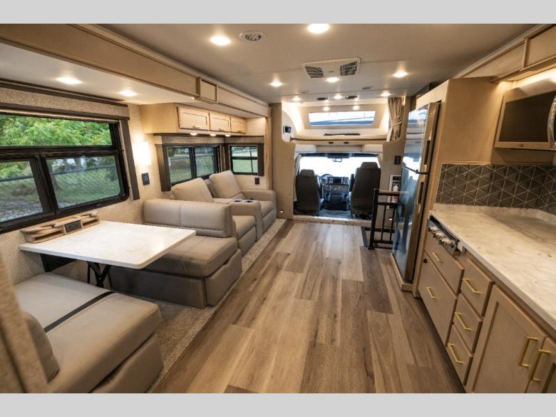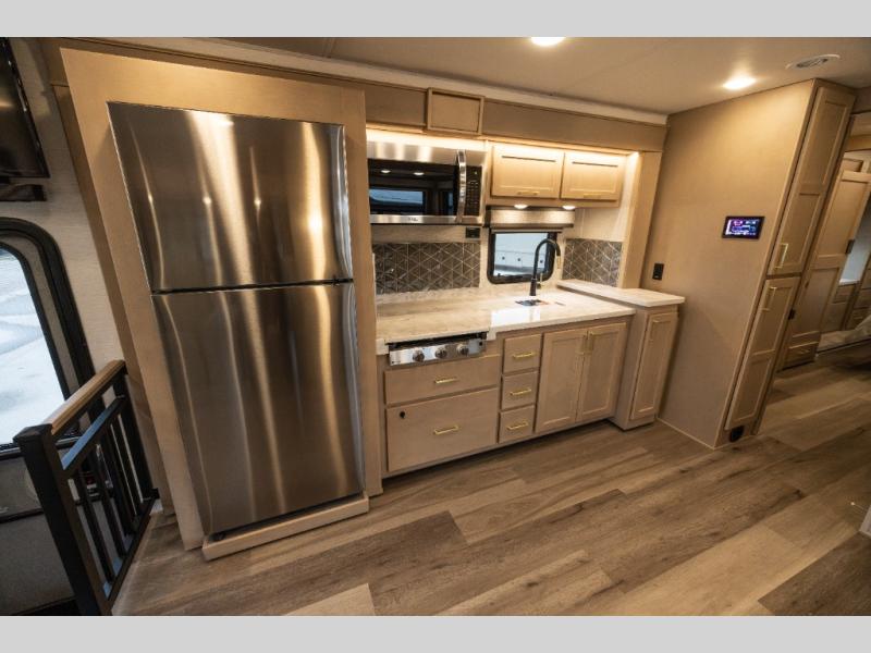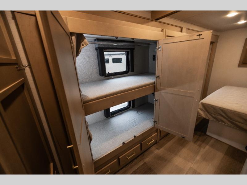 Pack your bags and load up this motorhome for a luxurious road trip! The rear private bedroom has a 66" x 74" mini-king bed to lay your head on at night, a dresser base with a 32" Smart LED TV above it, and closets on either side of it. Your kiddos or guests can sleep on the set of 30" x 76" bunk beds and the 54" x 78" bunk over cab. Or utilize the sofa sleeper and the booth dinette which convert to even more sleeping spaces. Create your best meals with the three burner cooktop and keep your perishables fresh with the 18 cu. ft. stainless steel residential refrigerator. And you will love having a mid bath for easy use!