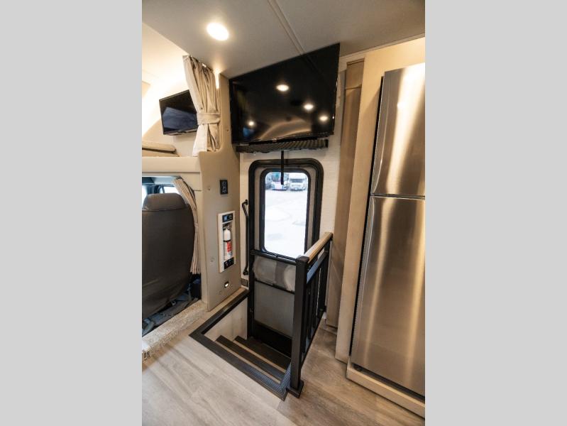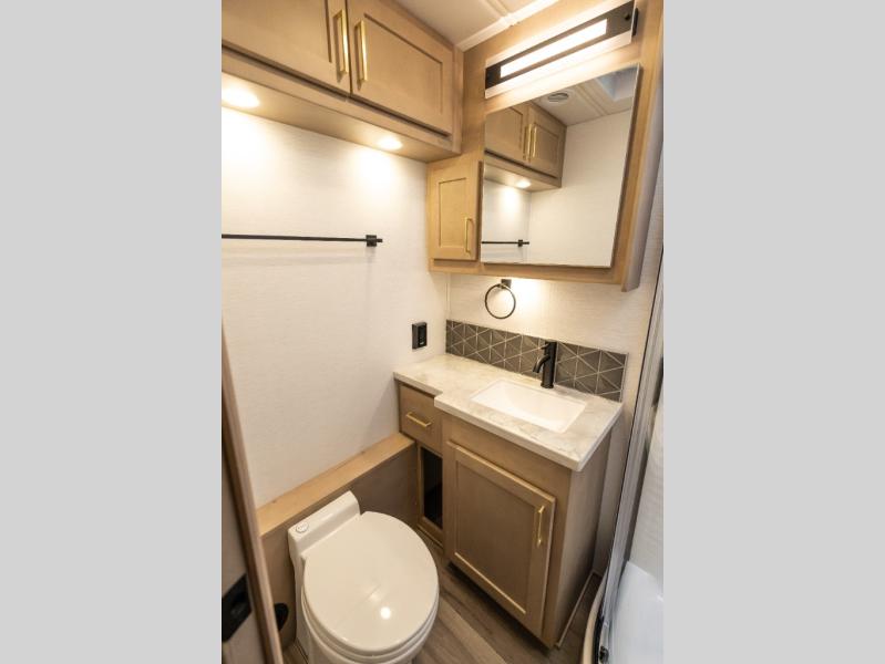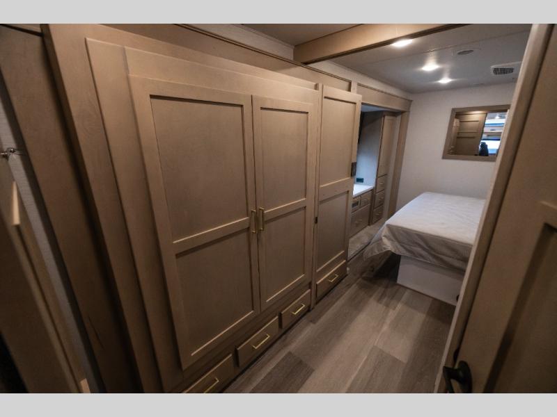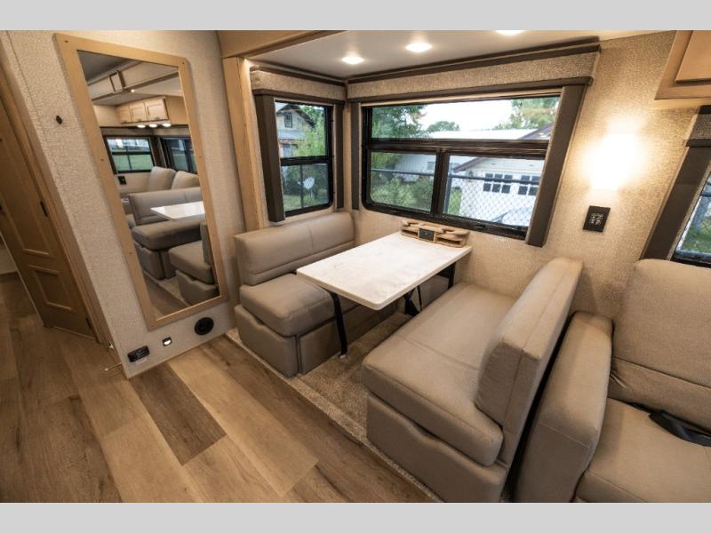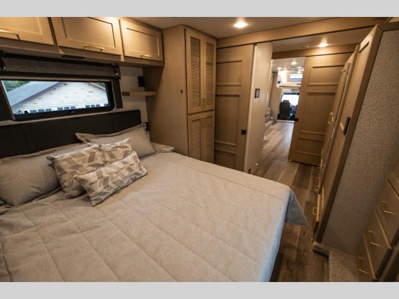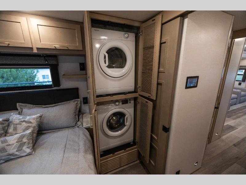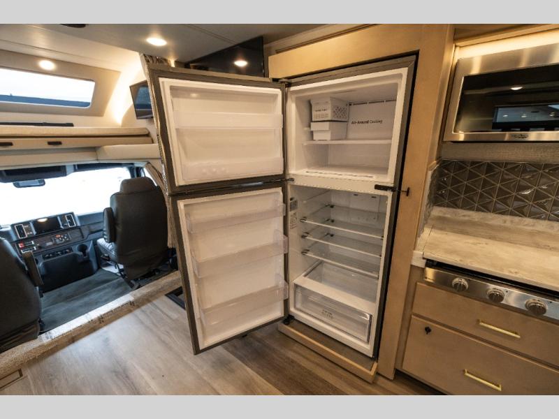 Pack your bags and load up this motorhome for a luxurious road trip! The rear private bedroom has a 66" x 74" mini-king bed to lay your head on at night, a dresser base with a 32" Smart LED TV above it, and closets on either side of it. Your kiddos or guests can sleep on the set of 30" x 76" bunk beds and the 54" x 78" bunk over cab. Or utilize the sofa sleeper and the booth dinette which convert to even more sleeping spaces. Create your best meals with the three burner cooktop and keep your perishables fresh with the 18 cu. ft. stainless steel residential refrigerator. And you will love having a mid bath for easy use!