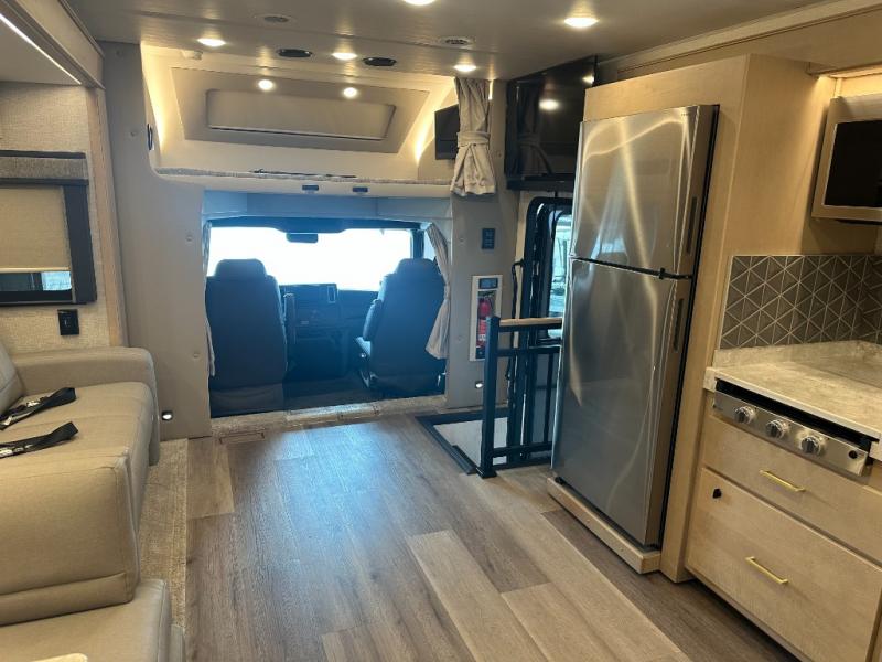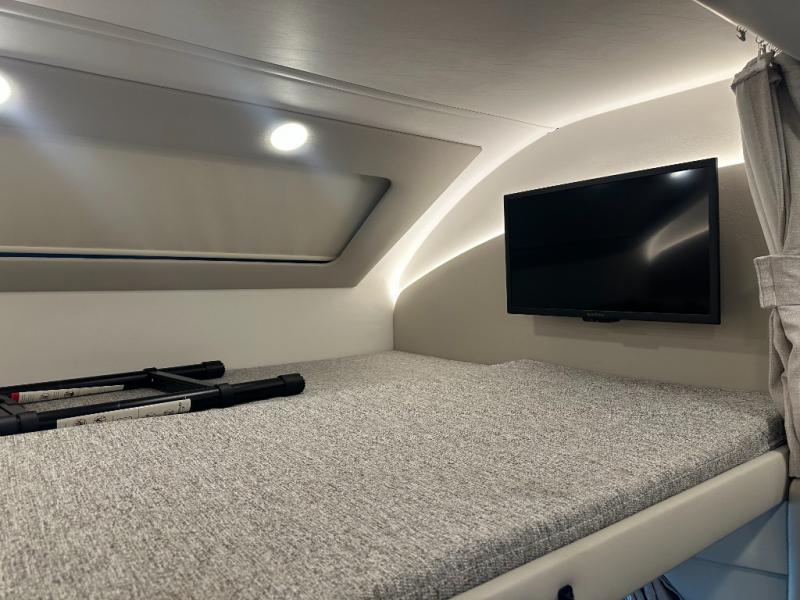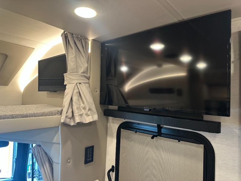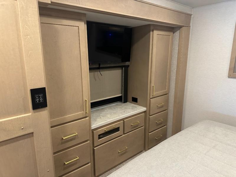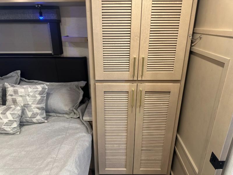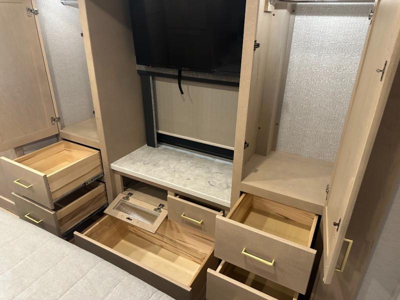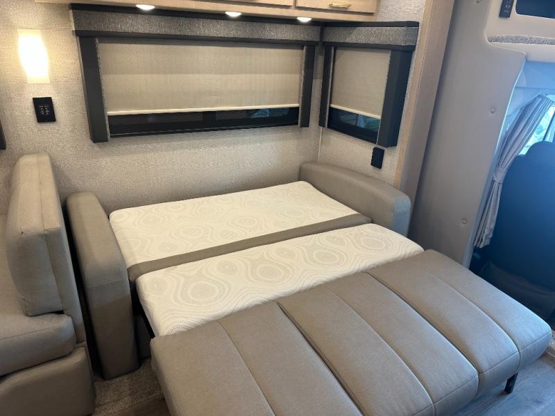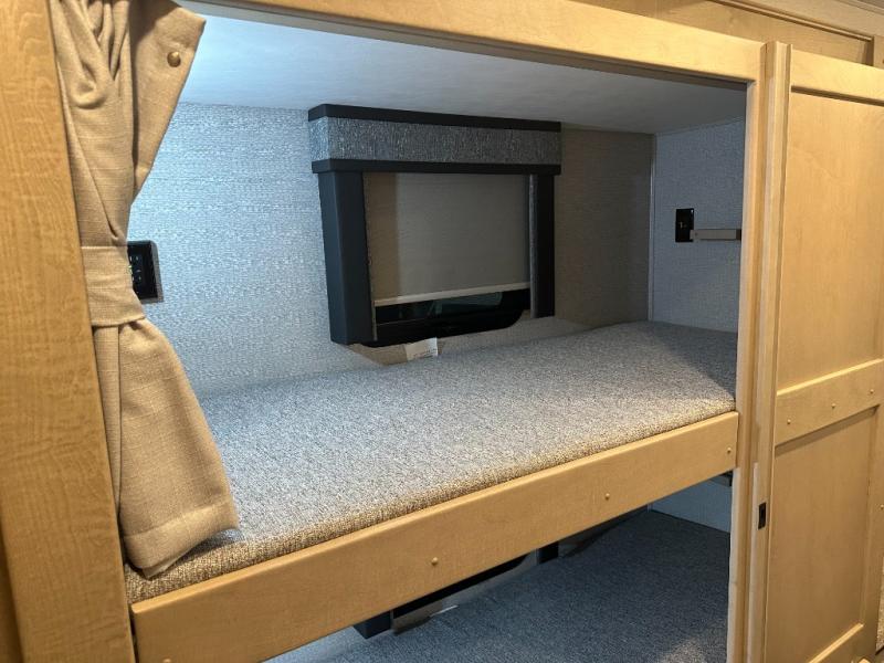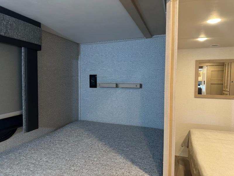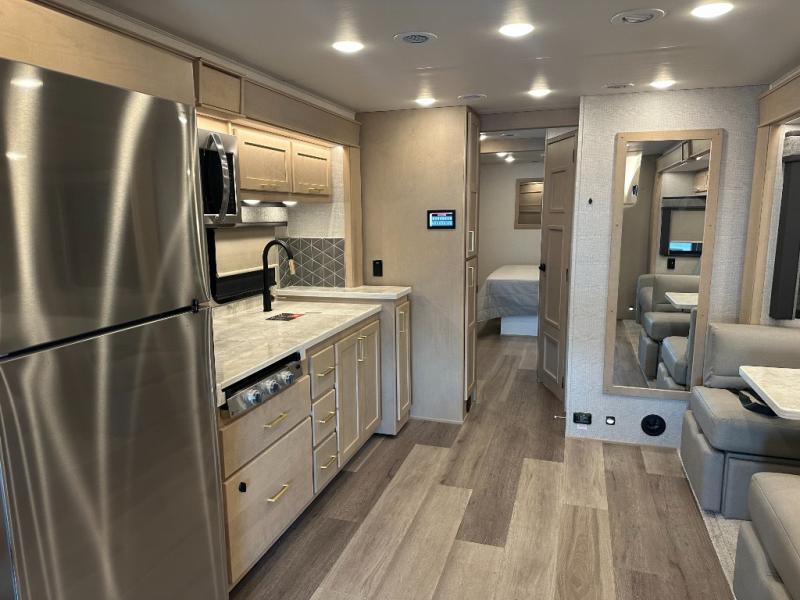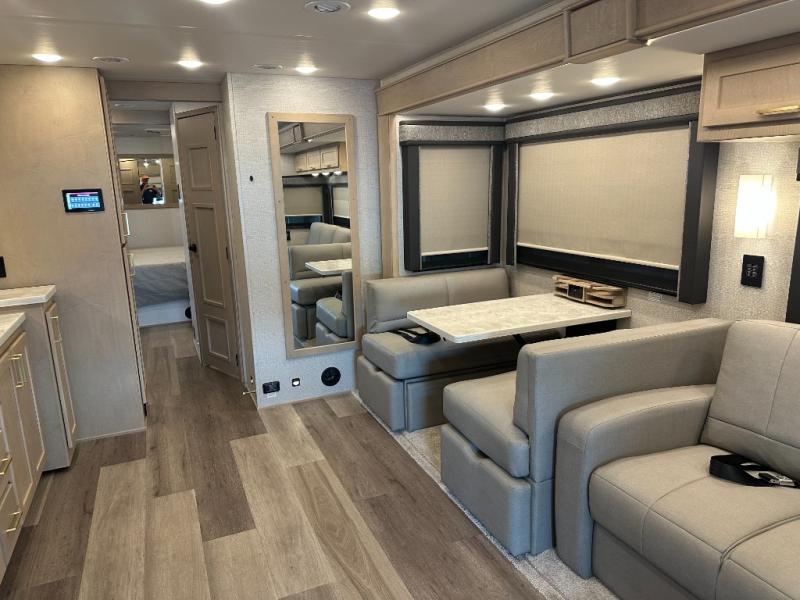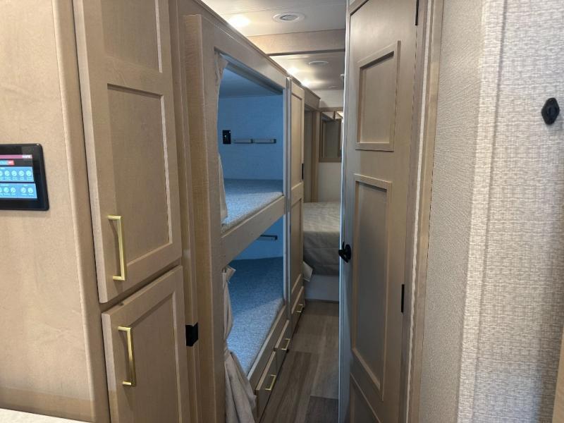 Inside, this motorhome feels like a true residential retreat. The rear private bedroom includes a 66" x 74" mini-king bed, dual closets, a dresser base, and a 32" Smart LED TV. The family-friendly layout features 30" x 76" bunk beds, a 54" x 78" bunk over the cab, and additional sleeping areas from the sofa sleeper and convertible booth dinette. The centrally located mid bath adds convenience and easy access for all travelers.
