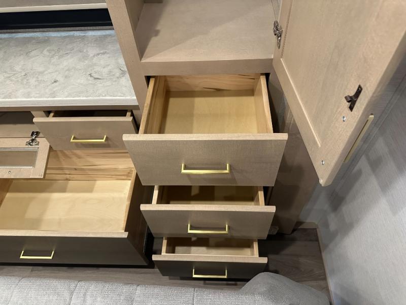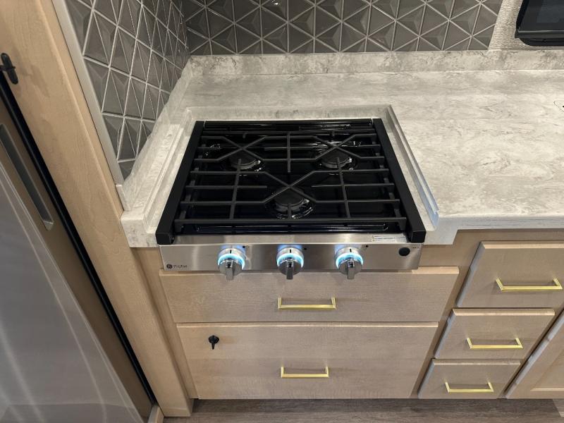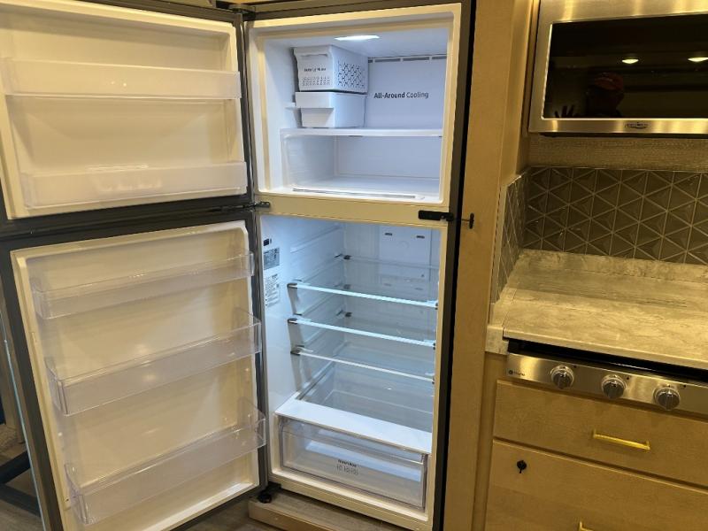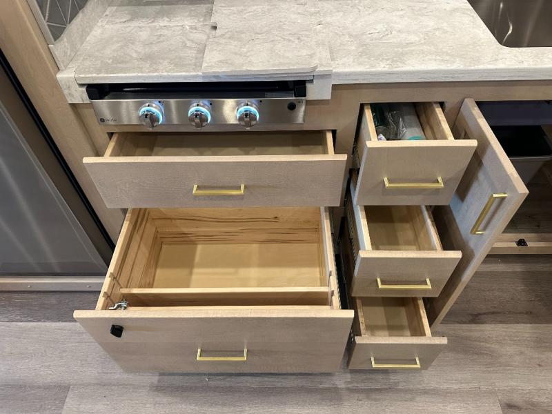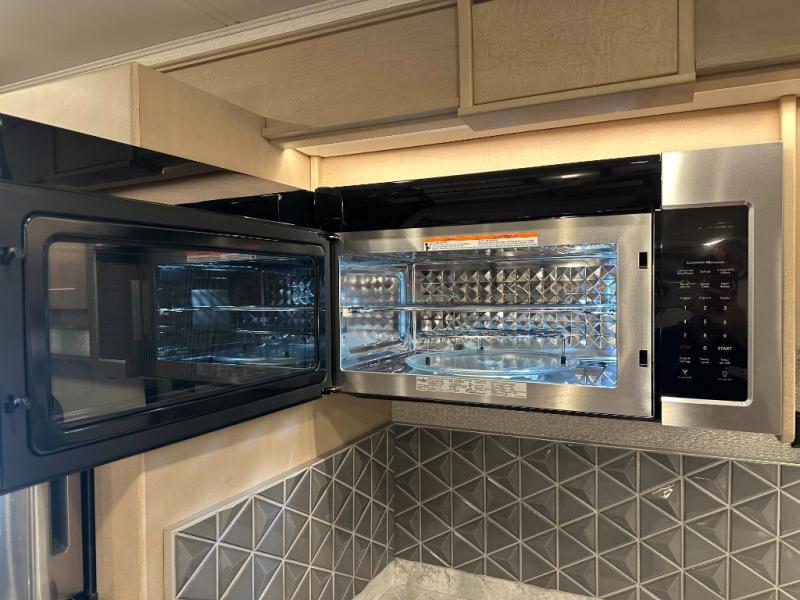 Cook like you’re at home with a three-burner cooktop, 18 cu. ft. stainless steel residential refrigerator, solid hardwood cabinetry, and polished solid-surface countertops. This kitchen is designed for families who want real meals on the road, not compromise.