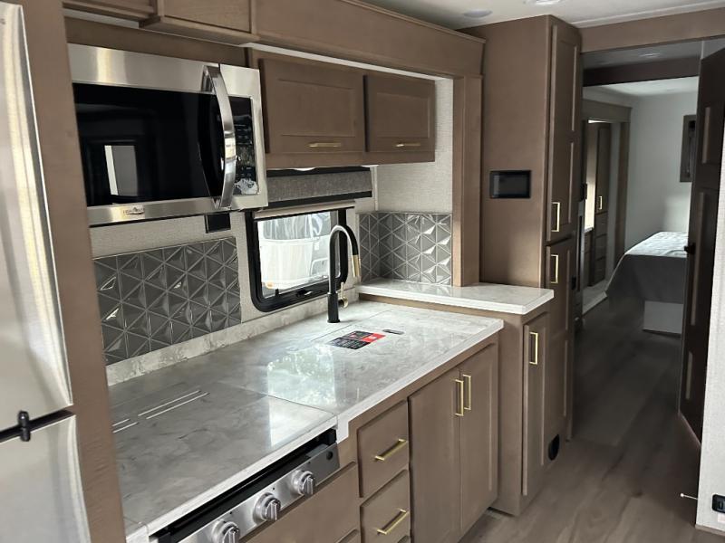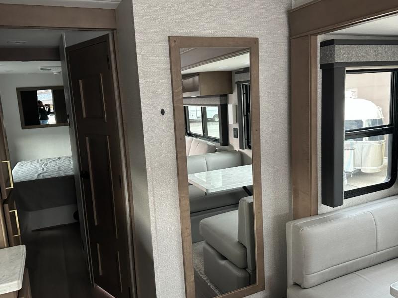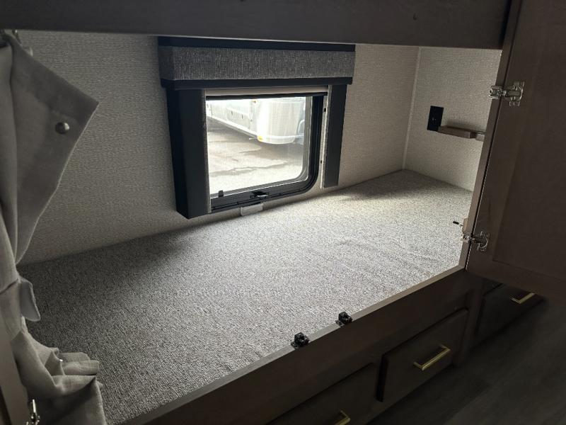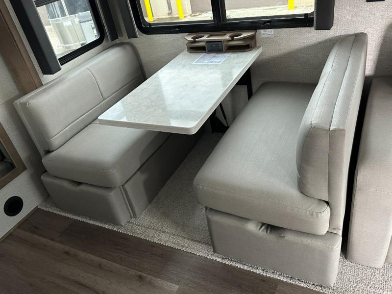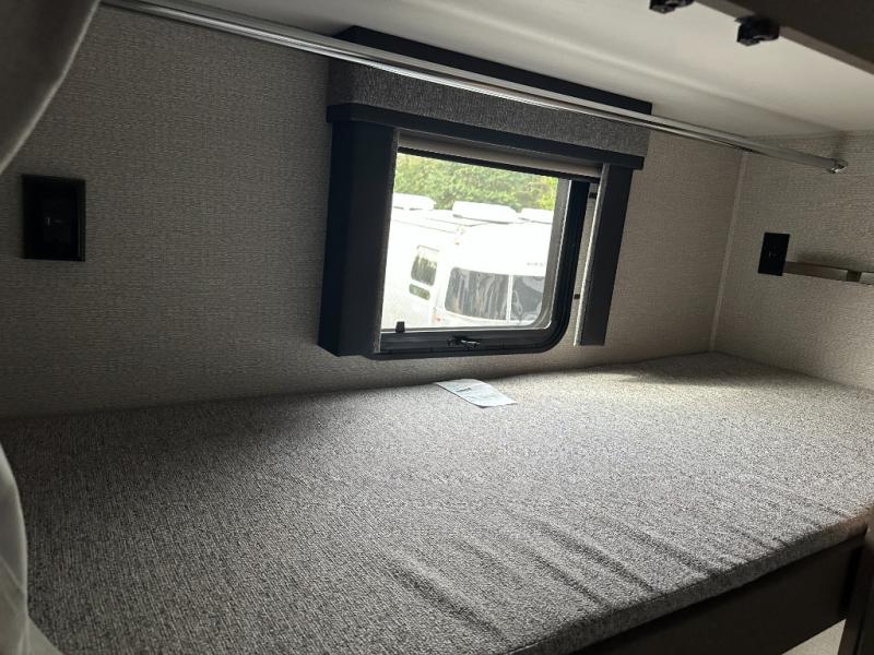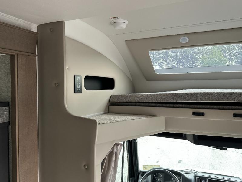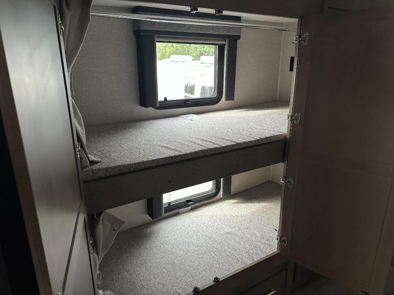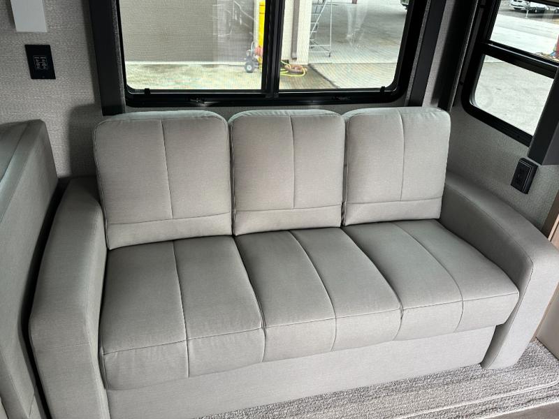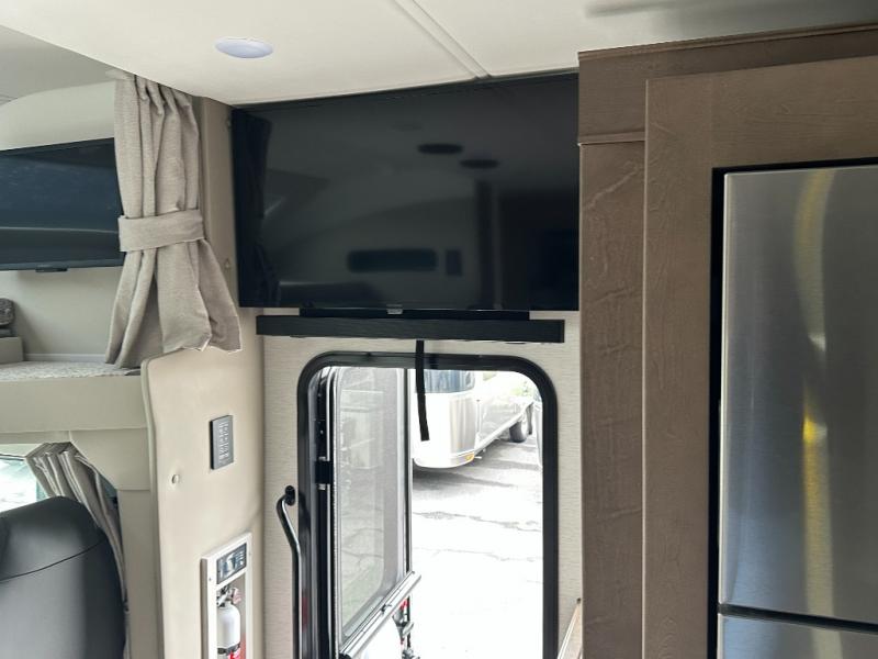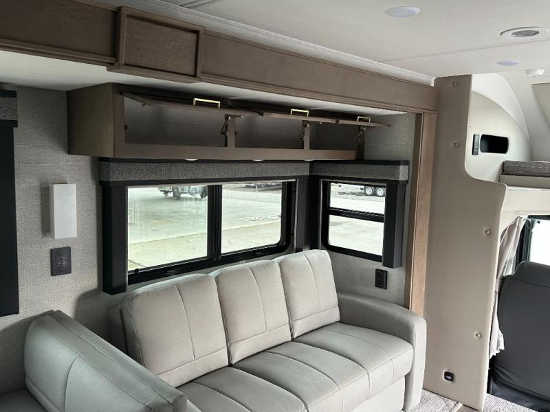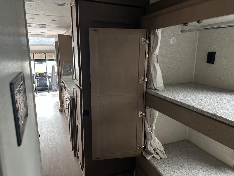 Pack your bags and load up this motorhome for a luxurious road trip! The rear private bedroom has a 66" x 74" mini-king bed to lay your head on at night, a dresser base with a 32" Smart LED TV above it, and closets on either side of it. Your kiddos or guests can sleep on the set of 30" x 76" bunk beds and the 54" x 78" bunk over cab. Or utilize the sofa sleeper and the booth dinette which convert to even more sleeping spaces. Create your best meals with the three burner cooktop and keep your perishables fresh with the 18 cu. ft. stainless steel residential refrigerator. And you will love having a mid bath for easy use!