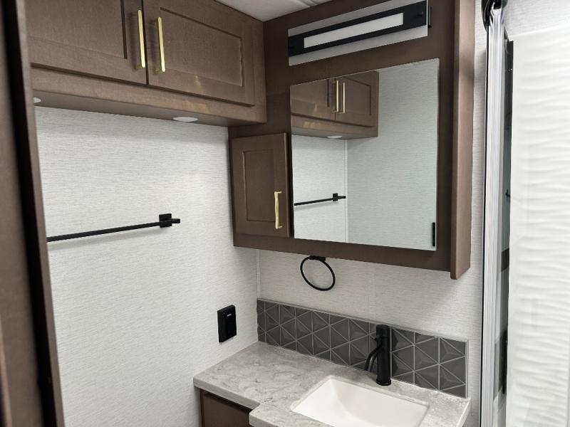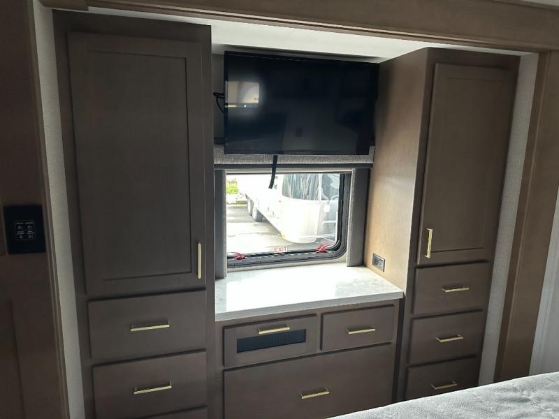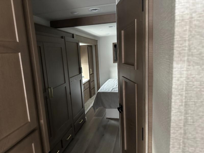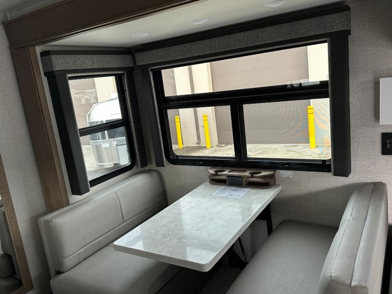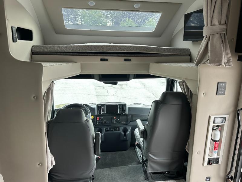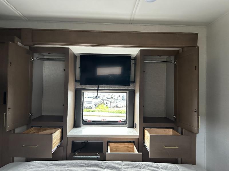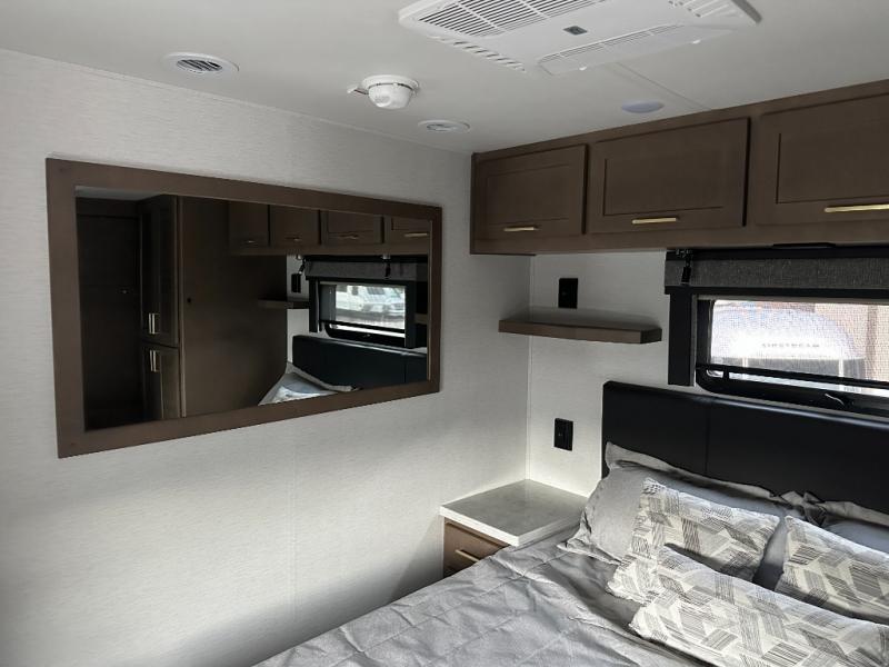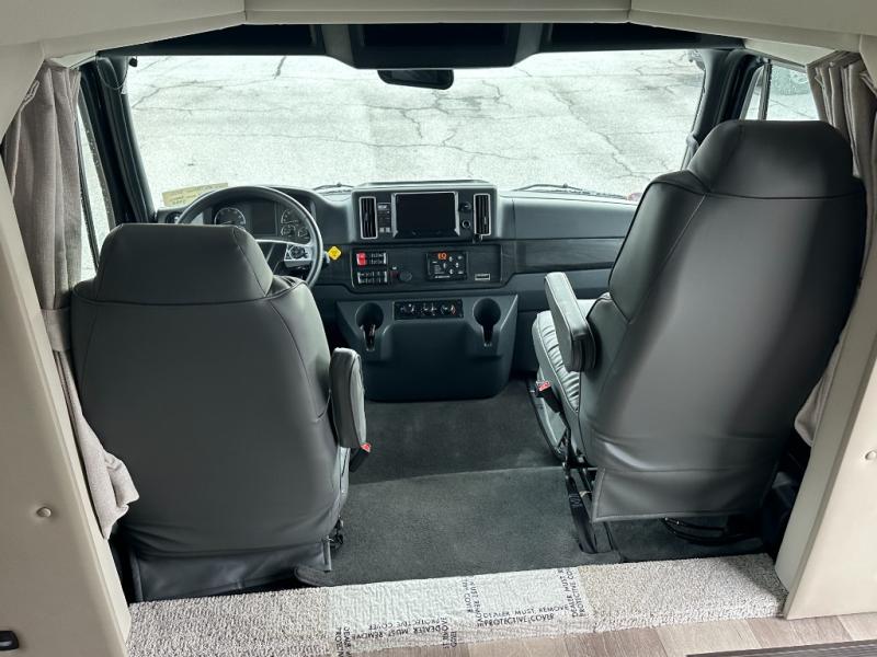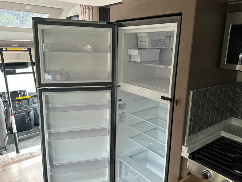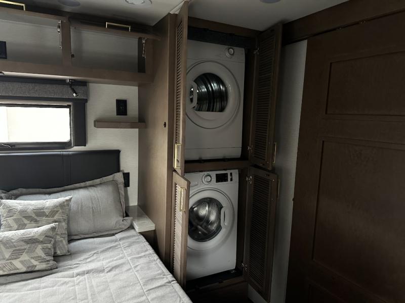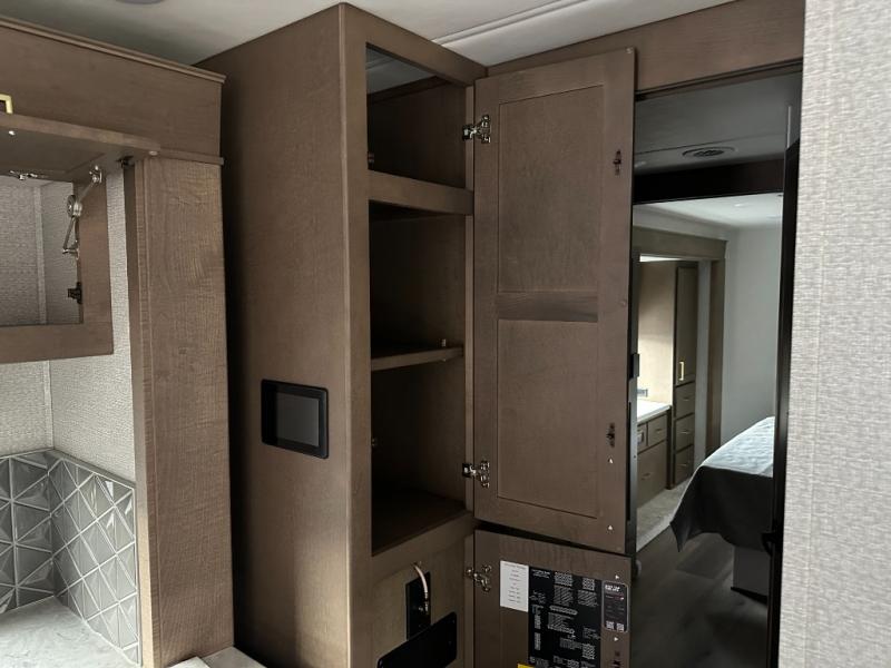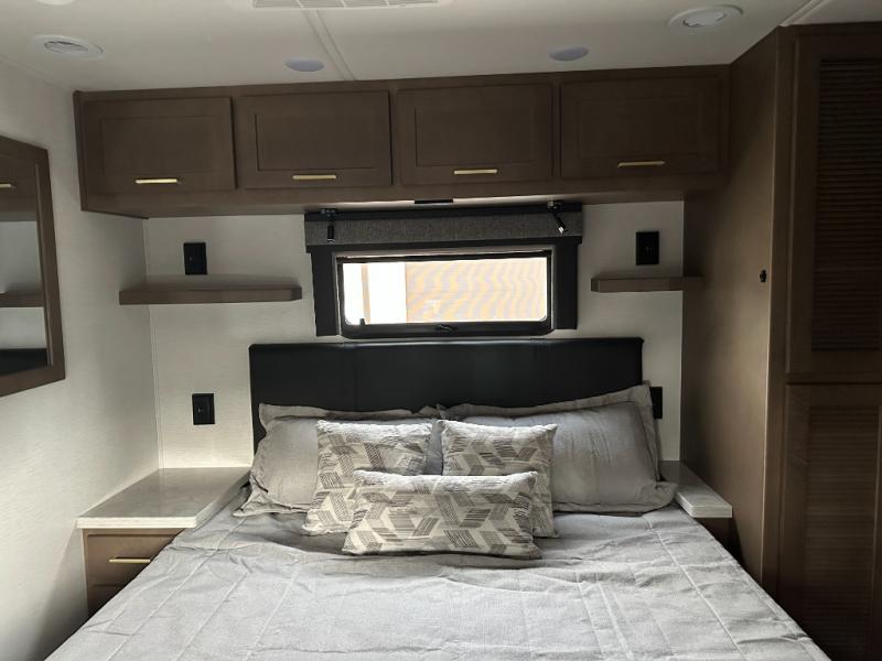 Pack your bags and load up this motorhome for a luxurious road trip! The rear private bedroom has a 66" x 74" mini-king bed to lay your head on at night, a dresser base with a 32" Smart LED TV above it, and closets on either side of it. Your kiddos or guests can sleep on the set of 30" x 76" bunk beds and the 54" x 78" bunk over cab. Or utilize the sofa sleeper and the booth dinette which convert to even more sleeping spaces. Create your best meals with the three burner cooktop and keep your perishables fresh with the 18 cu. ft. stainless steel residential refrigerator. And you will love having a mid bath for easy use!