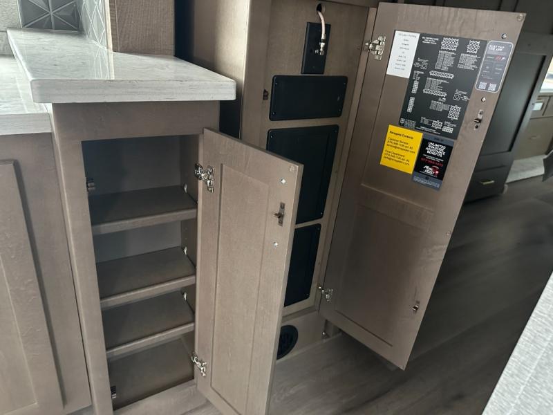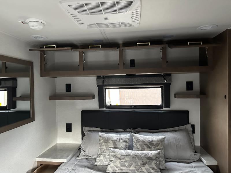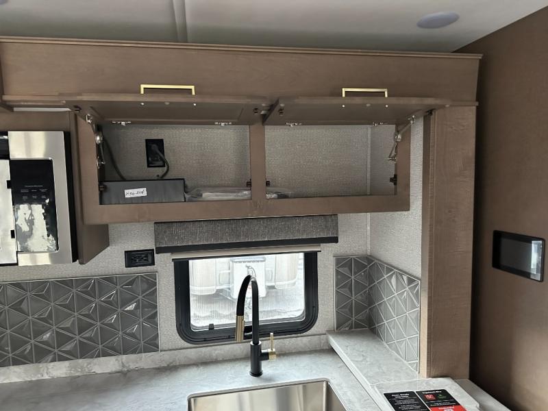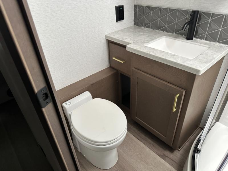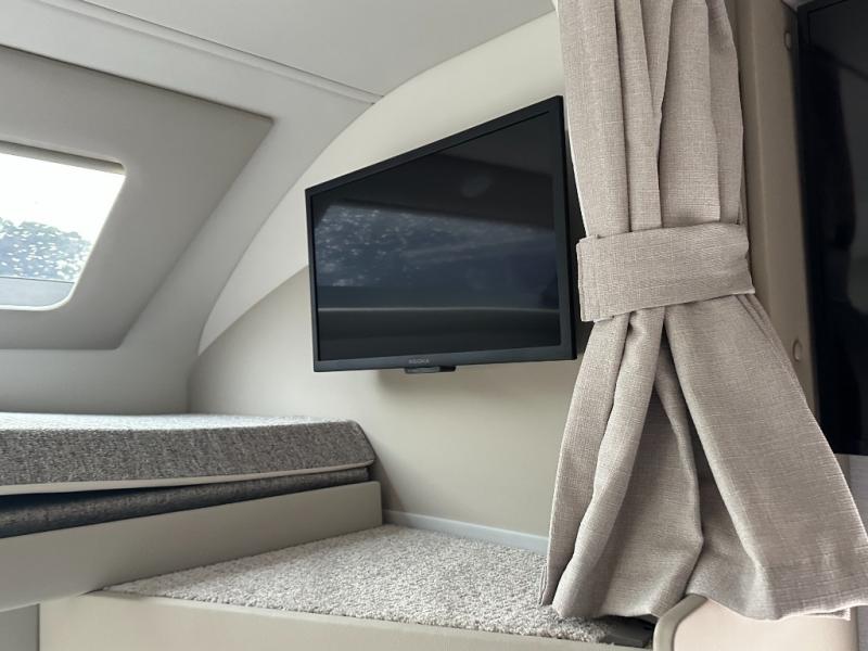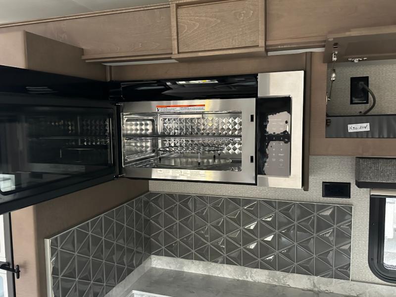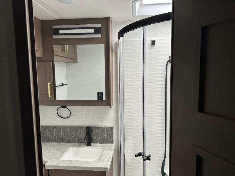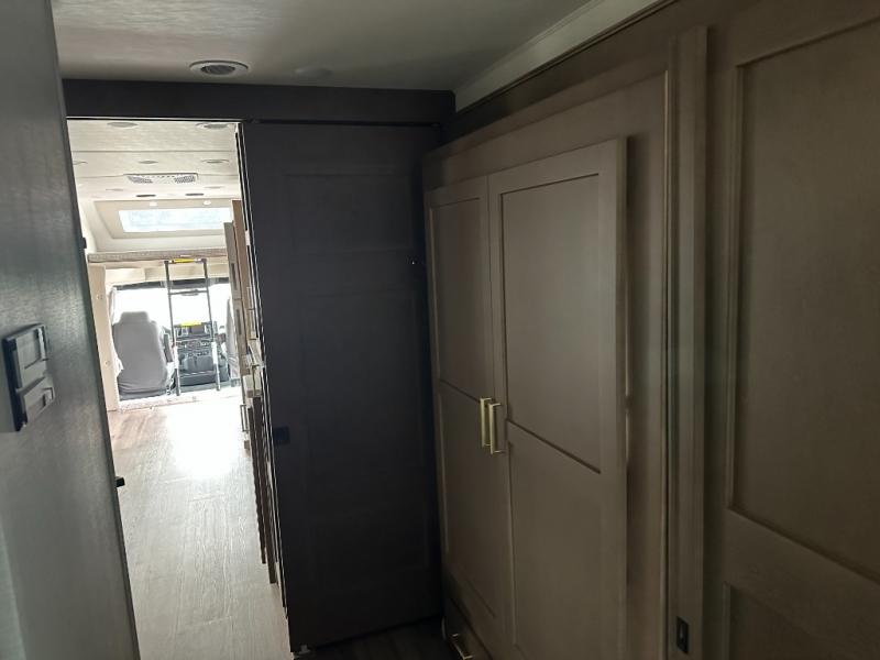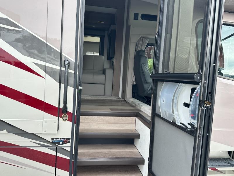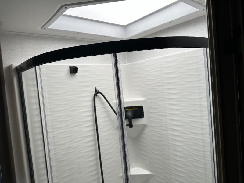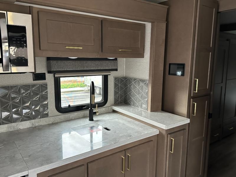 Pack your bags and load up this motorhome for a luxurious road trip! The rear private bedroom has a 66" x 74" mini-king bed to lay your head on at night, a dresser base with a 32" Smart LED TV above it, and closets on either side of it. Your kiddos or guests can sleep on the set of 30" x 76" bunk beds and the 54" x 78" bunk over cab. Or utilize the sofa sleeper and the booth dinette which convert to even more sleeping spaces. Create your best meals with the three burner cooktop and keep your perishables fresh with the 18 cu. ft. stainless steel residential refrigerator. And you will love having a mid bath for easy use!
