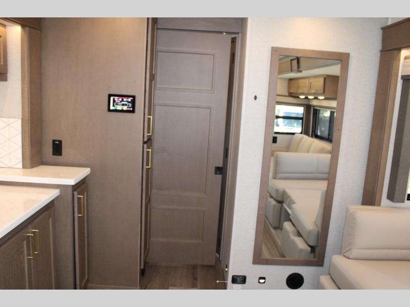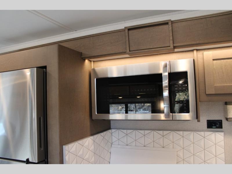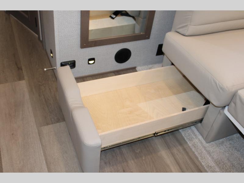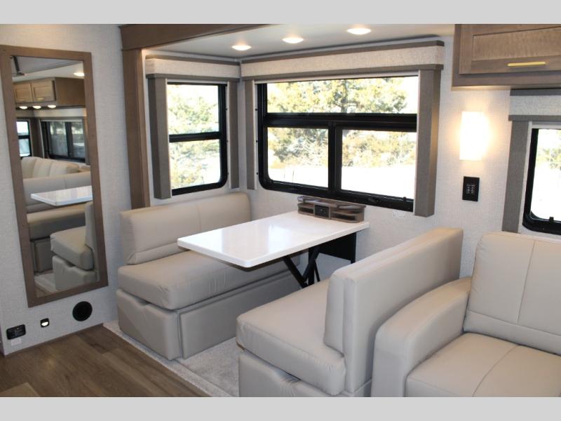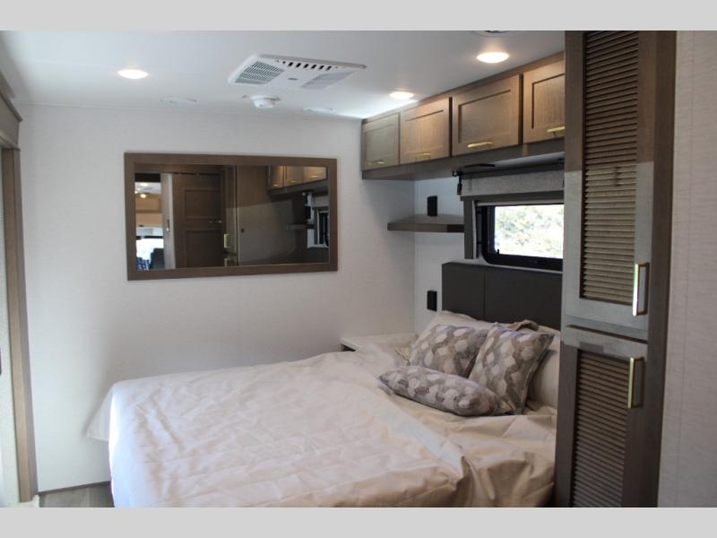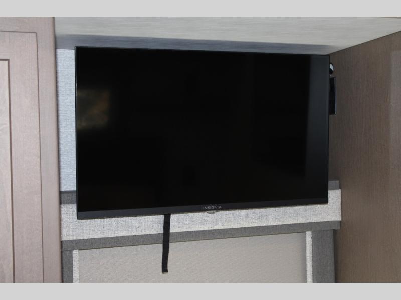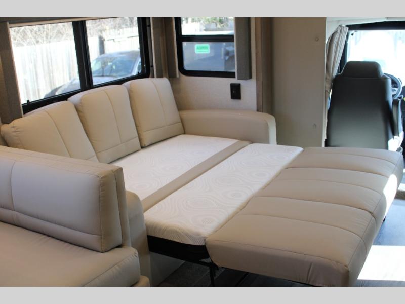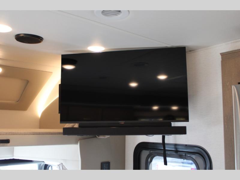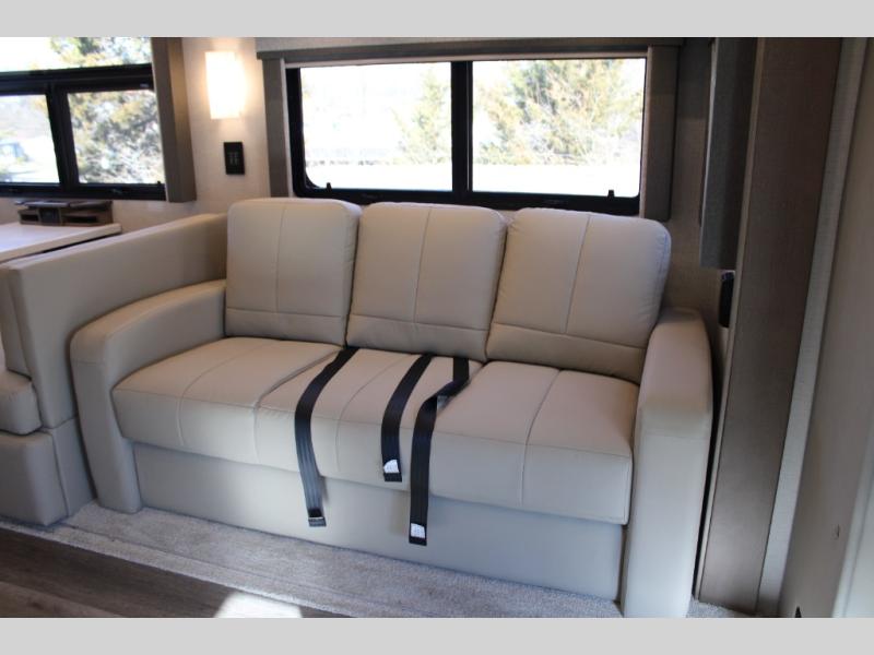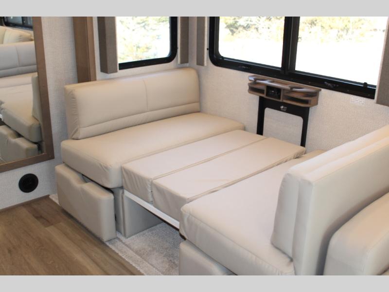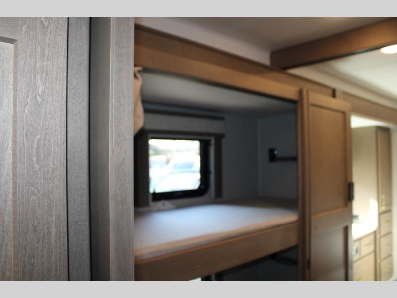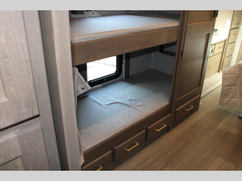 Pack your bags and load up this motorhome for a luxurious road trip! The rear private bedroom has a 66" x 74" mini-king bed to lay your head on at night, a dresser base with a 32" Smart LED TV above it, and closets on either side of it. Your kiddos or guests can sleep on the set of 30" x 76" bunk beds and the 54" x 78" bunk over cab. Or utilize the sofa sleeper and the booth dinette which convert to even more sleeping spaces. Create your best meals with the three burner cooktop and keep your perishables fresh with the 18 cu. ft. stainless steel residential refrigerator. And you will love having a mid bath for easy use!