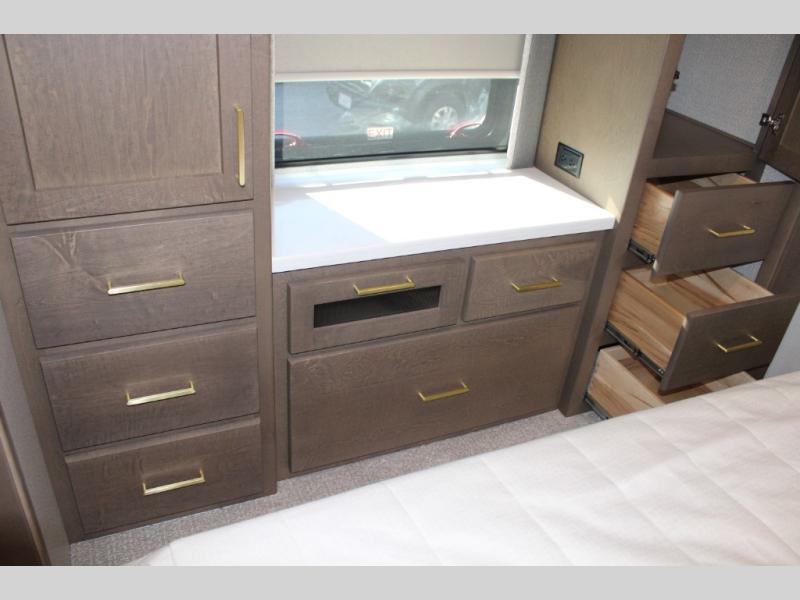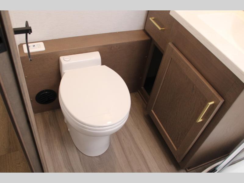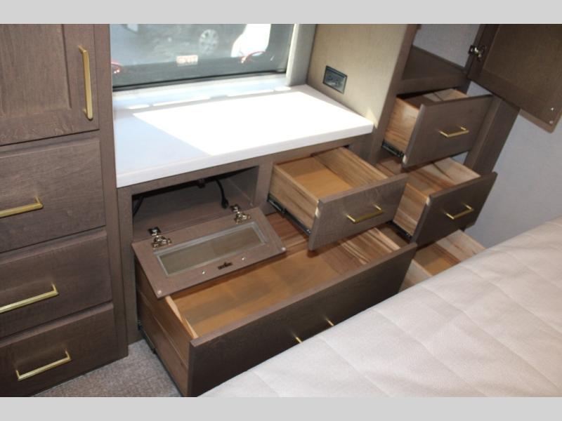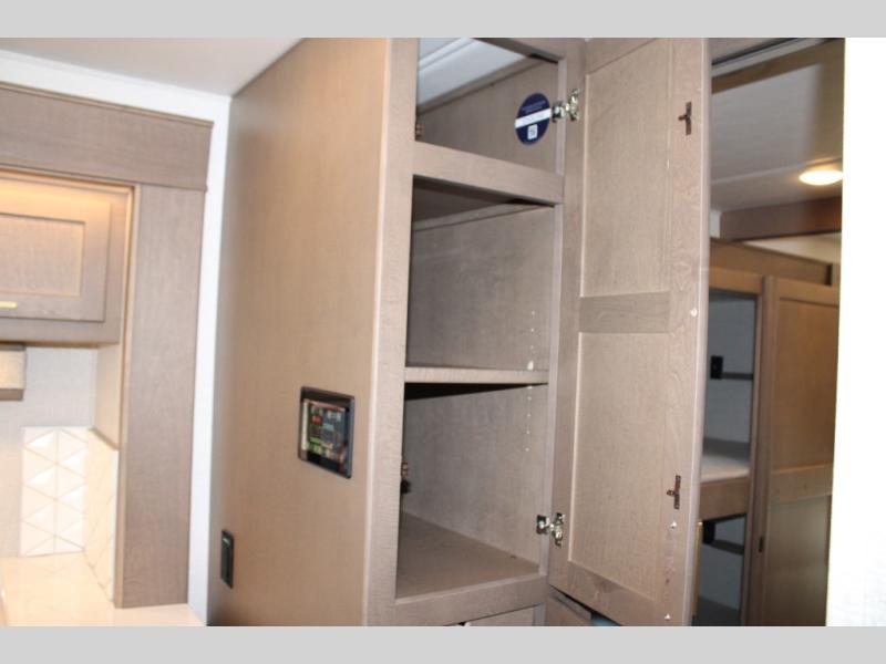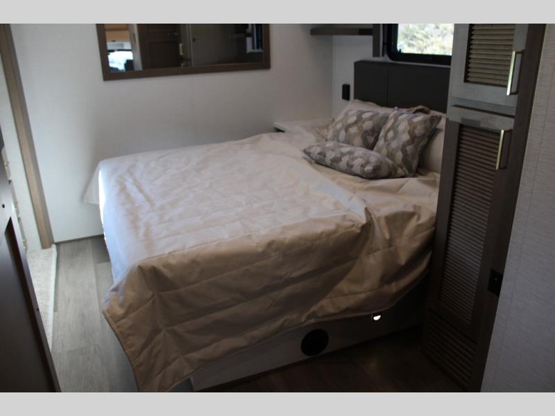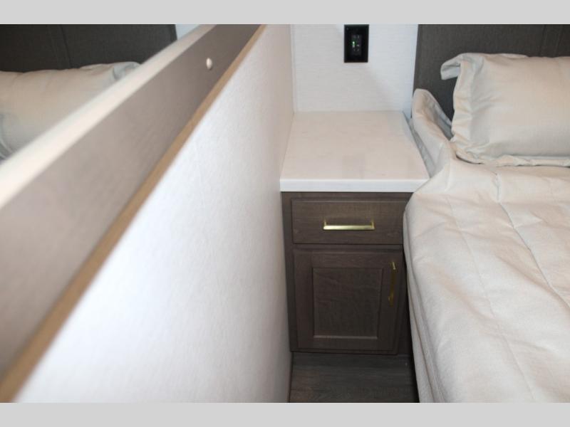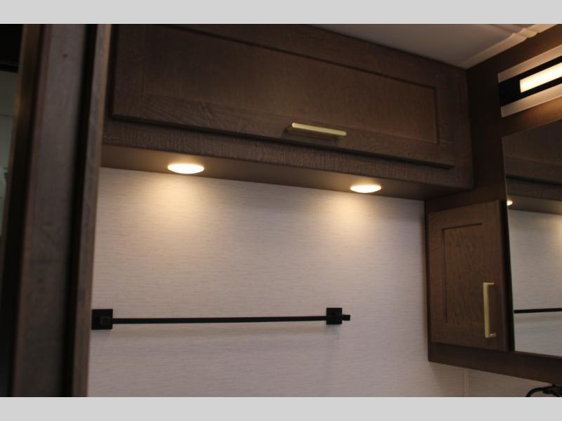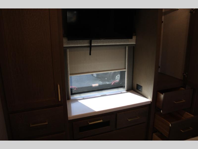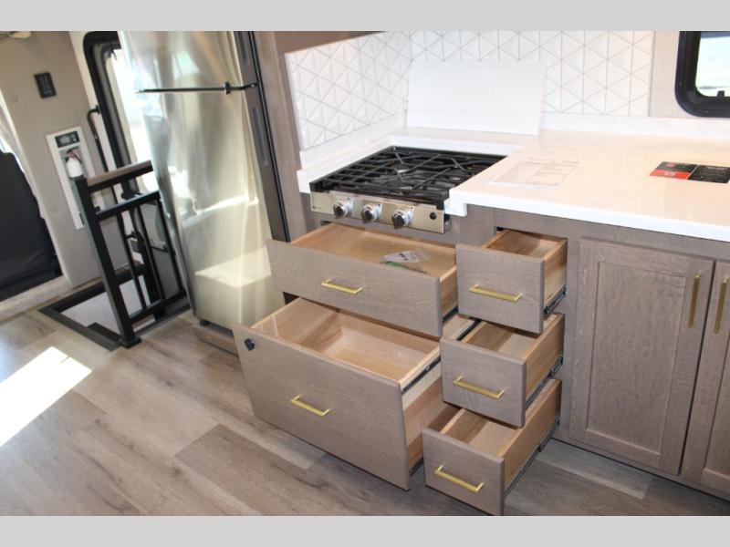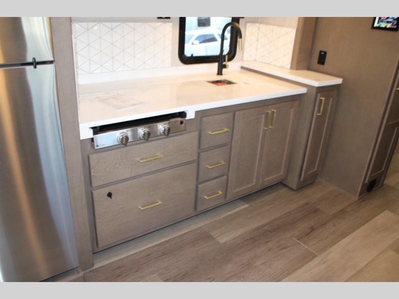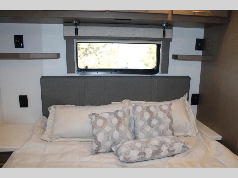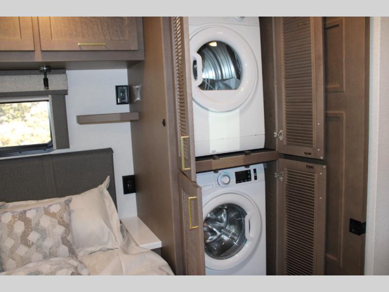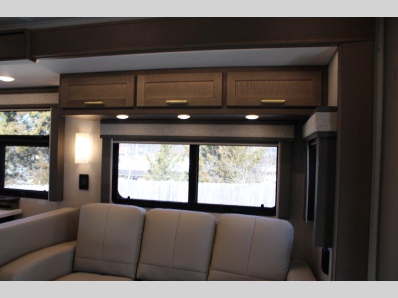 Pack your bags and load up this motorhome for a luxurious road trip! The rear private bedroom has a 66" x 74" mini-king bed to lay your head on at night, a dresser base with a 32" Smart LED TV above it, and closets on either side of it. Your kiddos or guests can sleep on the set of 30" x 76" bunk beds and the 54" x 78" bunk over cab. Or utilize the sofa sleeper and the booth dinette which convert to even more sleeping spaces. Create your best meals with the three burner cooktop and keep your perishables fresh with the 18 cu. ft. stainless steel residential refrigerator. And you will love having a mid bath for easy use!