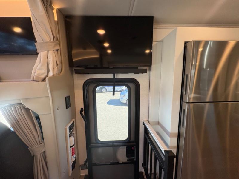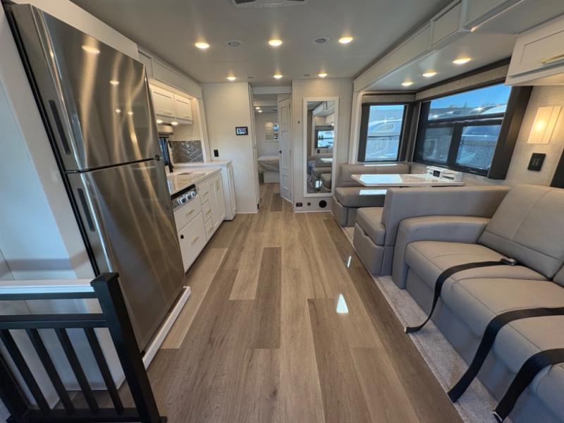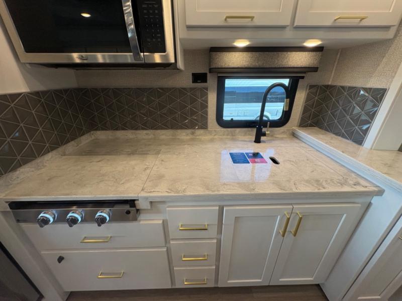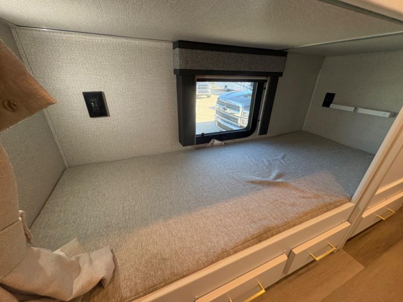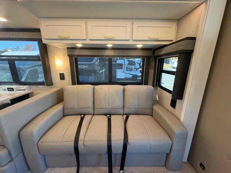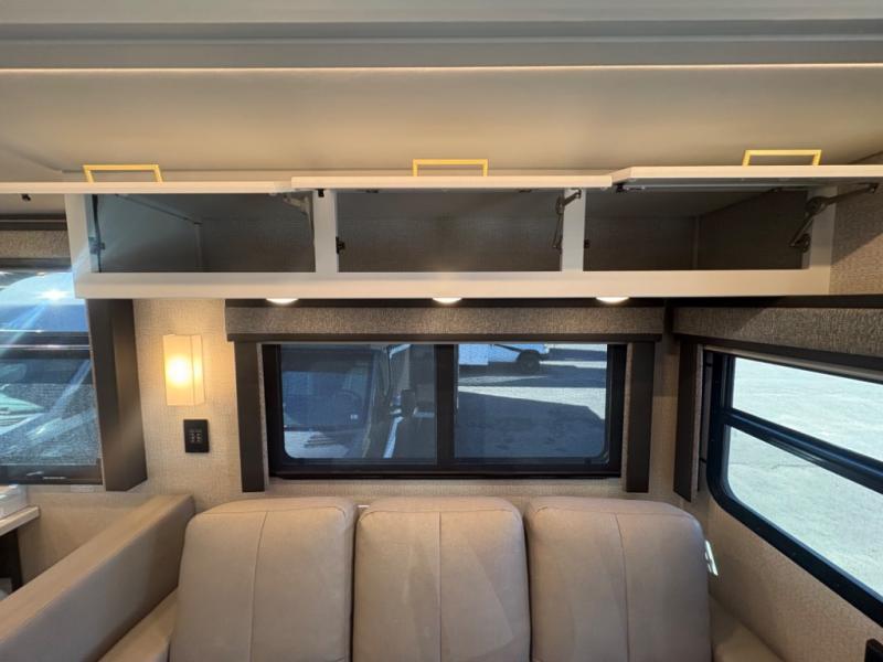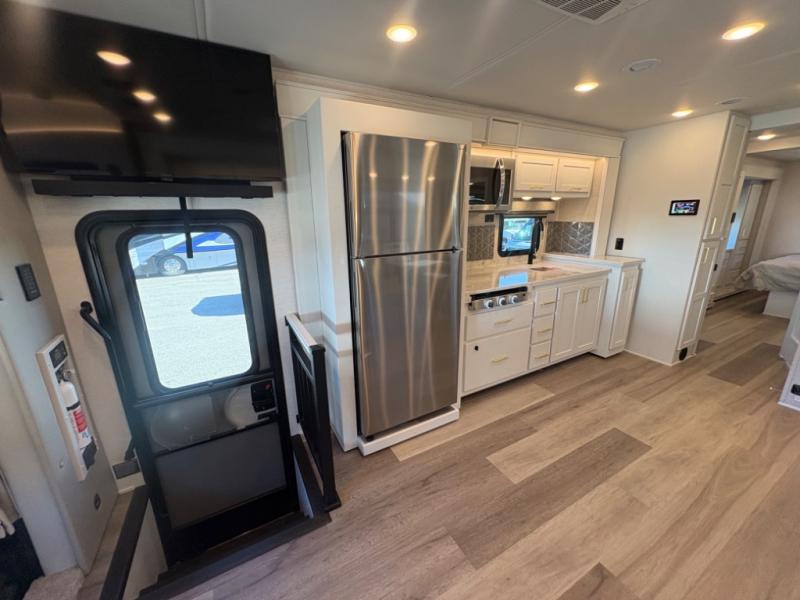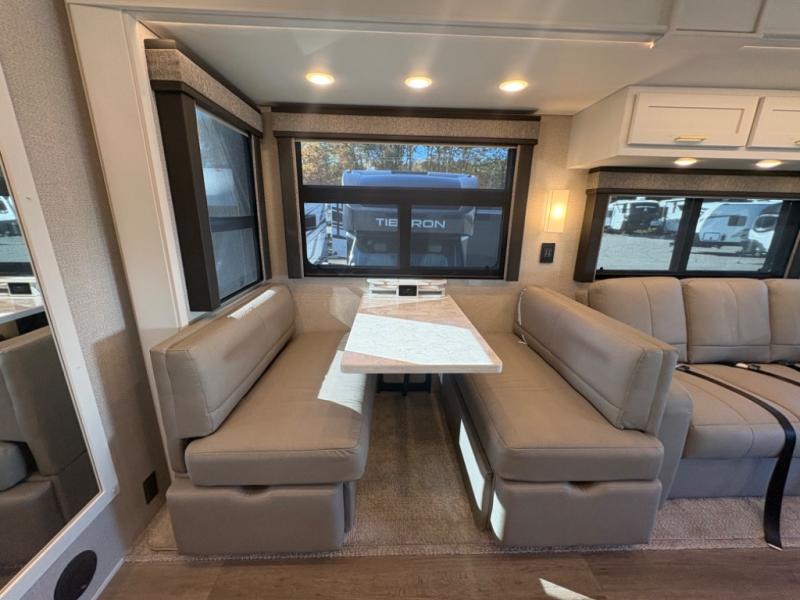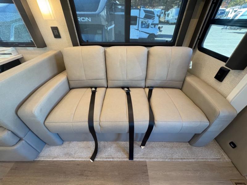 Pack your bags and load up this motorhome for a luxurious road trip! The rear private bedroom has a 66" x 74" mini-king bed to lay your head on at night, a dresser base with a 32" Smart LED TV above it, and closets on either side of it. Your kiddos or guests can sleep on the set of 30" x 76" bunk beds and the 54" x 78" bunk over cab. Or utilize the sofa sleeper and the booth dinette which convert to even more sleeping spaces. Create your best meals with the three burner cooktop and keep your perishables fresh with the 18 cu. ft. stainless steel residential refrigerator. And you will love having a mid bath for easy use!