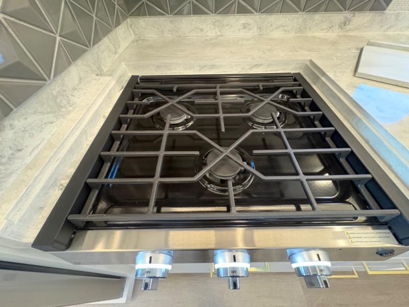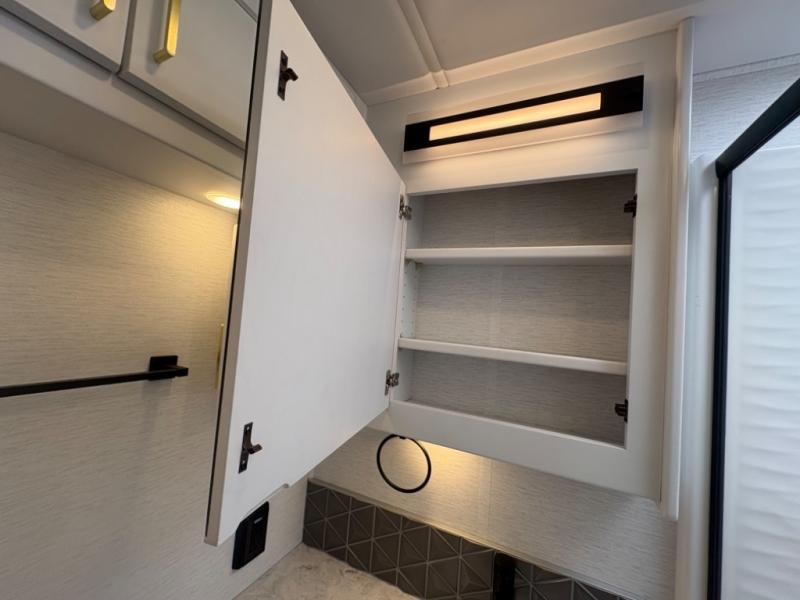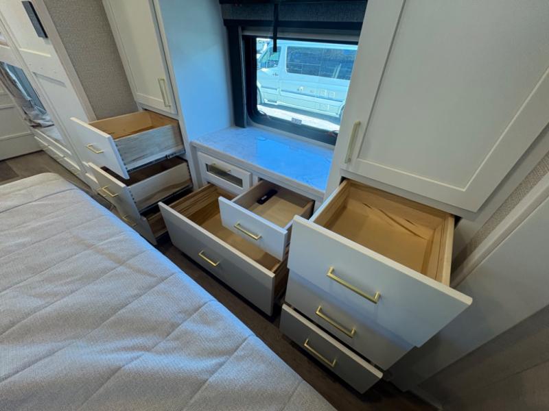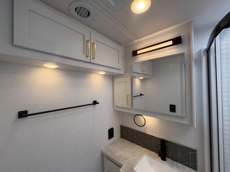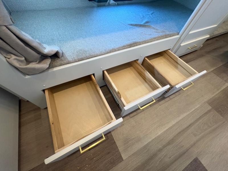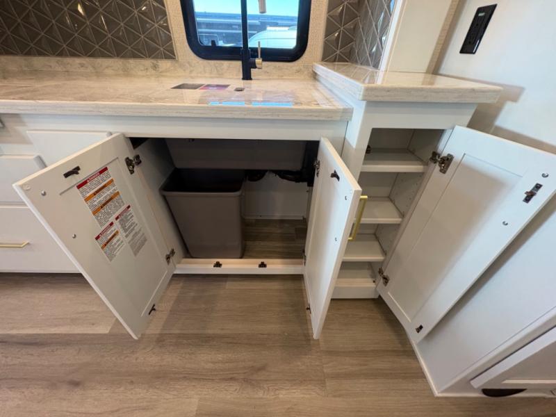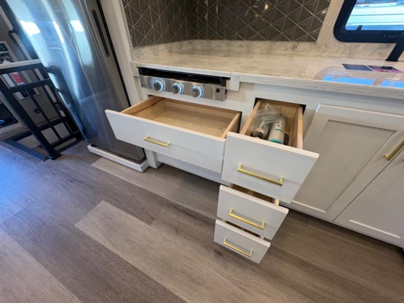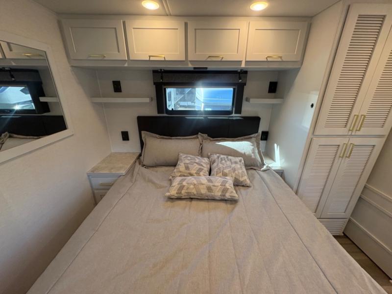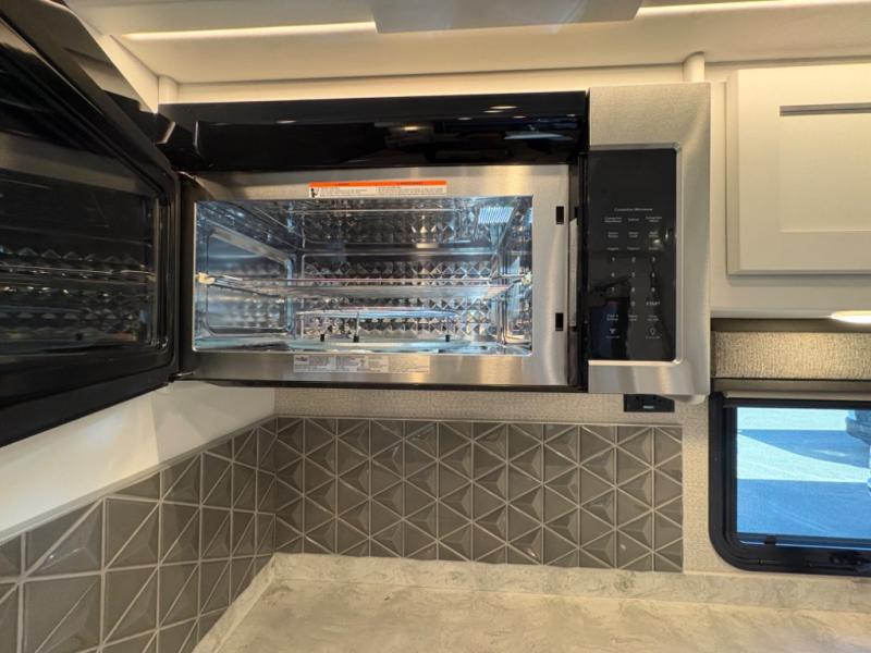 Pack your bags and load up this motorhome for a luxurious road trip! The rear private bedroom has a 66" x 74" mini-king bed to lay your head on at night, a dresser base with a 32" Smart LED TV above it, and closets on either side of it. Your kiddos or guests can sleep on the set of 30" x 76" bunk beds and the 54" x 78" bunk over cab. Or utilize the sofa sleeper and the booth dinette which convert to even more sleeping spaces. Create your best meals with the three burner cooktop and keep your perishables fresh with the 18 cu. ft. stainless steel residential refrigerator. And you will love having a mid bath for easy use!