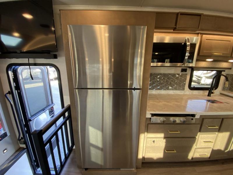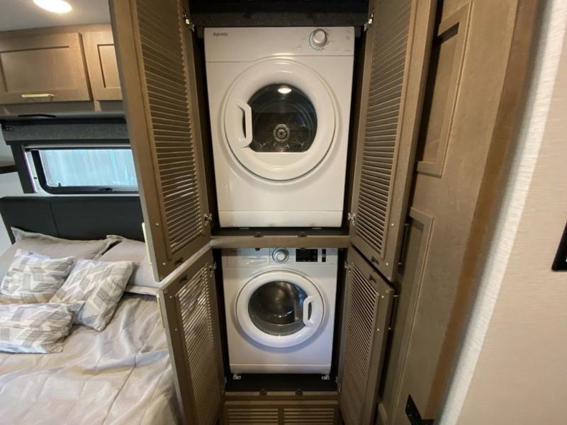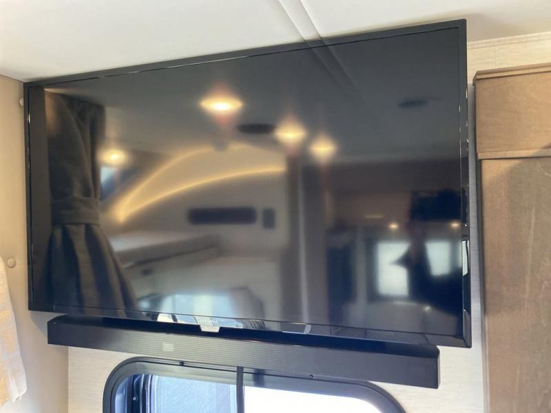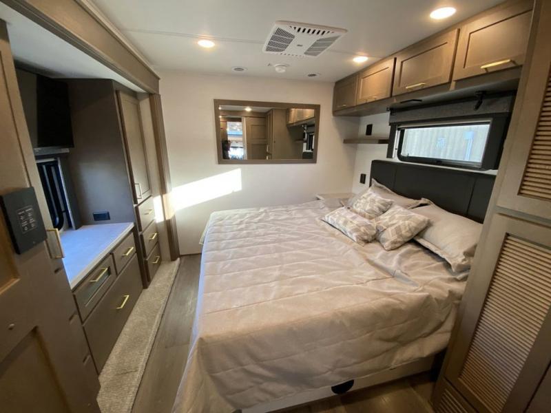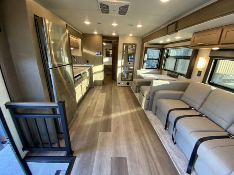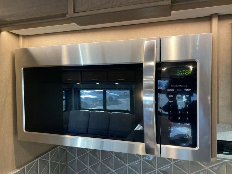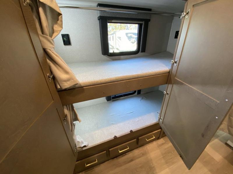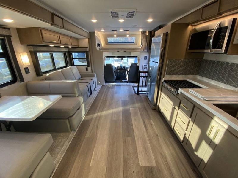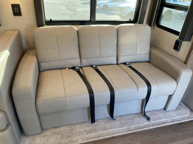 Pack your bags and load up this motorhome for a luxurious road trip! The rear private bedroom has a 66" x 74" mini-king bed to lay your head on at night, a dresser base with a 32" Smart LED TV above it, and closets on either side of it. Your kiddos or guests can sleep on the set of 30" x 76" bunk beds and the 54" x 78" bunk over cab. Or utilize the sofa sleeper and the booth dinette which convert to even more sleeping spaces. Create your best meals with the three burner cooktop and keep your perishables fresh with the 18 cu. ft. stainless steel residential refrigerator. And you will love having a mid bath for easy use!