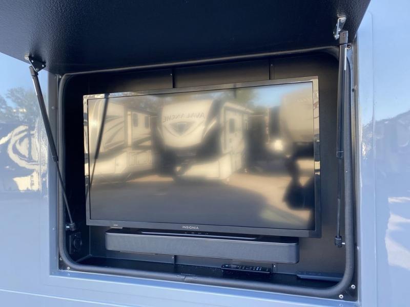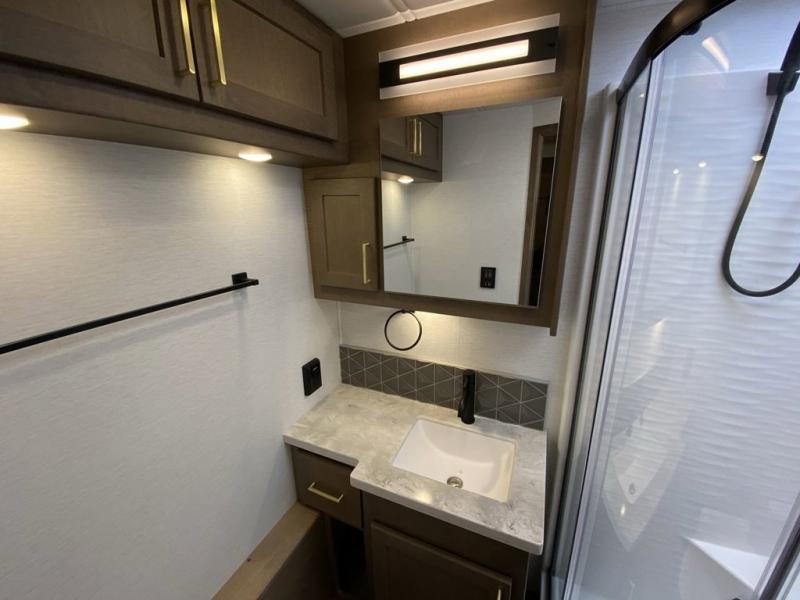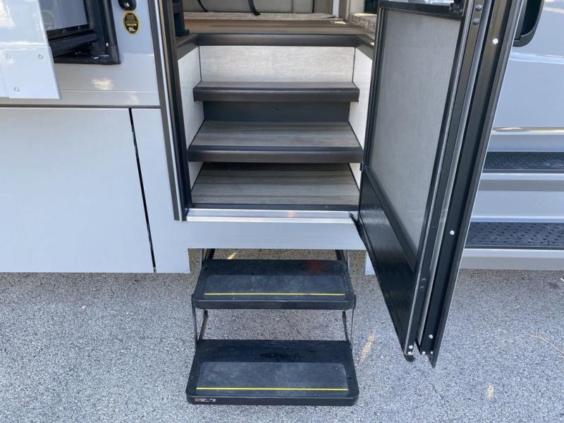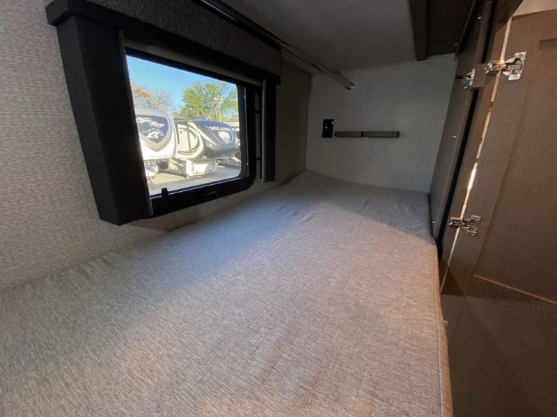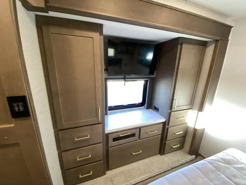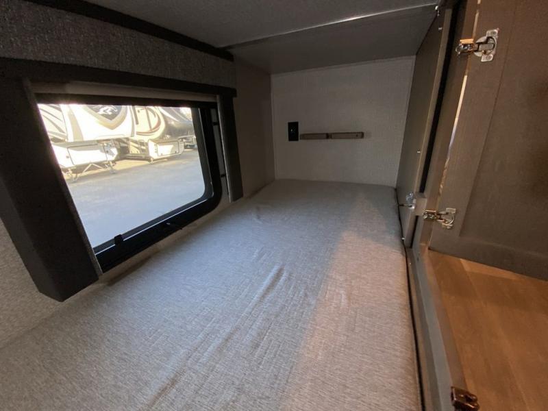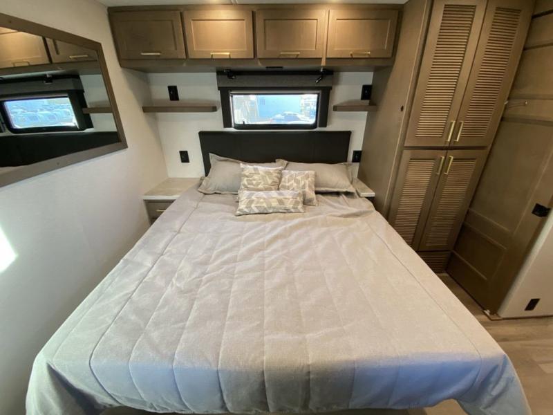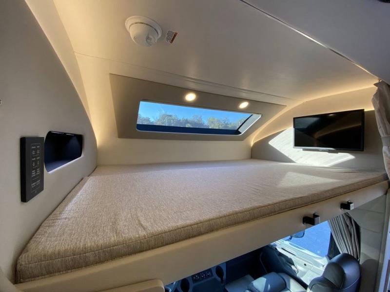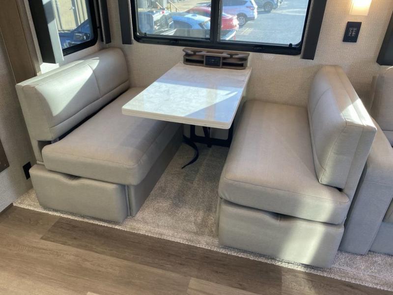 Pack your bags and load up this motorhome for a luxurious road trip! The rear private bedroom has a 66" x 74" mini-king bed to lay your head on at night, a dresser base with a 32" Smart LED TV above it, and closets on either side of it. Your kiddos or guests can sleep on the set of 30" x 76" bunk beds and the 54" x 78" bunk over cab. Or utilize the sofa sleeper and the booth dinette which convert to even more sleeping spaces. Create your best meals with the three burner cooktop and keep your perishables fresh with the 18 cu. ft. stainless steel residential refrigerator. And you will love having a mid bath for easy use!