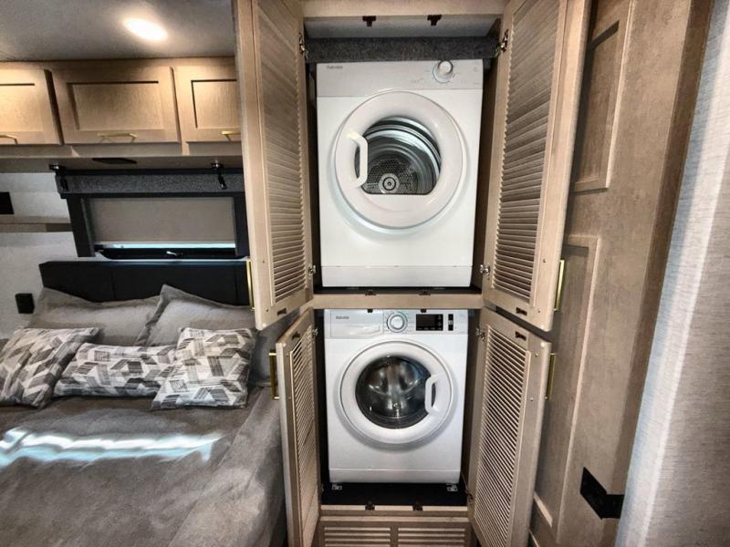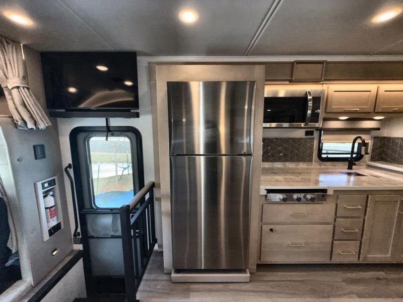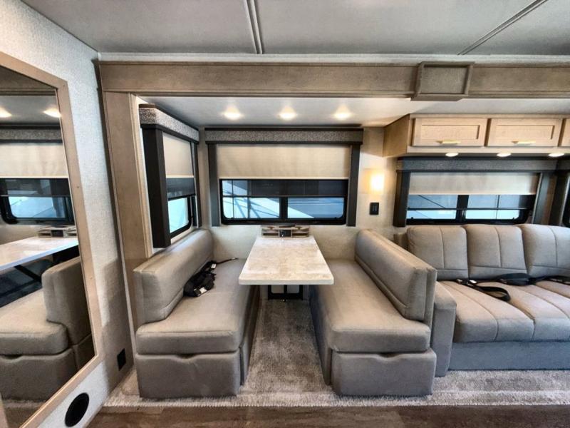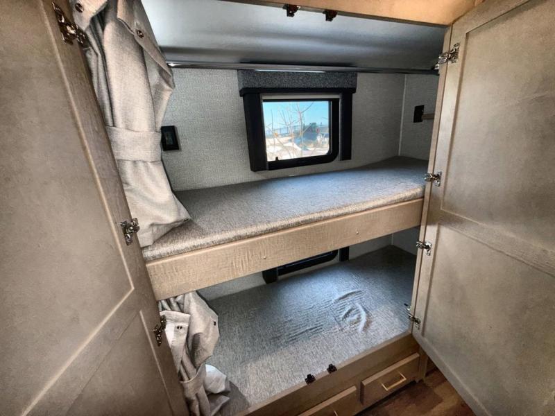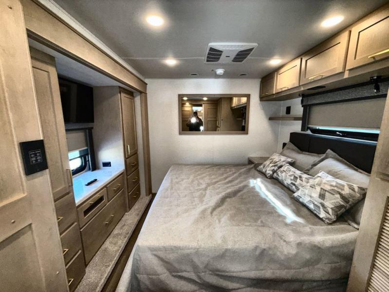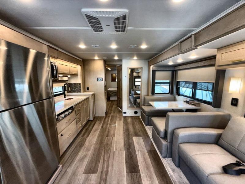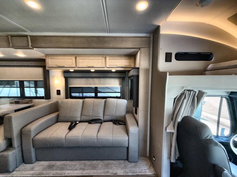 Pack your bags and load up this motorhome for a luxurious road trip! The rear private bedroom has a 66" x 74" mini-king bed to lay your head on at night, a dresser base with a 32" Smart LED TV above it, and closets on either side of it. Your kiddos or guests can sleep on the set of 30" x 76" bunk beds and the 54" x 78" bunk over cab. Or utilize the sofa sleeper and the booth dinette which convert to even more sleeping spaces. Create your best meals with the three burner cooktop and keep your perishables fresh with the 18 cu. ft. stainless steel residential refrigerator. And you will love having a mid bath for easy use!