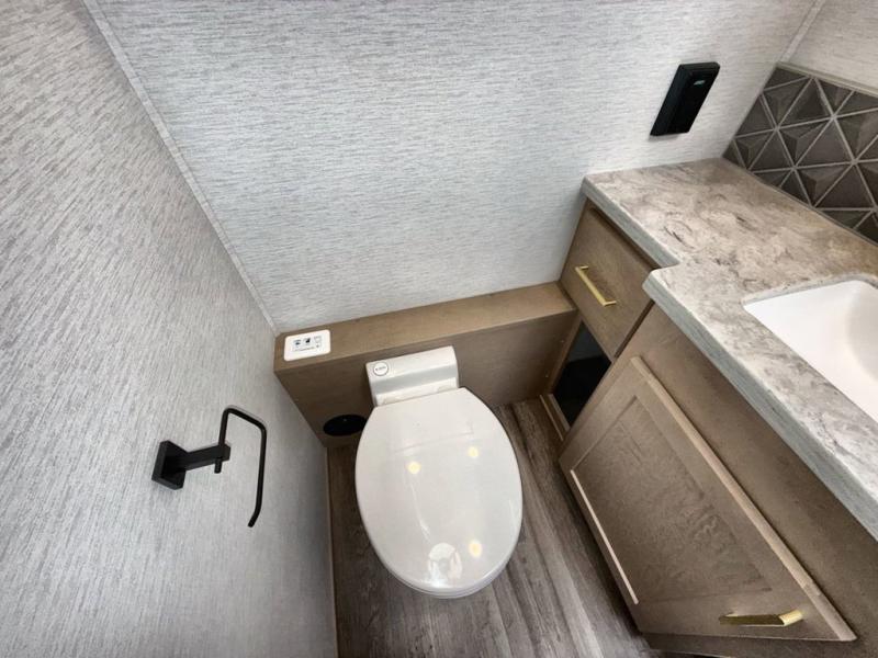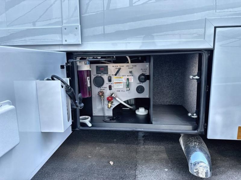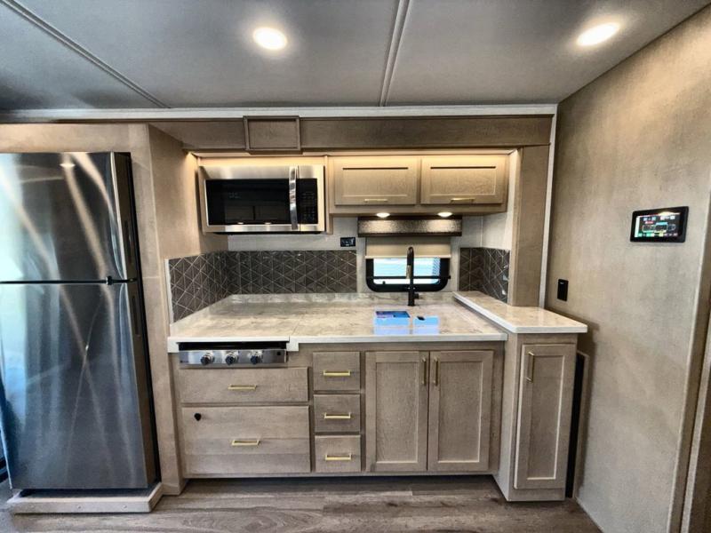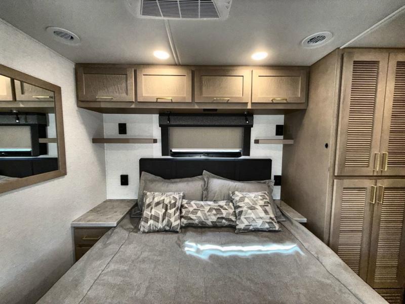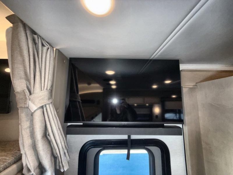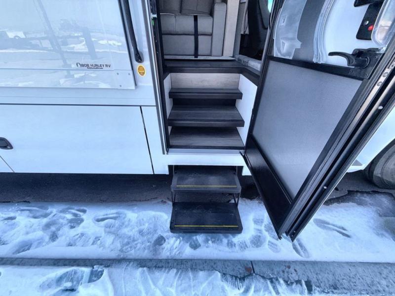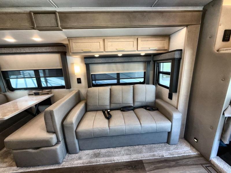 Pack your bags and load up this motorhome for a luxurious road trip! The rear private bedroom has a 66" x 74" mini-king bed to lay your head on at night, a dresser base with a 32" Smart LED TV above it, and closets on either side of it. Your kiddos or guests can sleep on the set of 30" x 76" bunk beds and the 54" x 78" bunk over cab. Or utilize the sofa sleeper and the booth dinette which convert to even more sleeping spaces. Create your best meals with the three burner cooktop and keep your perishables fresh with the 18 cu. ft. stainless steel residential refrigerator. And you will love having a mid bath for easy use!